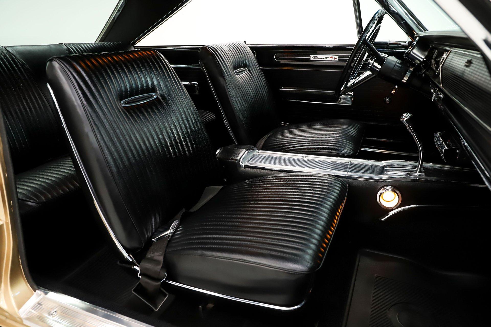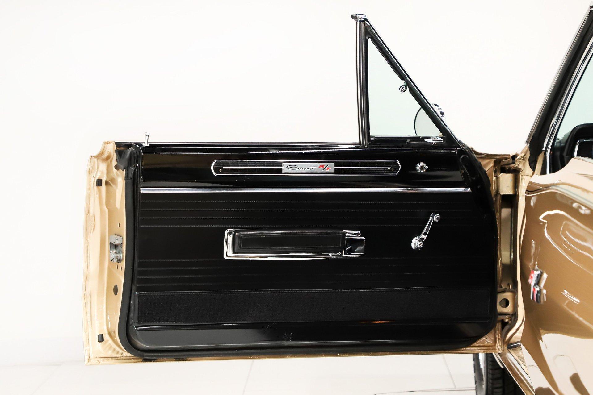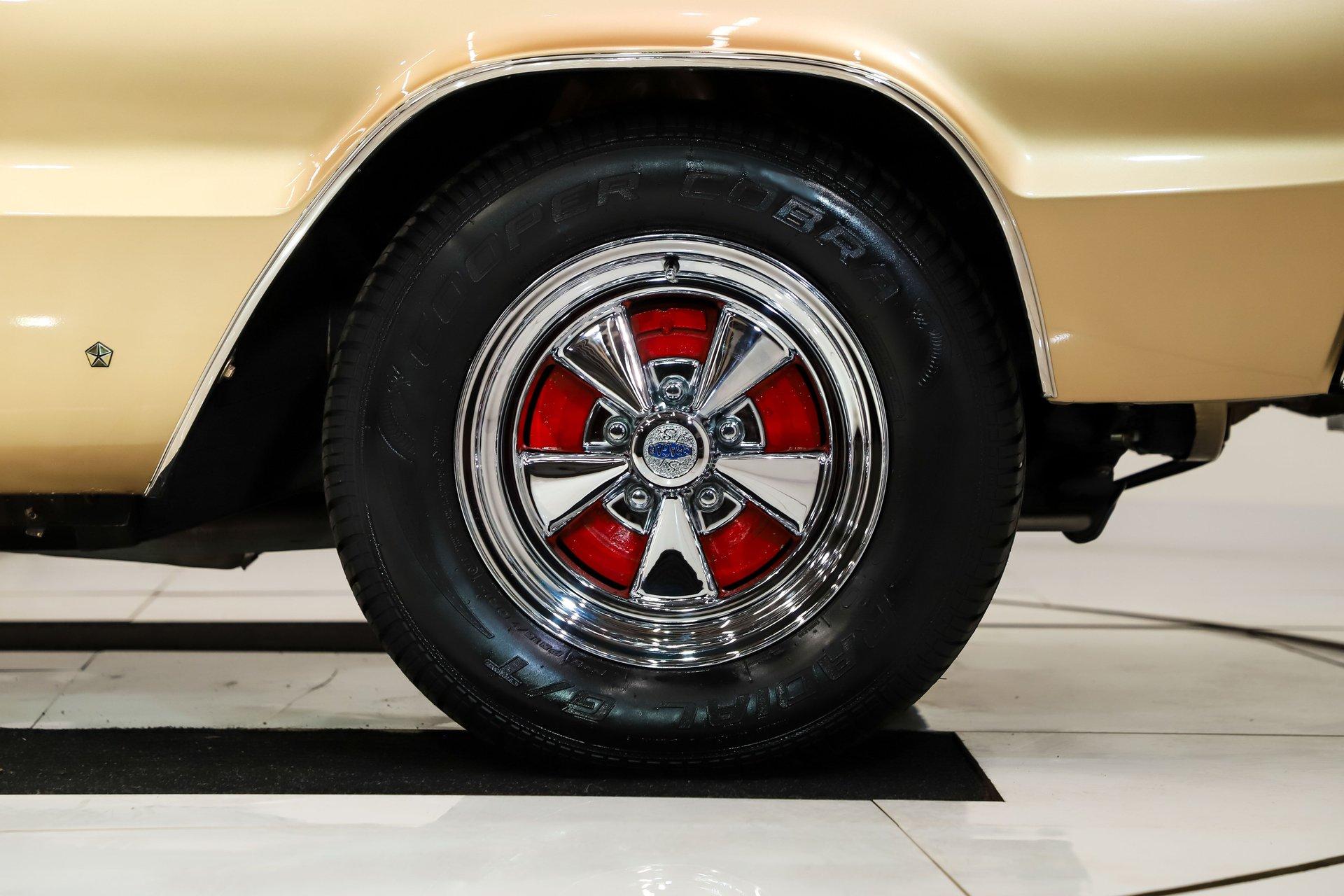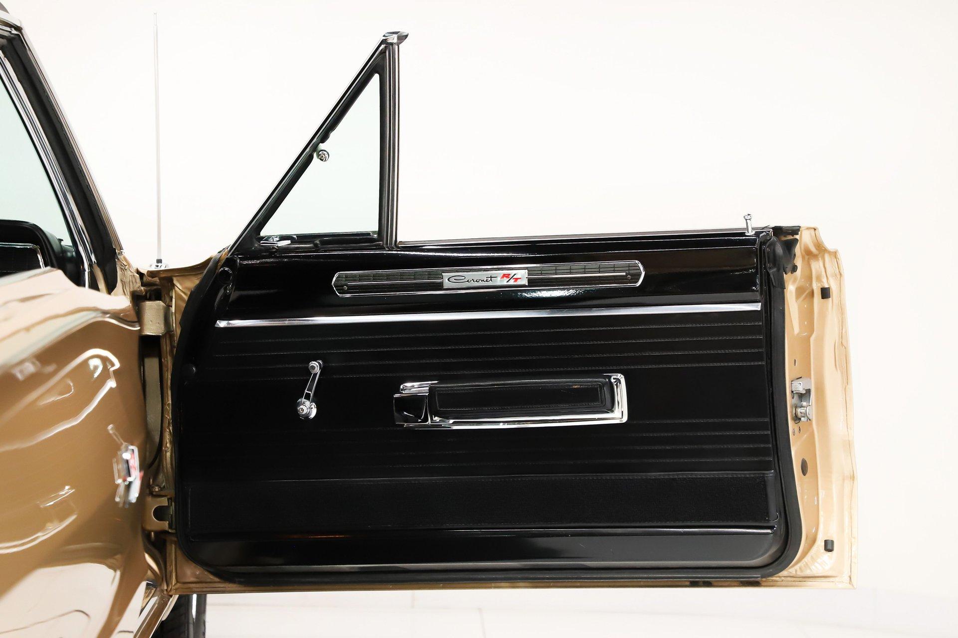 EXTERIOR: This Dodge Coronet R/T has a bold, masculine body style with fit and finish that is truly outstanding. The body is laser straight from front to back, and the panels align with the kind of precision you'd expect from a new car. The R/T hood louvers add just the right touch of muscle car attitude, perfectly complementing the car's aggressive lines. Repainted in its original Spanish Gold, the metallic finish is laid out evenly with exceptional depth and clarity. The clear coat has been polished to a brilliant shine and feels slick to the touch. Overall, the chrome and trim are straight, bright, and sparkle beautifully. The windshield is brand new, while the remaining glass retains its original Mopar stampings and remains in good condition. The vinyl top is in excellent shape, the jambs are clean, and the weatherstrips have been replaced. Completing the look is a brand new set of 15-inch Cragar wheels wrapped in BFGoodrich tires, giving the car the perfect stance.