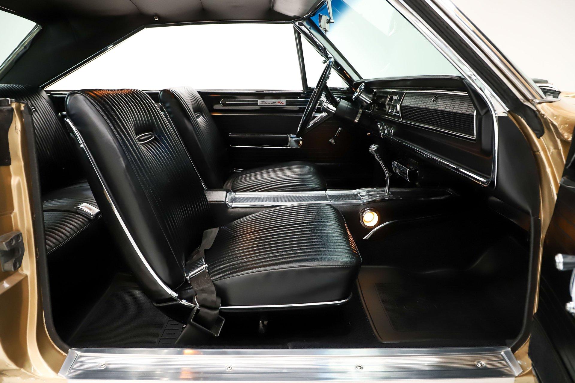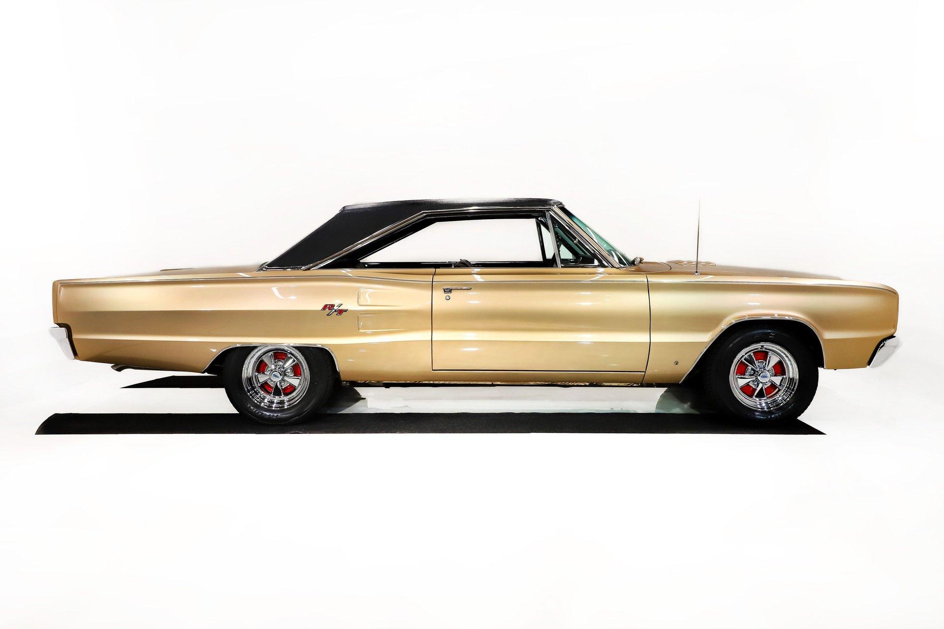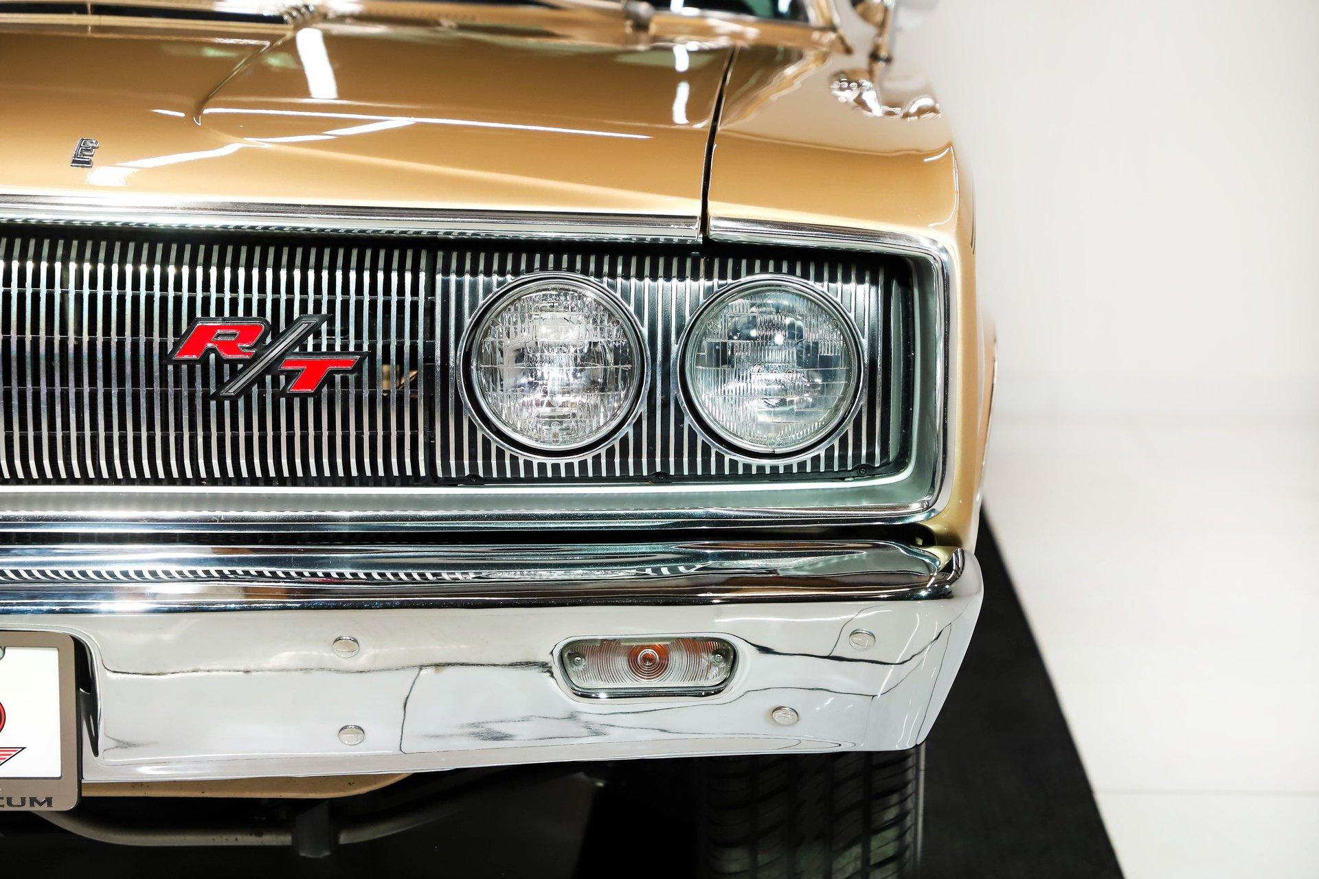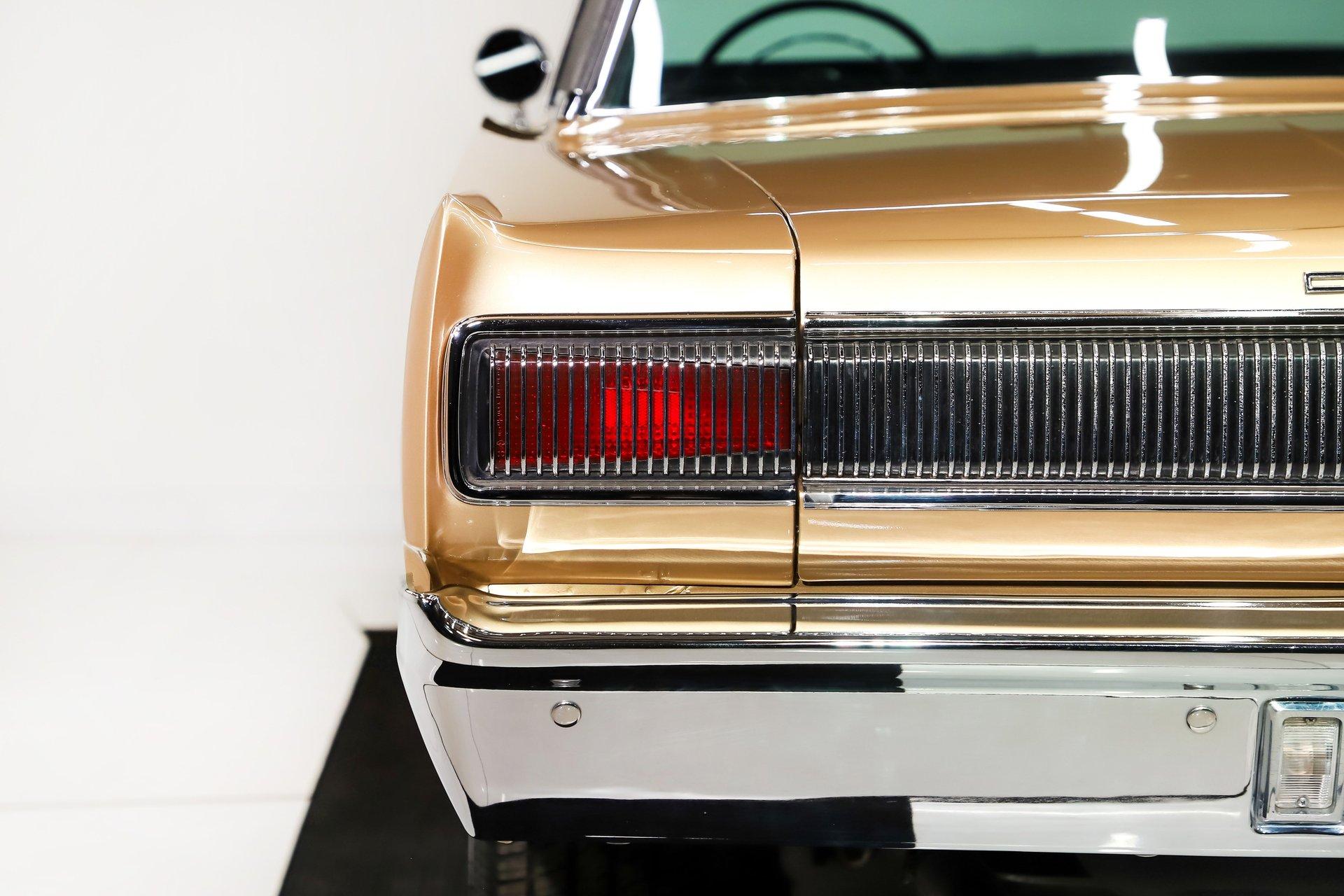 EXTERIOR: This Dodge Coronet R/T has a bold, masculine body style with fit and finish that is truly outstanding. The body is laser straight from front to back, and the panels align with the kind of precision you'd expect from a new car. The R/T hood louvers add just the right touch of muscle car attitude, perfectly complementing the car's aggressive lines. Repainted in its original Spanish Gold, the metallic finish is laid out evenly with exceptional depth and clarity. The clear coat has been polished to a brilliant shine and feels slick to the touch. Overall, the chrome and trim are straight, bright, and sparkle beautifully. The windshield is brand new, while the remaining glass retains its original Mopar stampings and remains in good condition. The vinyl top is in excellent shape, the jambs are clean, and the weatherstrips have been replaced. Completing the look is a brand new set of 15-inch Cragar wheels wrapped in BFGoodrich tires, giving the car the perfect stance.