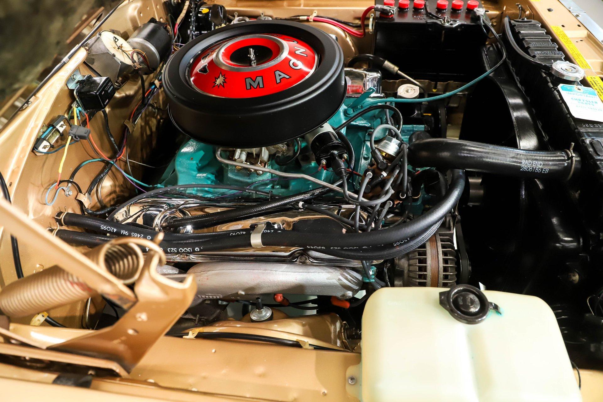 ENGINE COMPARTMENT: Lift the hood on this Dodge Coronet R/T and you'll find a show quality engine compartment that has been restored to factory condition in looks and function. At its heart is the legendary 440 Magnum, factory rated at 375 horsepower. According to the casting codes and stamped numbers, it is the correct engine for this car. Rebuilt and running strong, it is equipped with the proper components including factory style exhaust manifolds, correct ignition system, rechromed valve covers, and a beautiful air cleaner assembly. Designed to be as enjoyable to drive as it is to show, it features power steering and power brakes for effortless cruising. Cooling is handled by the correct Mopar radiator with the proper shroud, along with reproduction hoses and clamps. Even the details are exceptional, right down to the reproduction Mopar battery with proper hold down. Every component presents clean, correct, and orderly. The horns work, the windshield washer squirters are hooked up, and the engine bay itself is beautifully painted with clean metal throughout. For authenticity, the original fender tag and certicard remains in place, and the VIN stampings are present on the core support.