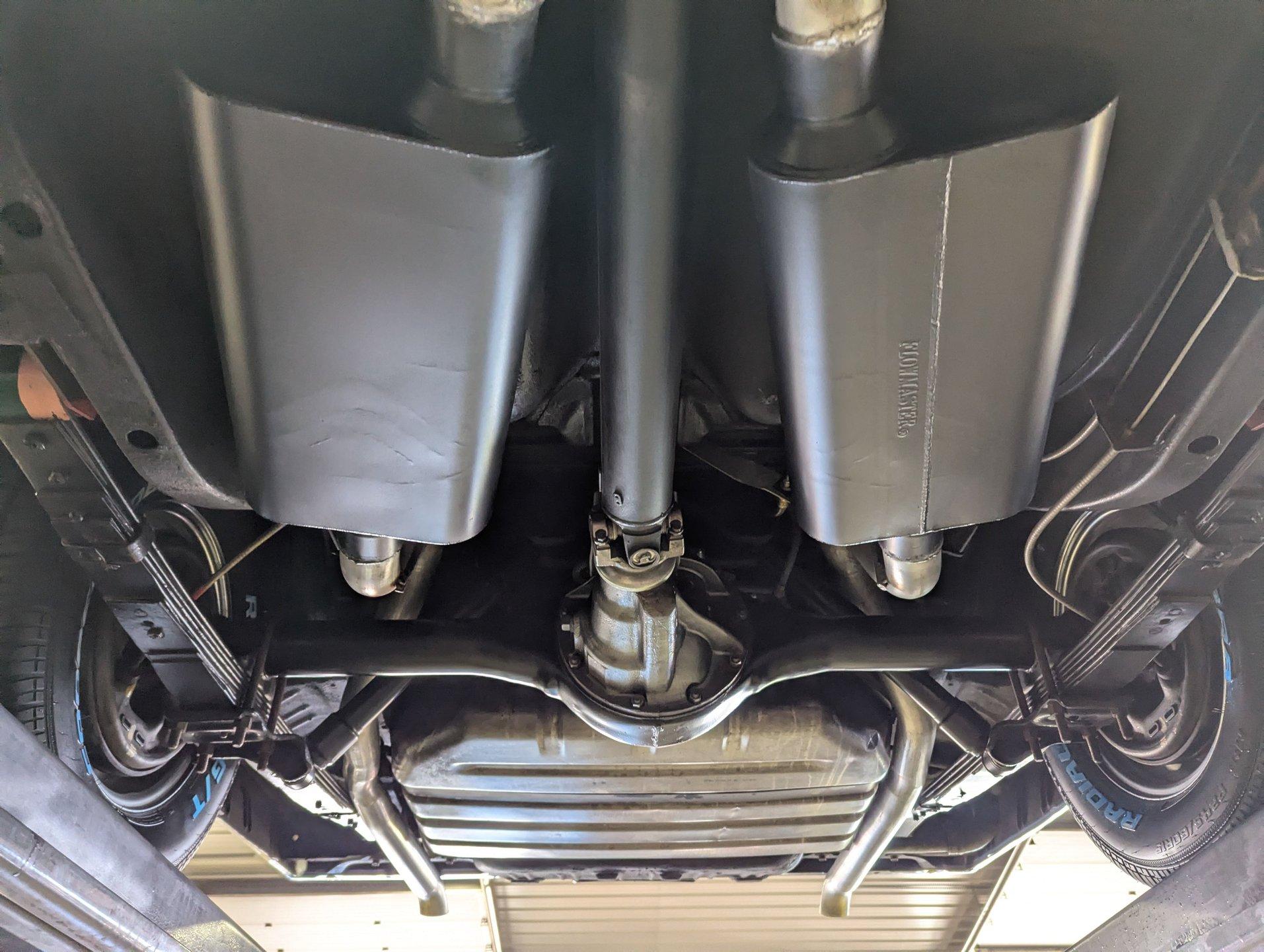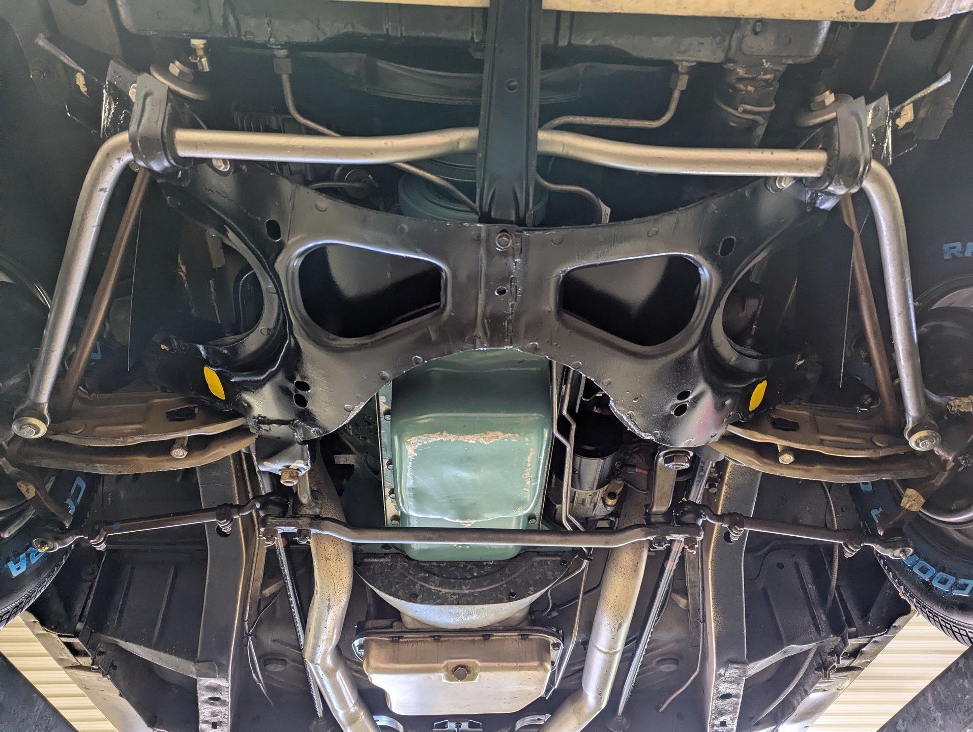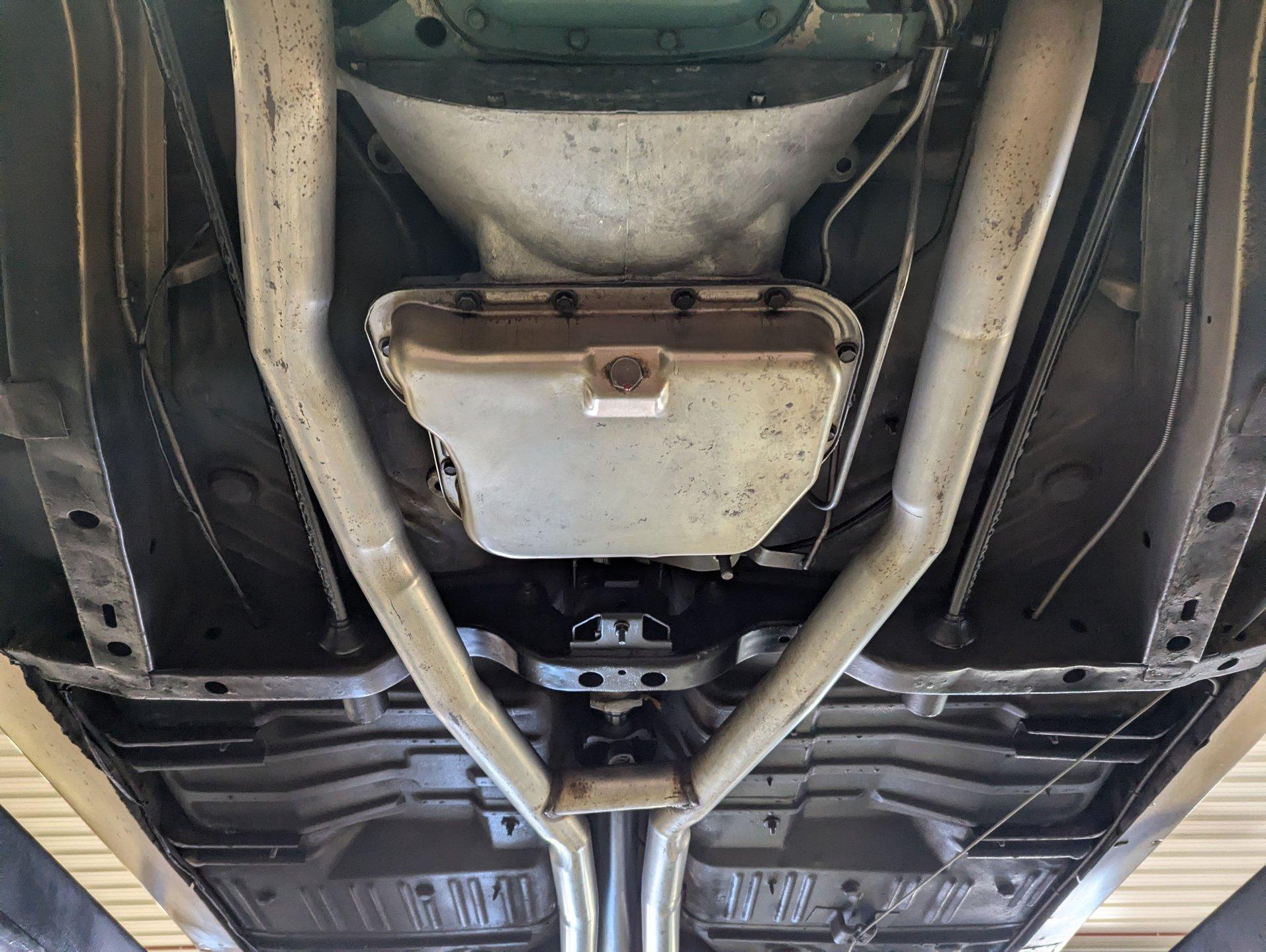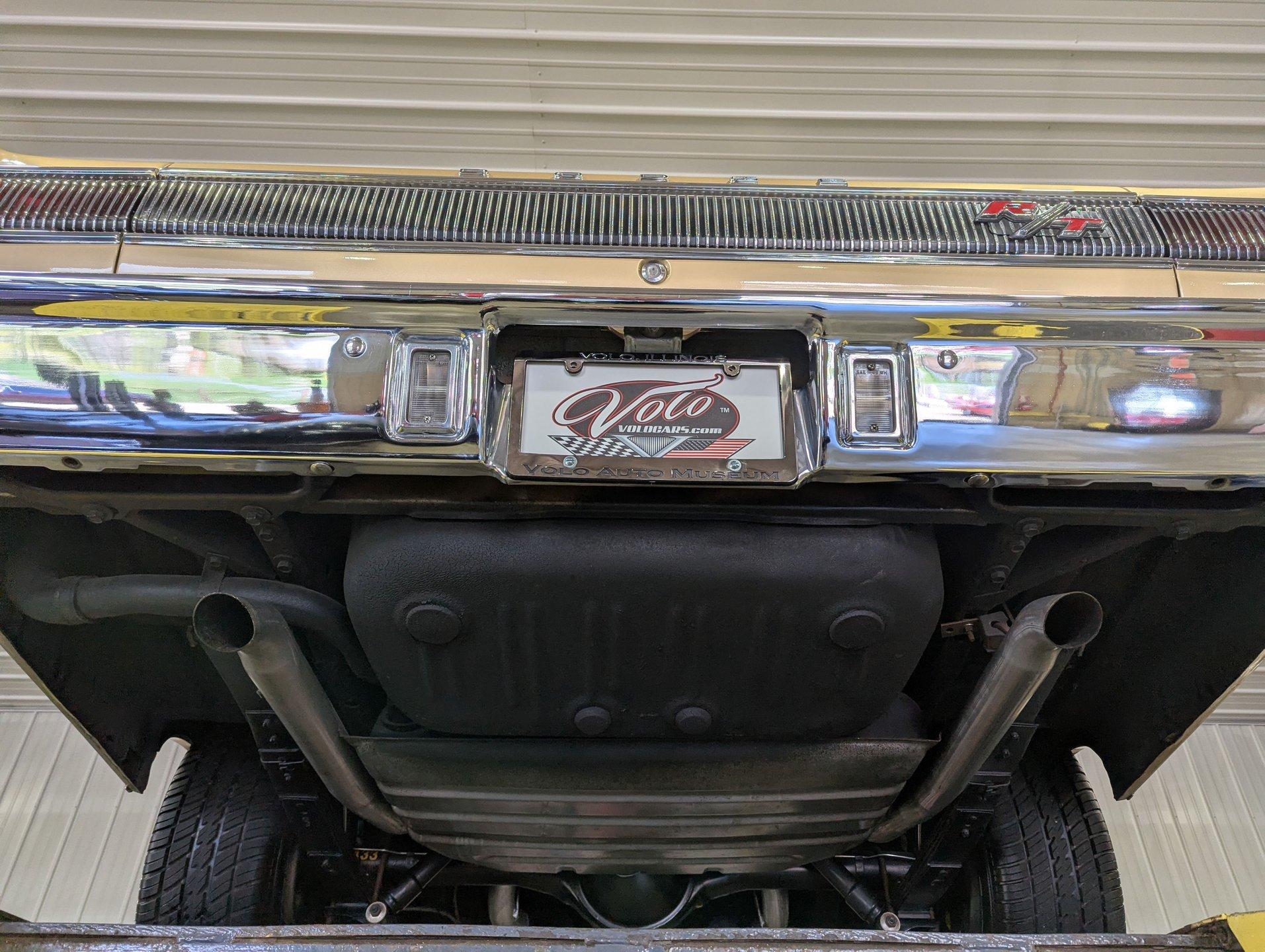 UNDERSIDE: Underneath is as impressive as the top side, showing a very nicely restored and highly detailed chassis. The steering and suspension components appear fresh, and even the factory style assembly line markings have been duplicated for added authenticity. The brake system has also been restored, and the emergency brake is properly hooked up and functional. A great sounding dual exhaust system with crossover pipe and Flowmaster mufflers gives the car the perfect muscle car tone. The fuel tank and lines have been replaced. Looking up at the drivetrain, the engine presents very cleanly, along with the correct 727 TorqueFlite automatic transmission. A rebuilt driveshaft sends power back to the stout 8¾ rear end equipped with 3.73 Sure-Grip gears. The overall structure appears to be exceptionally clean, rust free metal, including the frame rails and floor pans.