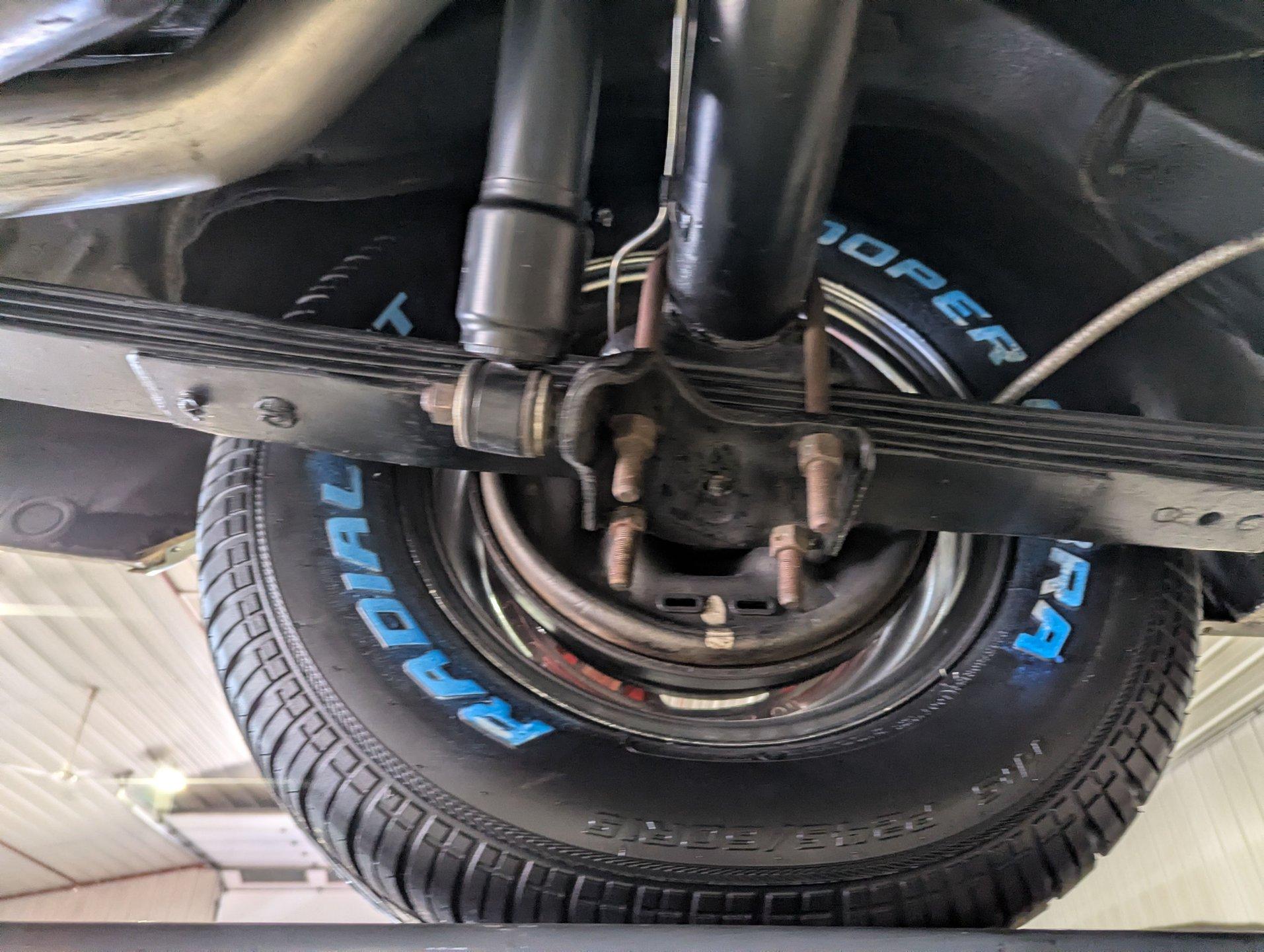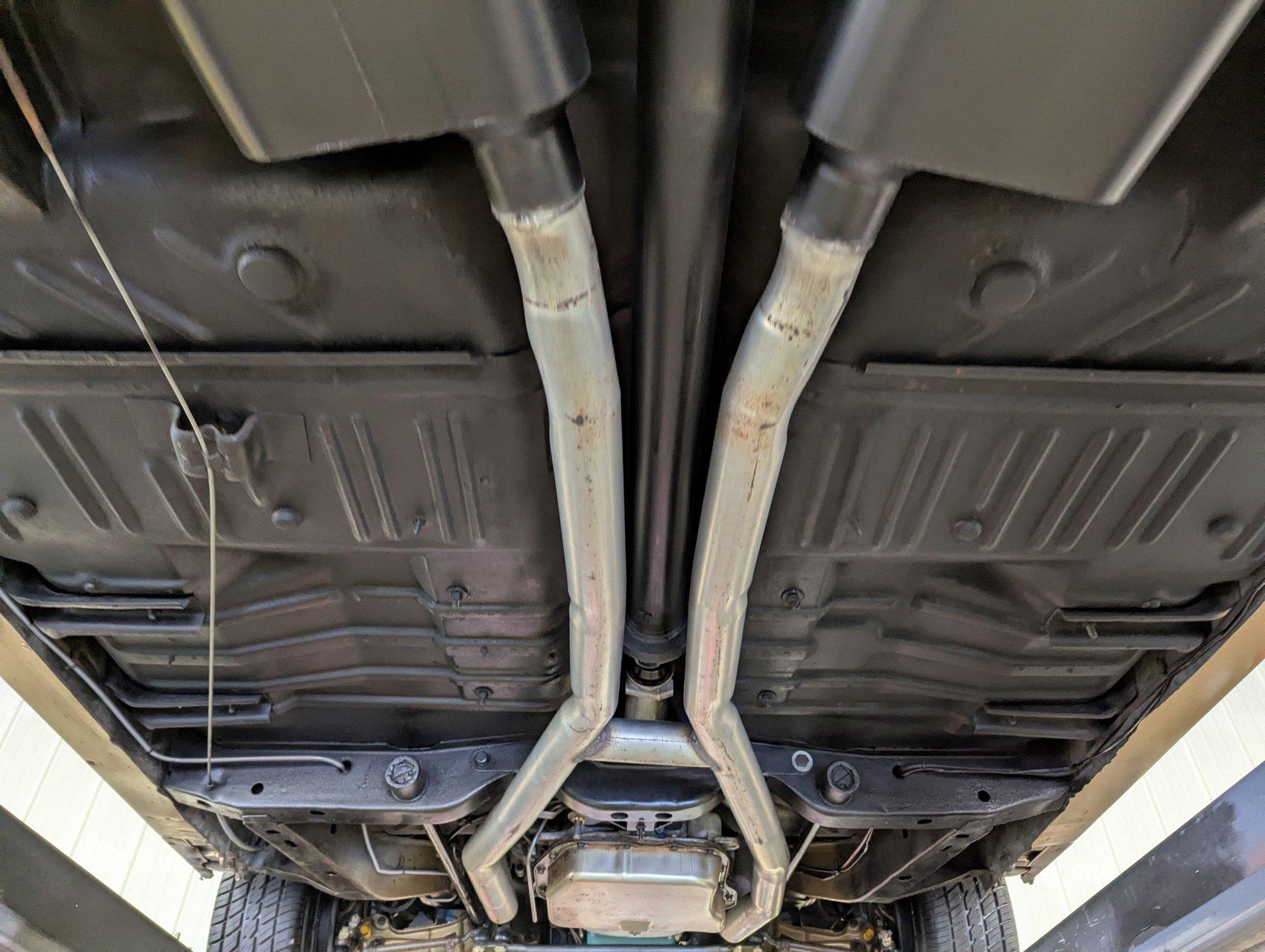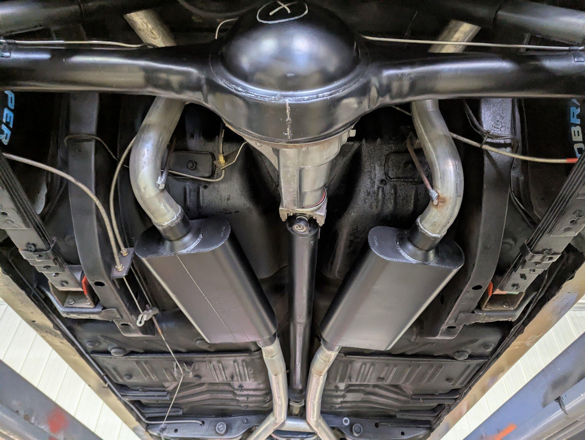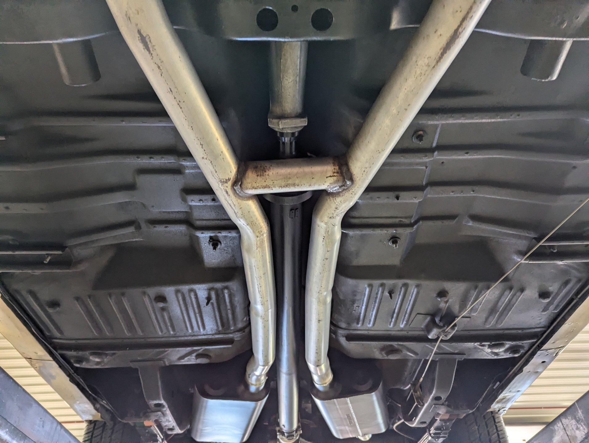 UNDERSIDE: Underneath is as impressive as the top side, showing a very nicely restored and highly detailed chassis. The steering and suspension components appear fresh, and even the factory style assembly line markings have been duplicated for added authenticity. The brake system has also been restored, and the emergency brake is properly hooked up and functional. A great sounding dual exhaust system with crossover pipe and Flowmaster mufflers gives the car the perfect muscle car tone. The fuel tank and lines have been replaced. Looking up at the drivetrain, the engine presents very cleanly, along with the correct 727 TorqueFlite automatic transmission. A rebuilt driveshaft sends power back to the stout 8¾ rear end equipped with 3.73 Sure-Grip gears. The overall structure appears to be exceptionally clean, rust free metal, including the frame rails and floor pans.