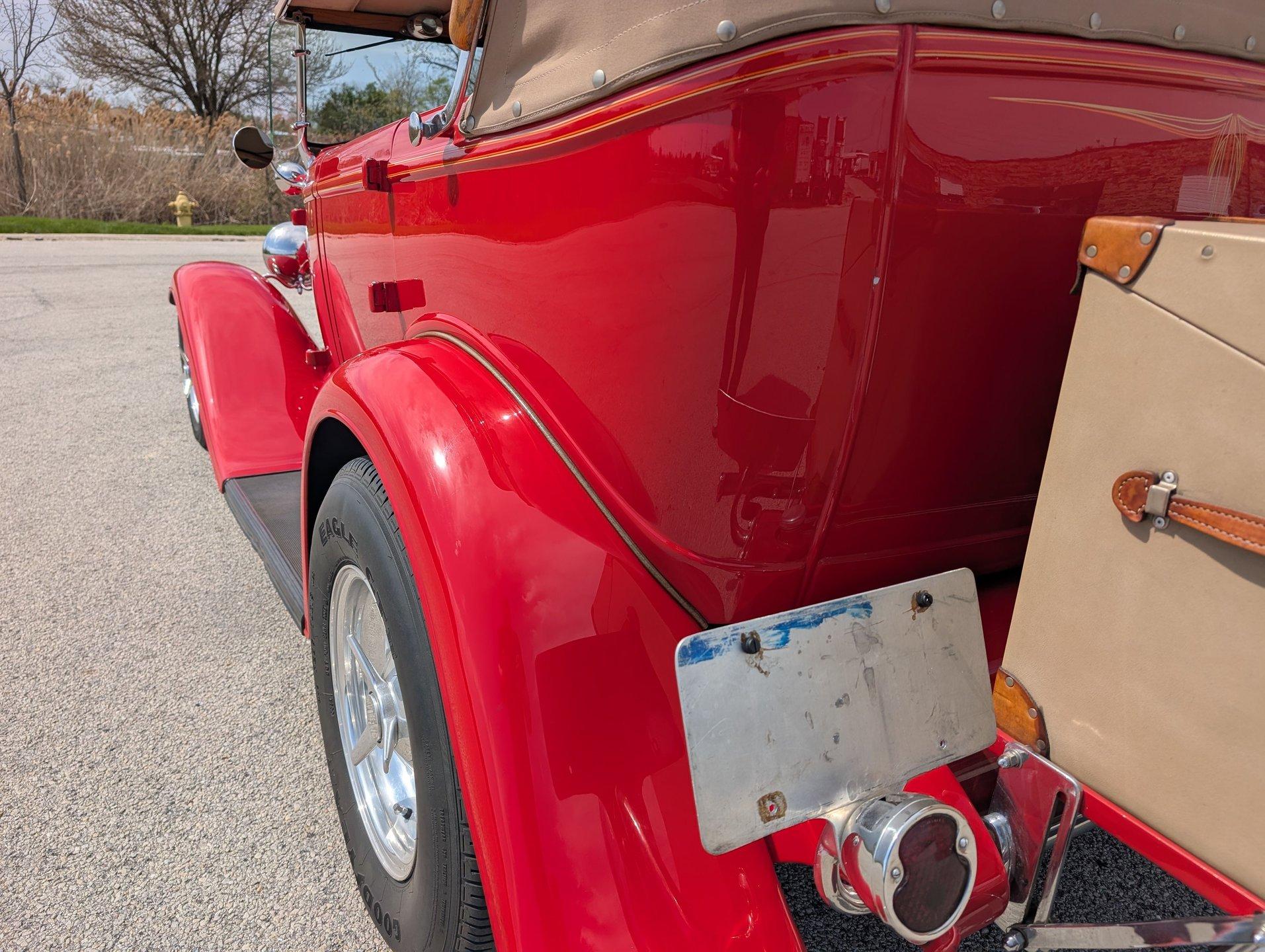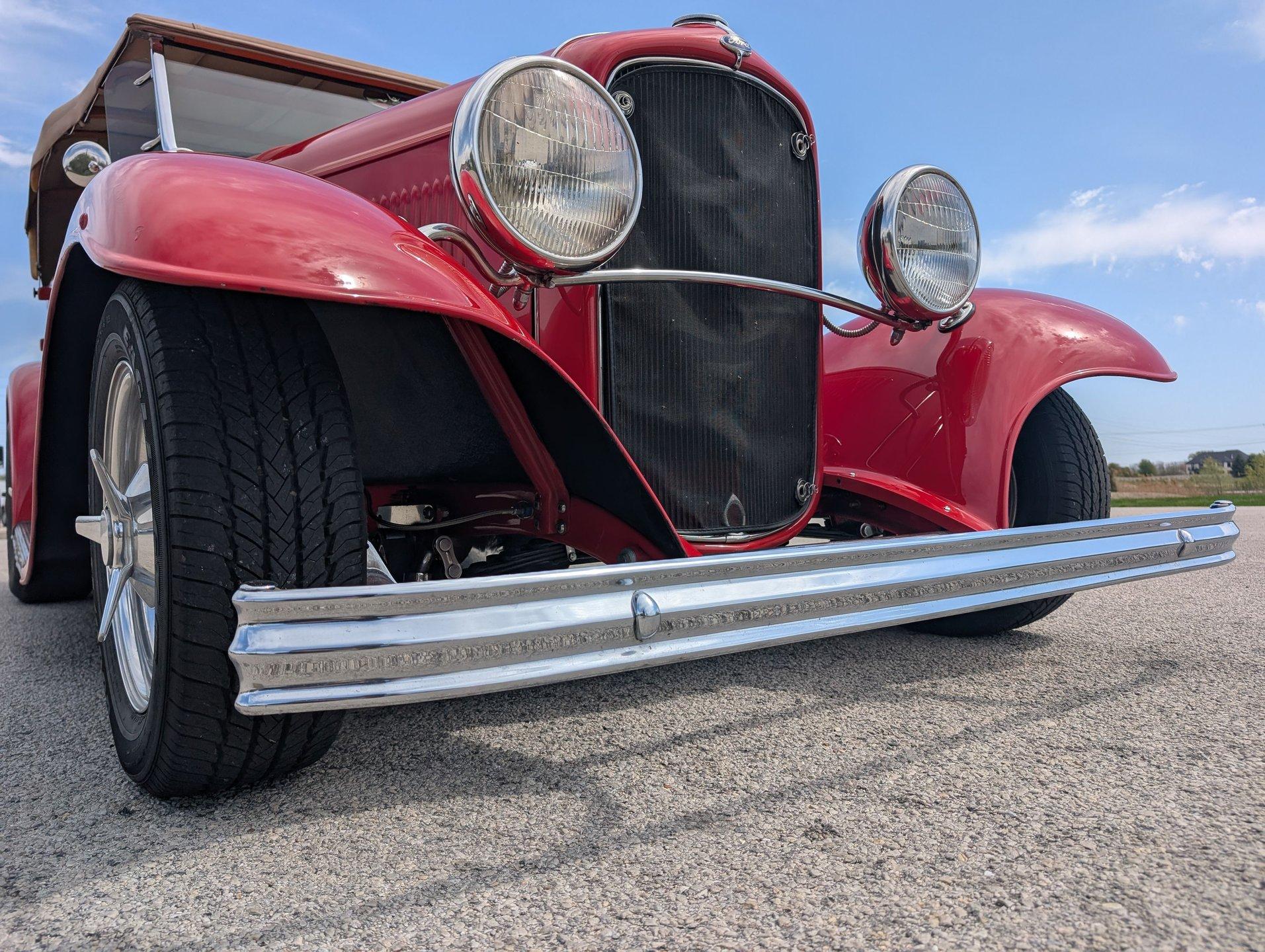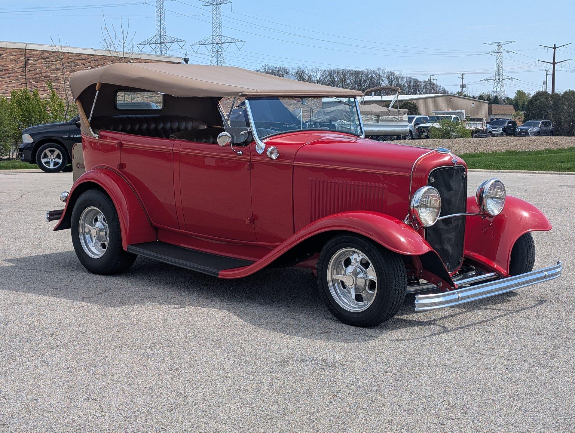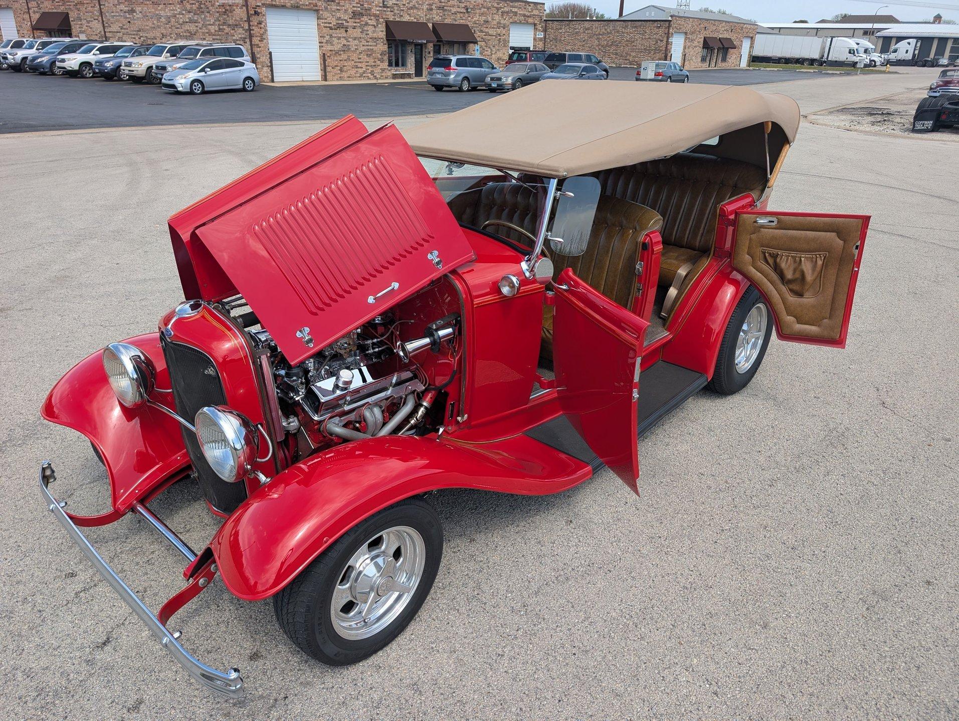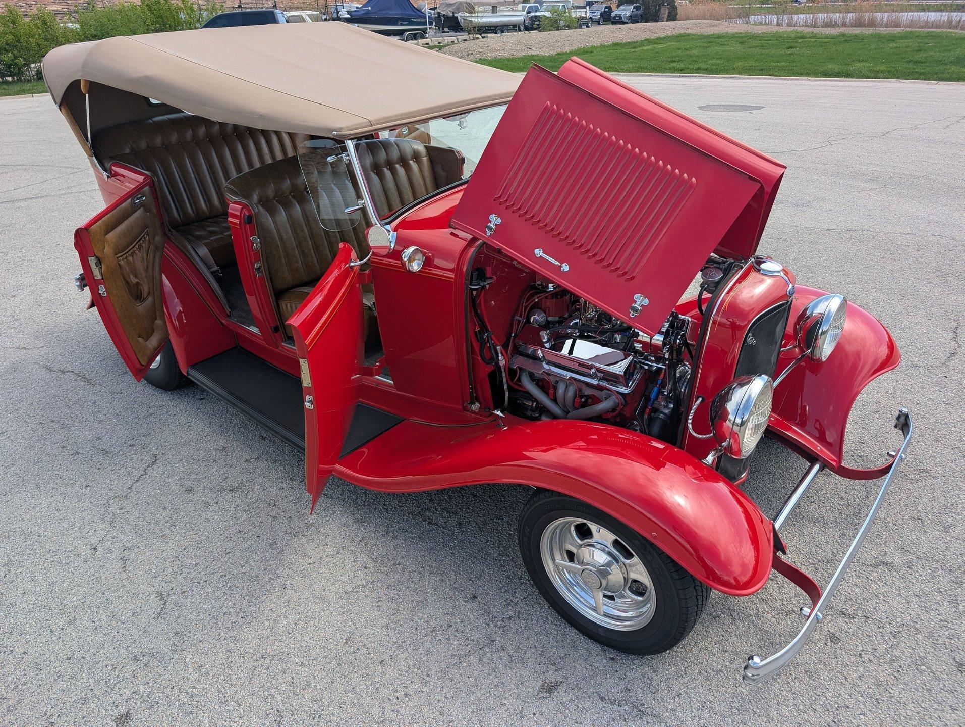 Survivor Classic Car Services Chicago is proud to present this hot rod 1932 Ford Phaeton. This clean drop top has been rebuilt from the bottom to the top making it a very presentable driver. From the painted flames on the underside to the clean canvas top with glass rear window, this fancy Ford shows incredibly well! Polished alloy wheels on all 4 corners bring the bling and match with the LeCarra wood & aluminum steering wheel, gauge bezel, and other touches around the dash. The engine is from a '75 chevy truck but has been warmed over with an Edelbrock intake manifold and carburetor, as well as a set of shorty tubular exhaust manifolds to bump power up to an estimated 220-240.