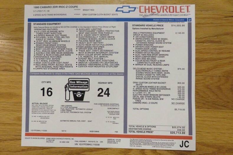 Barn / Garage Find One Owner / Purchased New from Everett Chevrolet in Hickory, NC on 1/23/1990 as Stated by Original Bill of Sale Listed Kept in the Owners Garage Since New Original Books Currently Showing 6,994 Miles that is Believed to be Correct NC Inspection Receipt Dated 6/16/2016 Shows Miles to be 6,534 Numerous Receipts Available Documenting Current Miles Believed to be Correct Automatic Transmission Which was the Only Option for the 5.7 Liter Only 4,213 IROC-Z Coupes were Produced for 1990 Only 2,415 IROC-Zs were Equipped with the 5.7L (350ci) TPI V8 Interior (Leather): was a premium option for the IROC-Z. While the total number of leather-equipped IROC-Zs isn't officially noted, it is considered significantly rarer than the standard custom cloth option G92 Performance Axle package, which included a 3.27 rear gear ratio and four-wheel disc brakes is also a rare option Decal Delete (DX3): Only 359 units (all engine types). Making this vehicle very rare