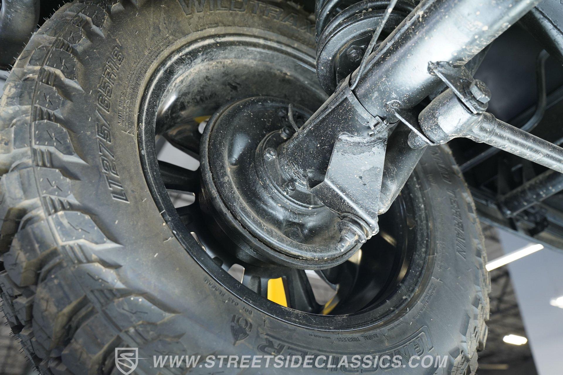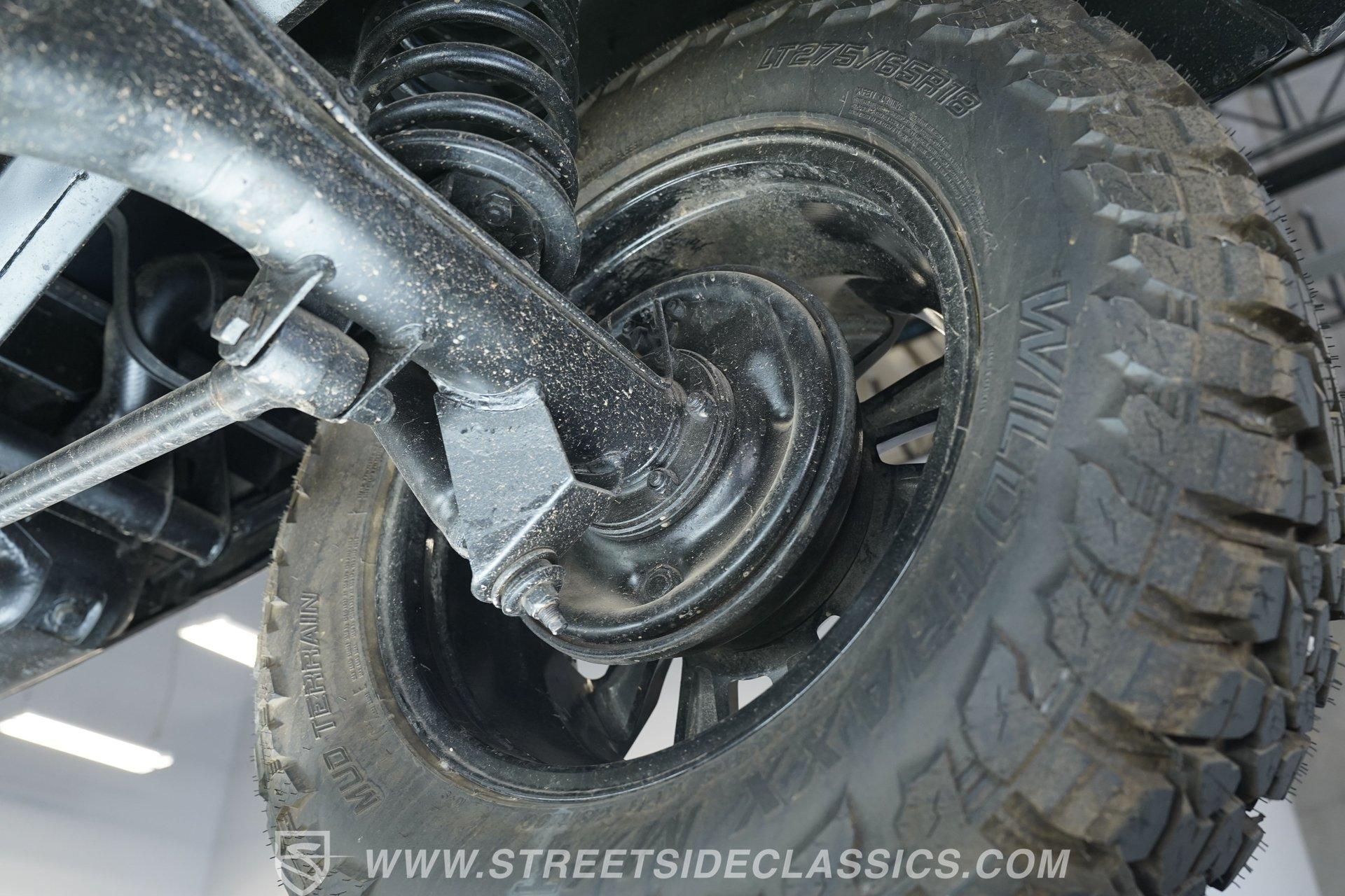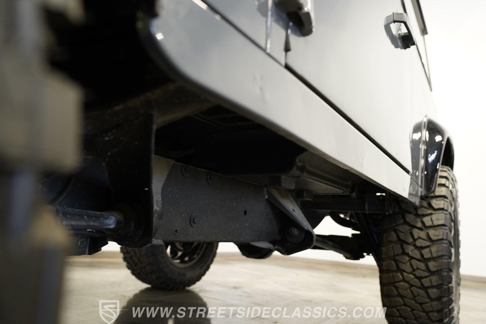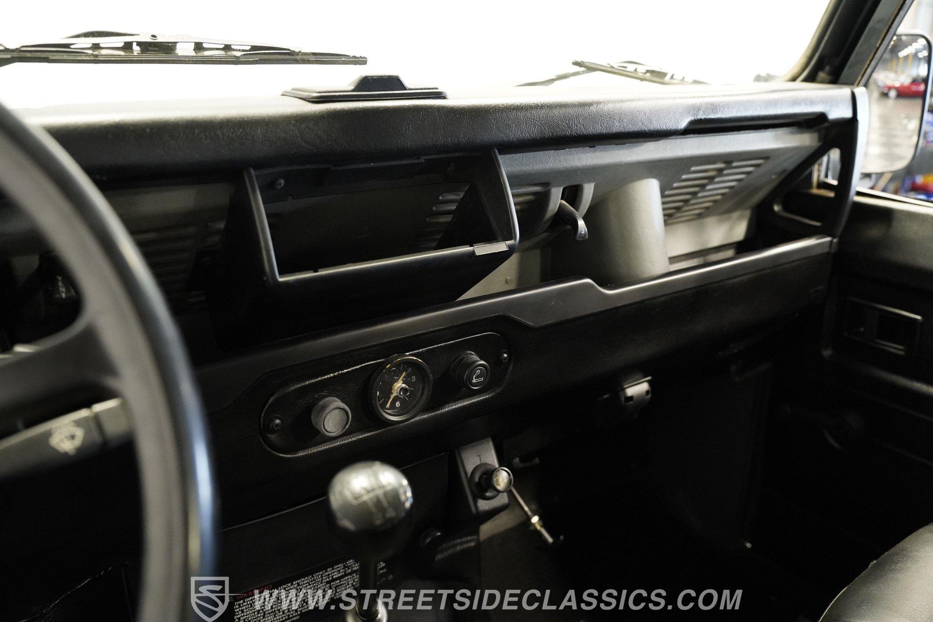 Step inside to a cabin that is straightforward and functional, designed for those who prioritize adventure over luxury. The front vinyl bench seat offers durability and a vintage feel, while the factory-style gauge cluster keeps everything within easy view. The floor-mounted shifter and metal flooring with rubber overlay add to the rugged ambiance, making every touchpoint practical yet authentic. Although simple, the interior maintains the classic Defender vibe with a focus on utility and comfort.