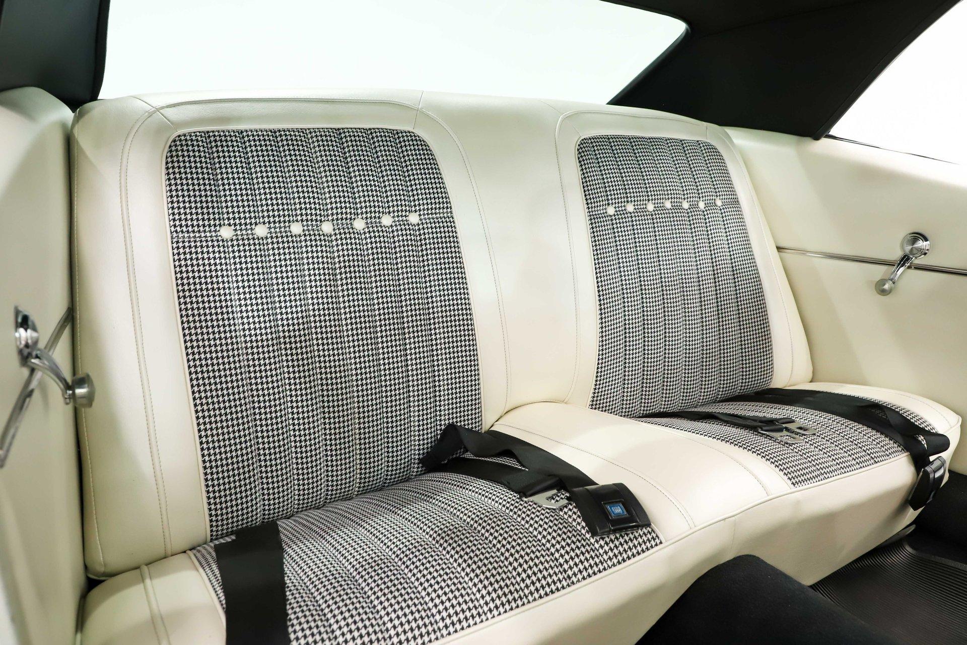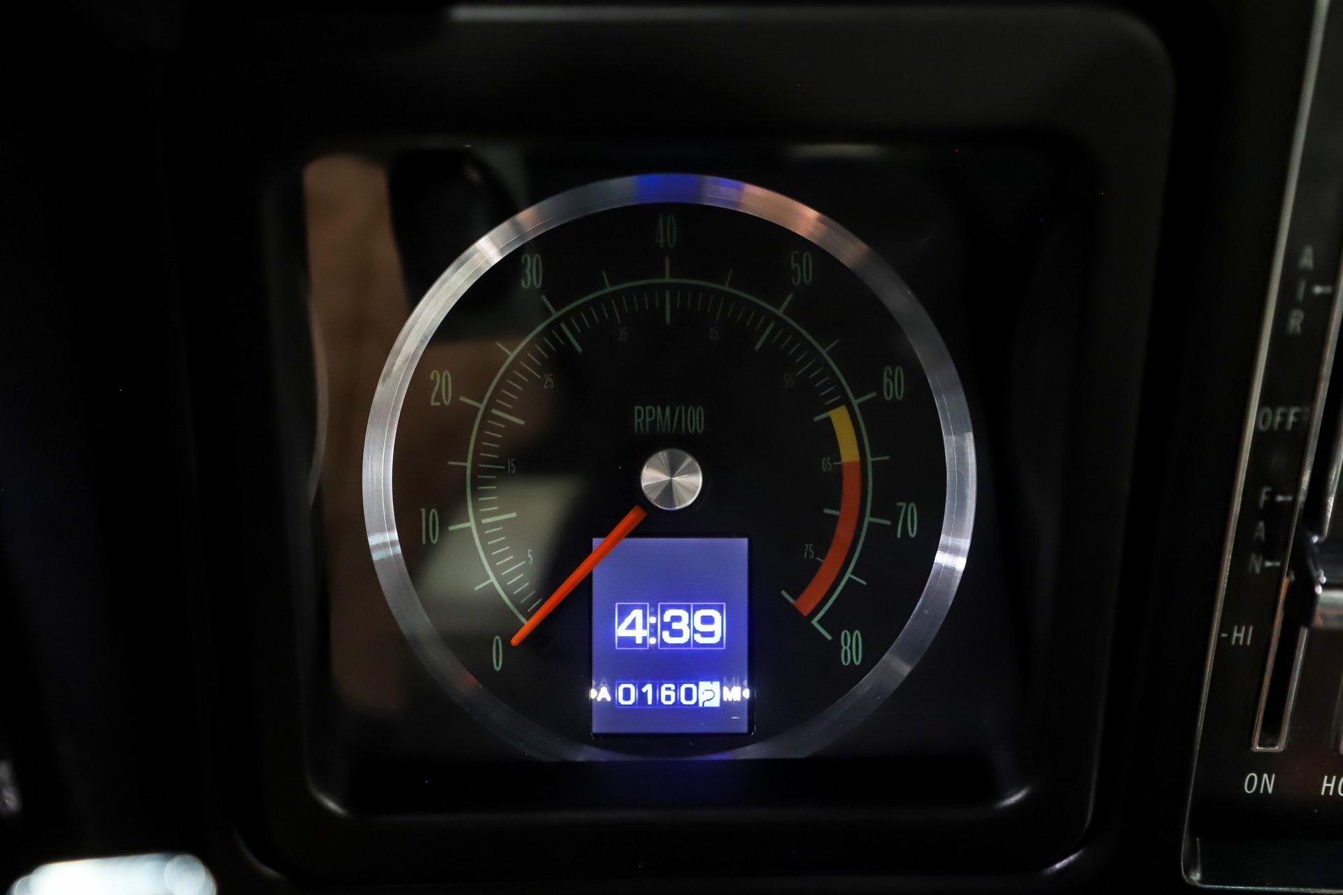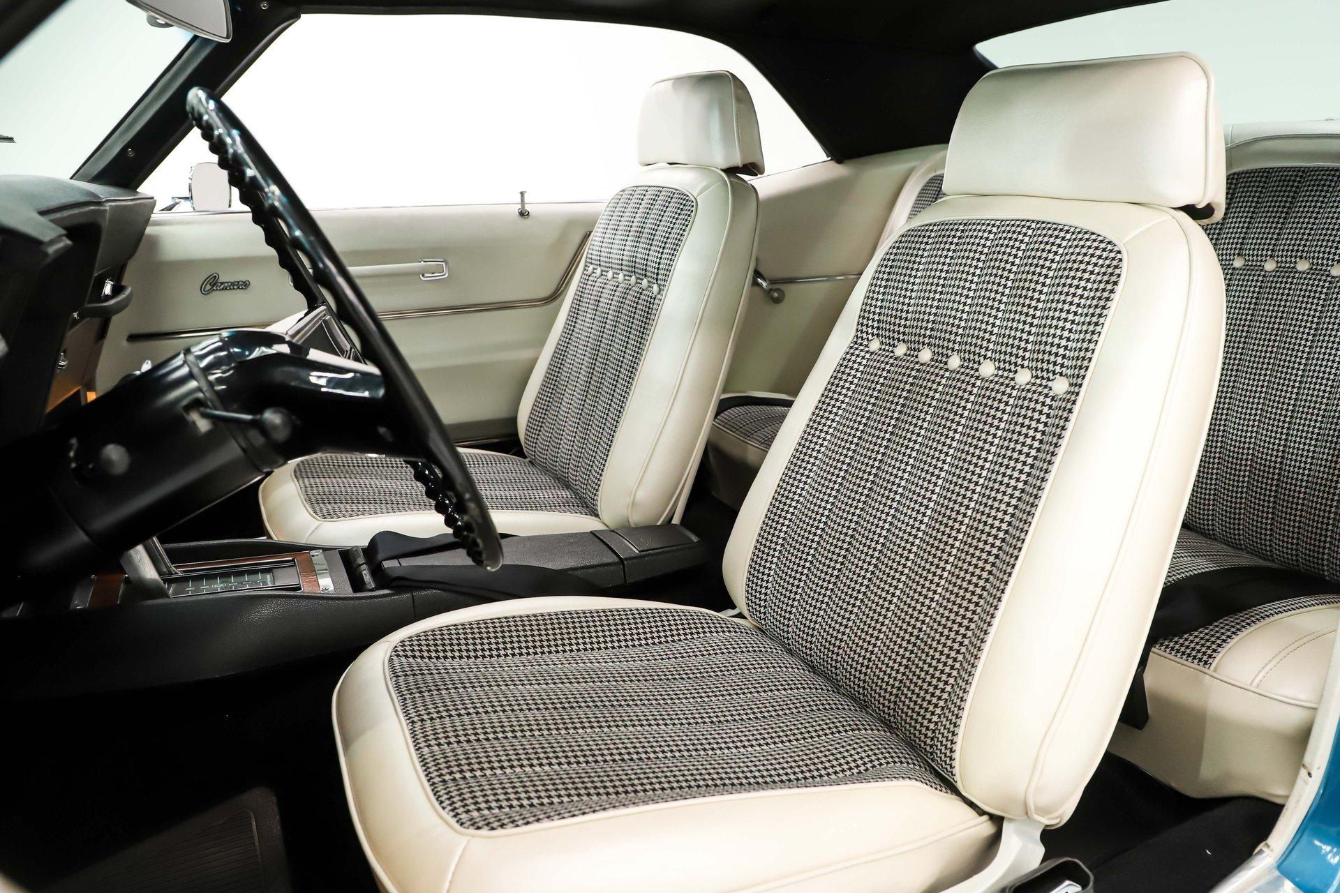 INTERIOR: This white houndstooth deluxe interior adds serious sizzle to an already hot Camaro and it's brand new. The deluxe molded door panels, fresh seat cushions, upholstery, and newly installed headrests give the cabin a crisp, upscale look. Fresh carpet lines the floor, while a tight fitting headliner with matching visors completes the clean appearance overhead. In the dash is a very cool set of retro style gauges, currently showing just 1,125 miles. The factory console has been updated with an overdrive automatic shift indicator, blending classic style with modern function. A retro stereo fits neatly in the factory location and sends tunes through 6x9 rear speakers along with speakers mounted in the kick panels. The reproduction SS steering wheel is mounted on a tilt column, and a full set of factory seatbelts is in place. Fresh, stylish, and exceptionally inviting, this is one attractive interior.