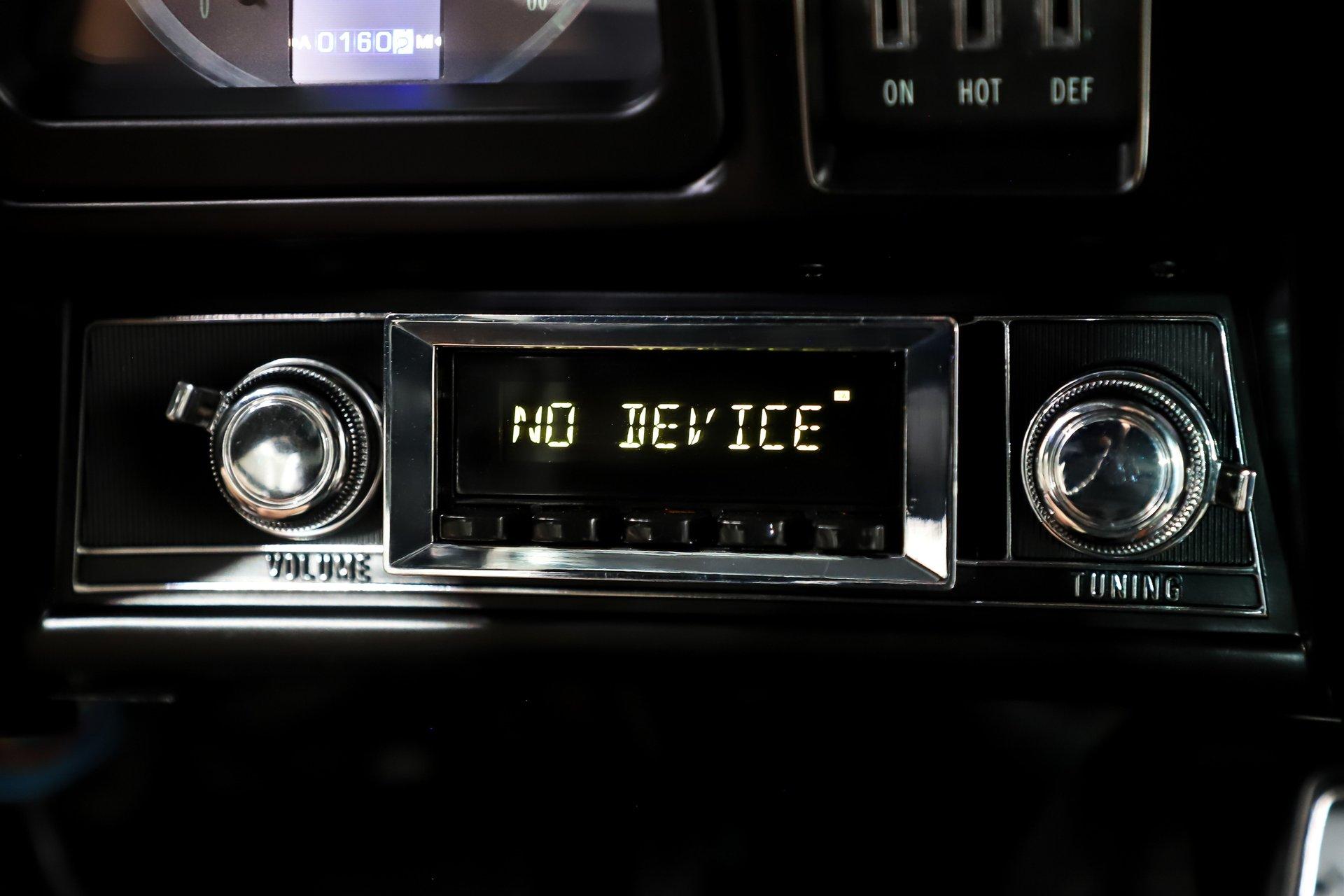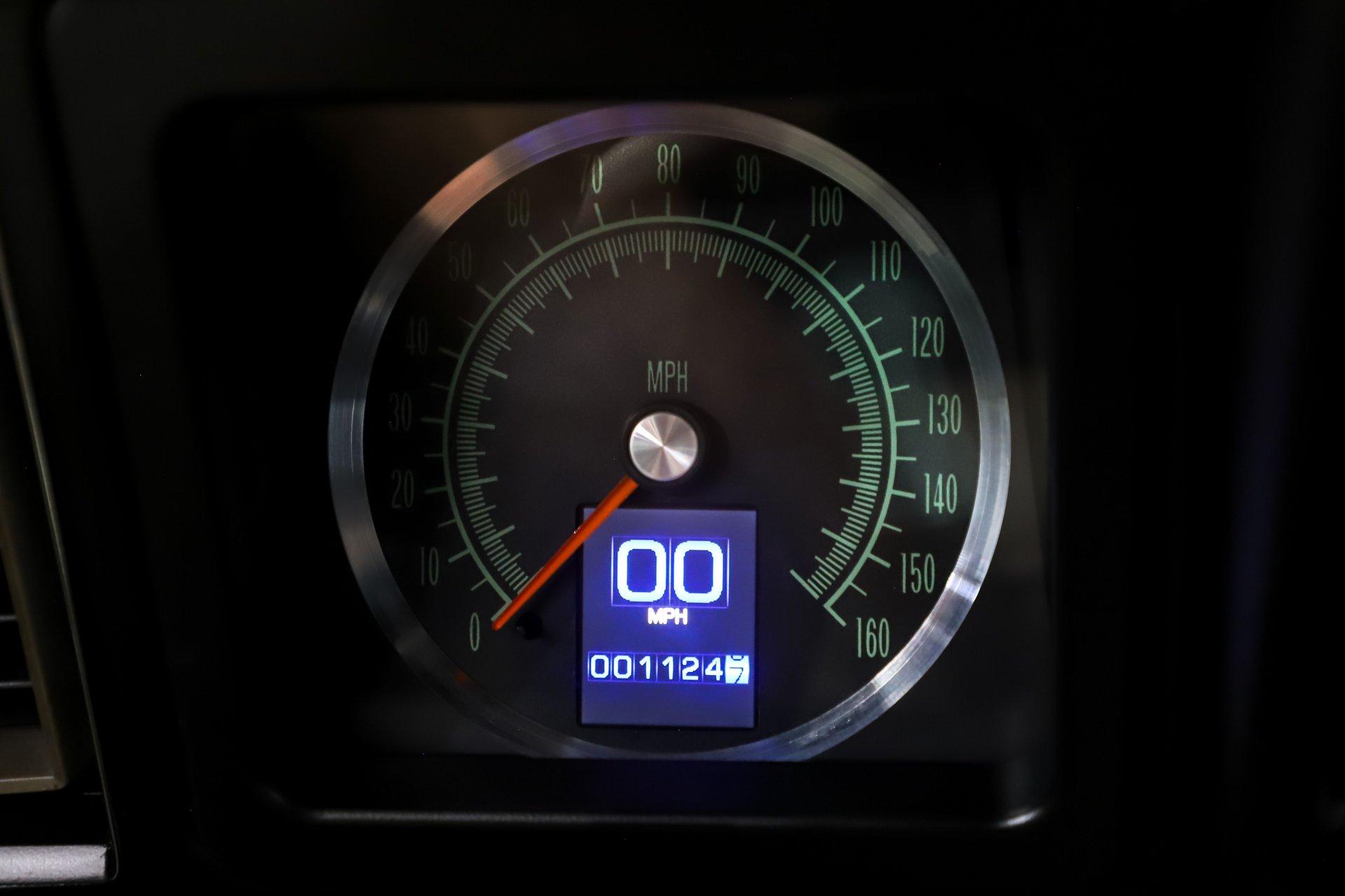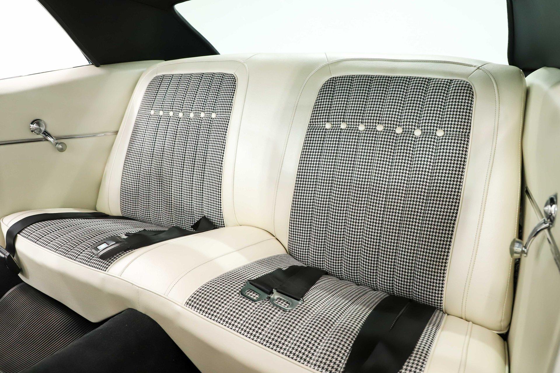 INTERIOR: This white houndstooth deluxe interior adds serious sizzle to an already hot Camaro and it's brand new. The deluxe molded door panels, fresh seat cushions, upholstery, and newly installed headrests give the cabin a crisp, upscale look. Fresh carpet lines the floor, while a tight fitting headliner with matching visors completes the clean appearance overhead. In the dash is a very cool set of retro style gauges, currently showing just 1,125 miles. The factory console has been updated with an overdrive automatic shift indicator, blending classic style with modern function. A retro stereo fits neatly in the factory location and sends tunes through 6x9 rear speakers along with speakers mounted in the kick panels. The reproduction SS steering wheel is mounted on a tilt column, and a full set of factory seatbelts is in place. Fresh, stylish, and exceptionally inviting, this is one attractive interior.