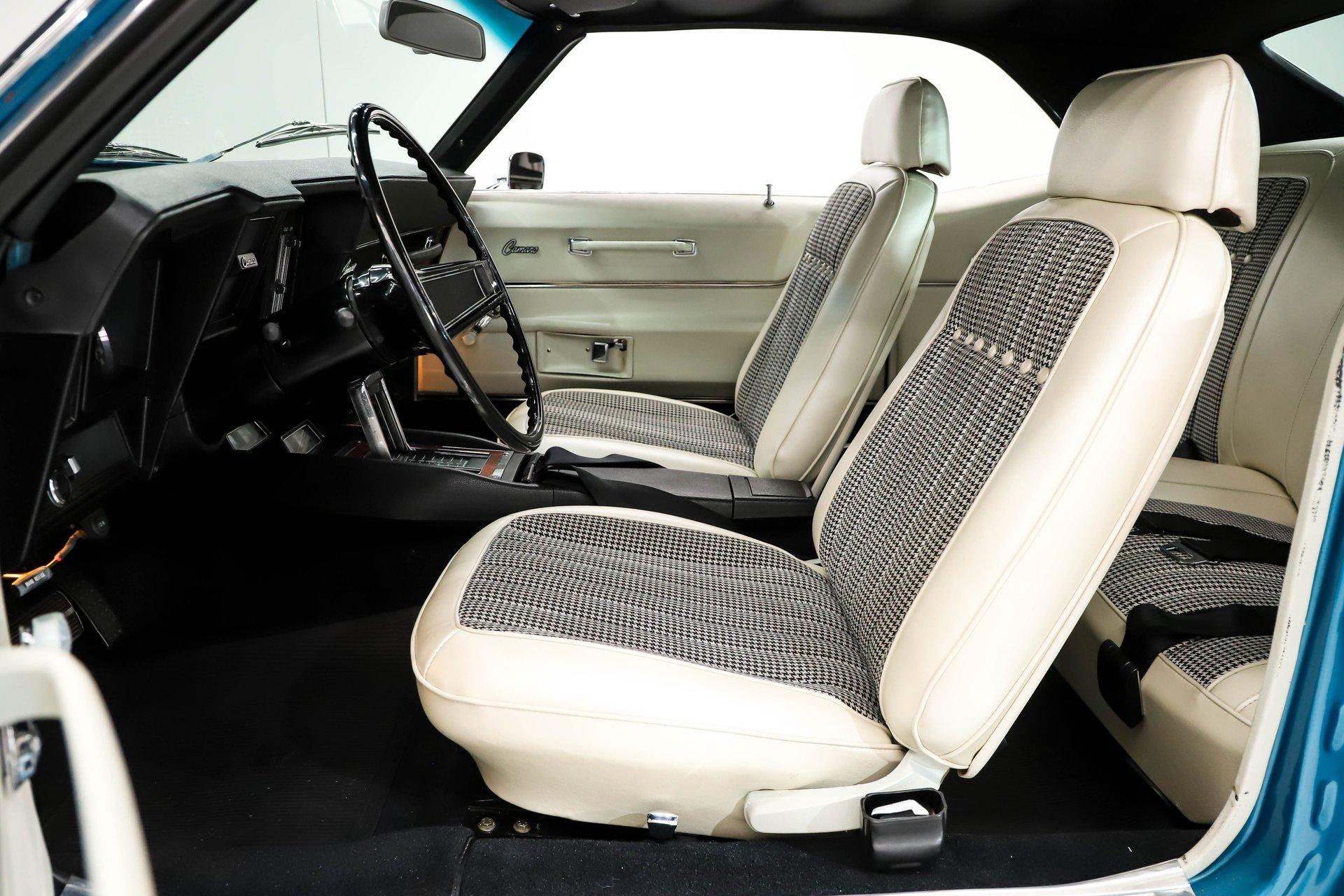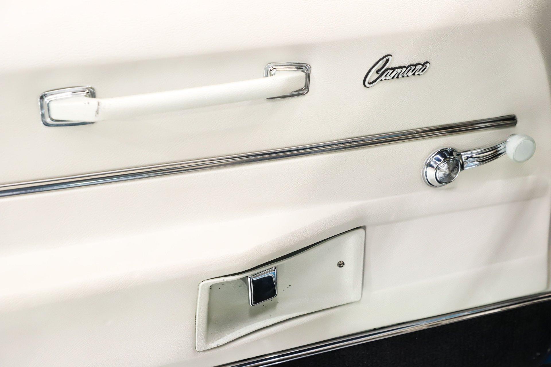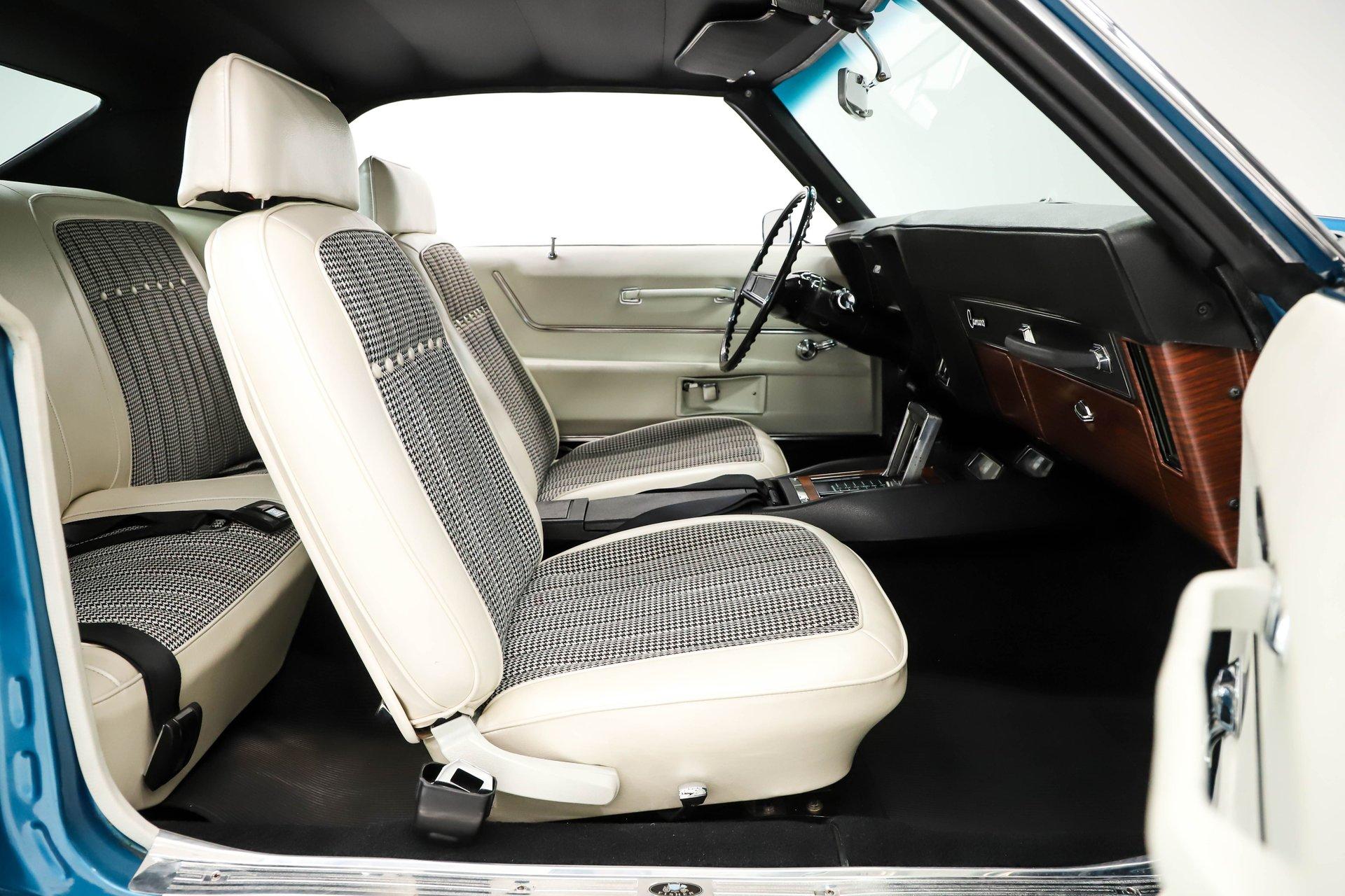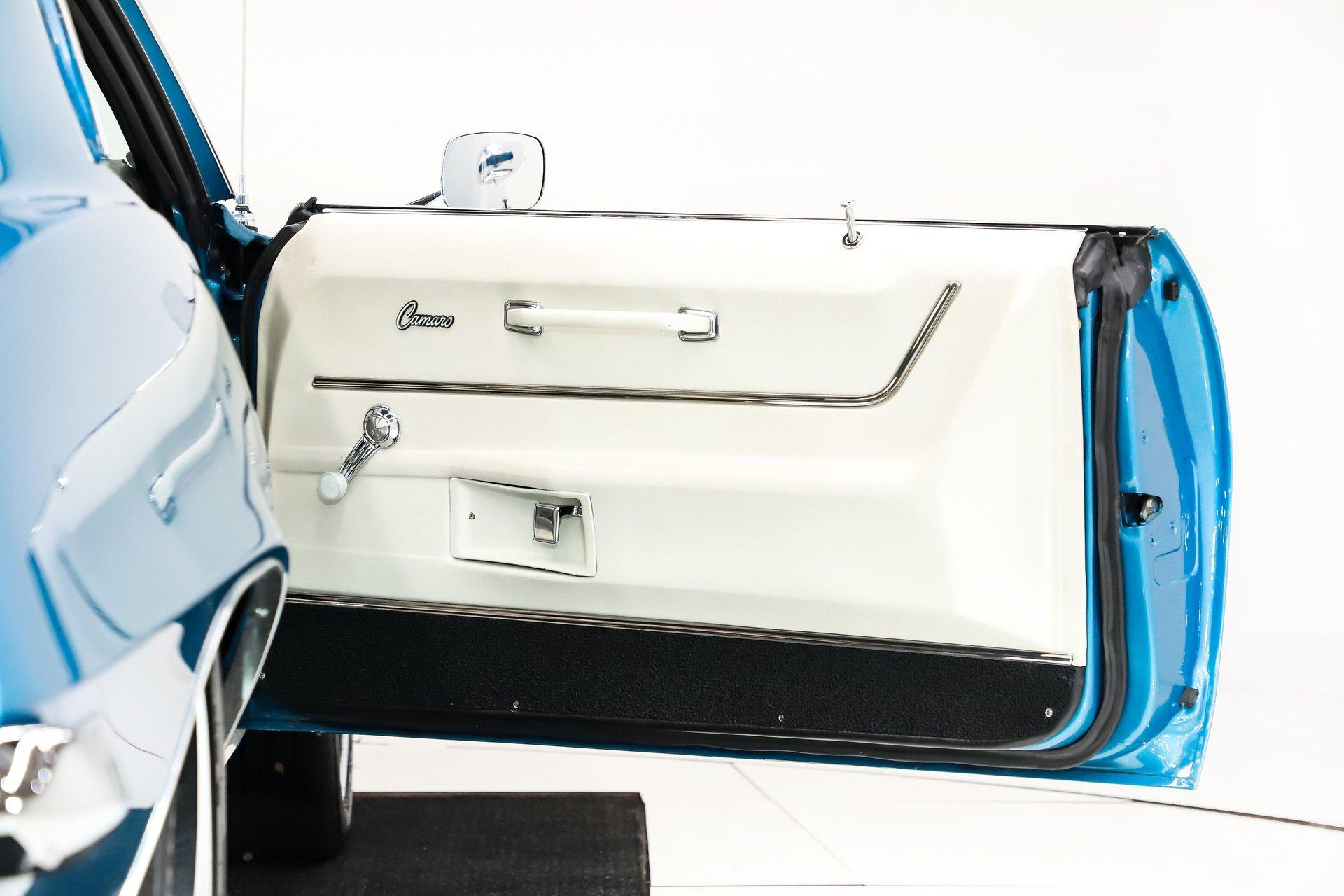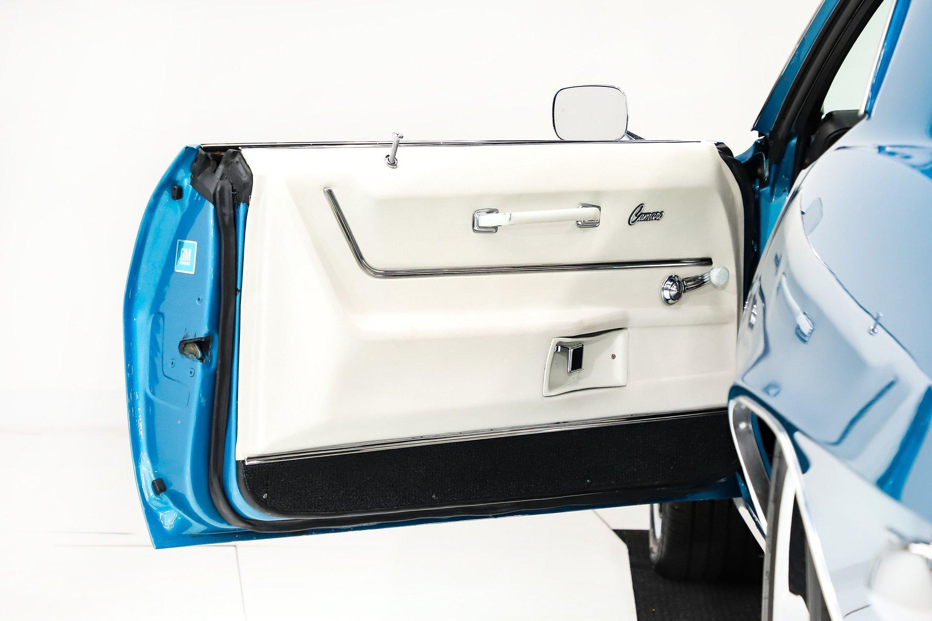 EXTERIOR: Undeniably stunning, this '69 Camaro is the kind of car that turns heads everywhere it goes. The iconic body style is legendary on its own, and this one takes it even further with a cowl hood, front and rear spoilers, and its original Le Mans Blue finish without a vinyl top. The body is absolutely straight with beautiful panel fit, while the metallic paint is laid out evenly and topped with a smooth, glossy clear coat that shines from every angle. White hockey stick stripes add even more sizzle. It's also dressed with the desirable exterior trim group, including wheel well moldings, quarter panel louvers, and rain gutter trim. Then there's the Rally Sport package, featuring hideaway headlights upgraded with electric motors for modern convenience. The chrome trim, glass, and weatherstrips are all in excellent shape. Finishing it off is a proud stance on chrome Resto Laguna wheels wrapped in performance tires, 17 inch in front and 18s in back. This Camaro has the looks, presence, and attitude to back up its performance.