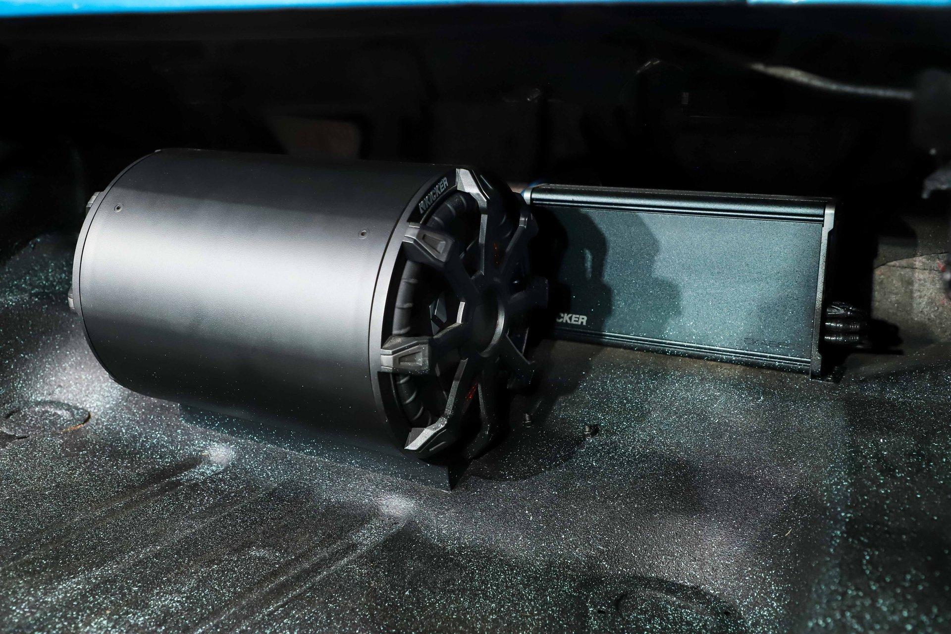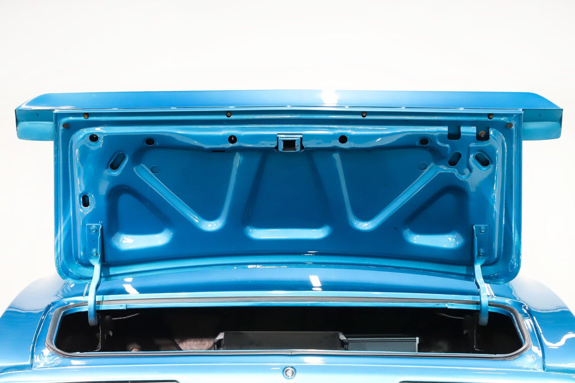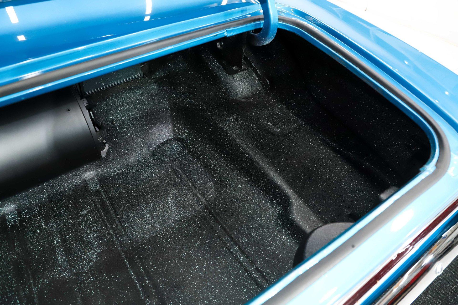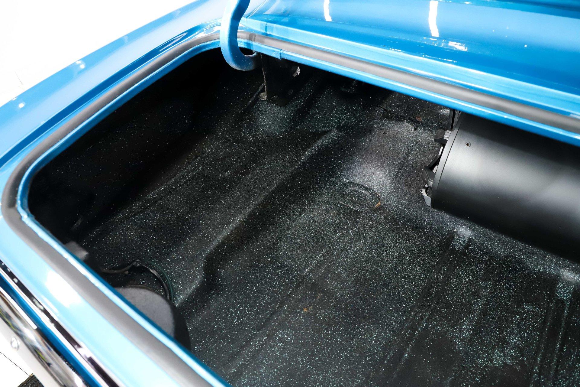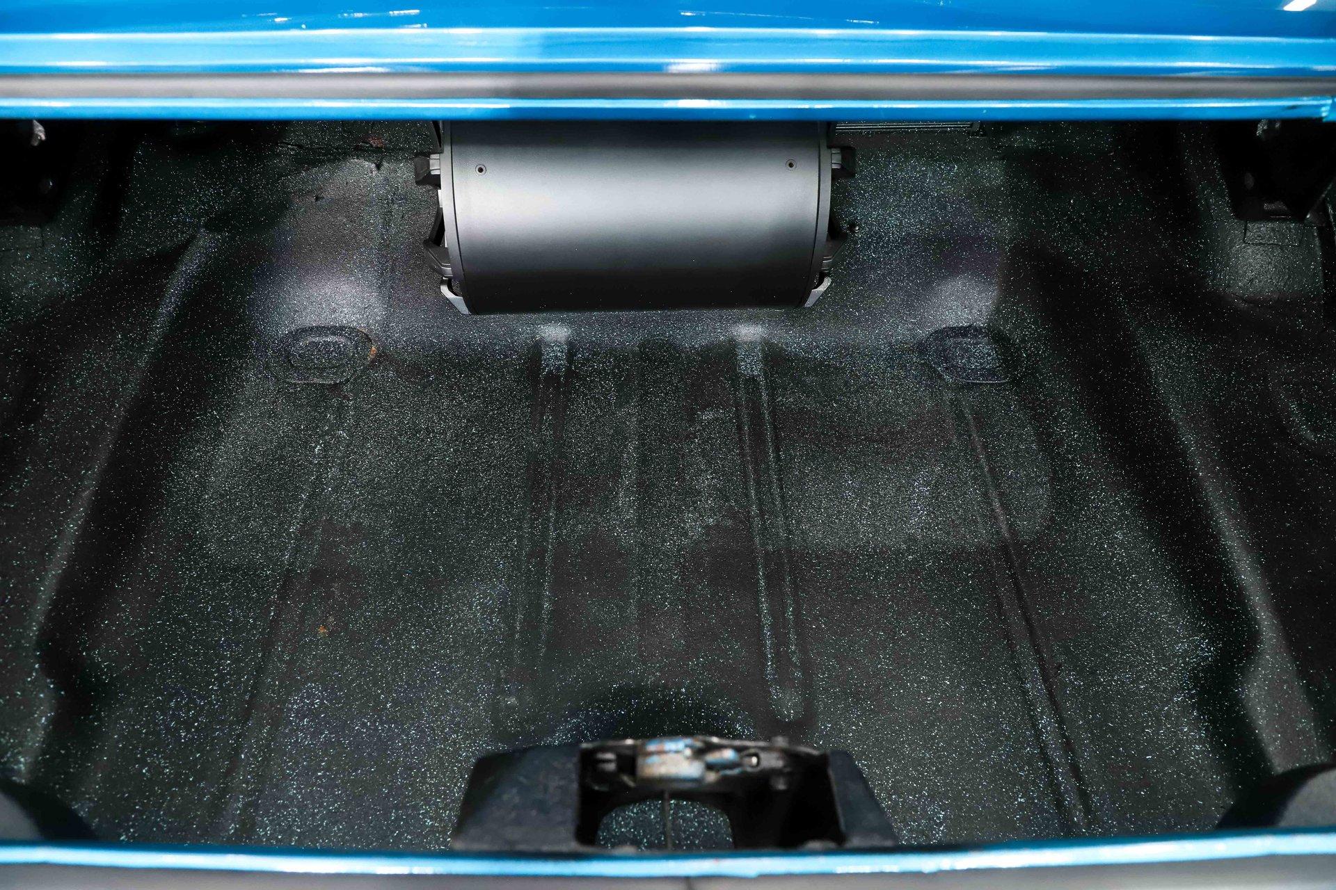 TRUNK COMPARTMENT: It is tidy, under the trunk lid and the jamb are painted a nice blue and inside is solid metal with a spatter finish paint. There's also an amplifier and subwoofer as part of the stereo system.