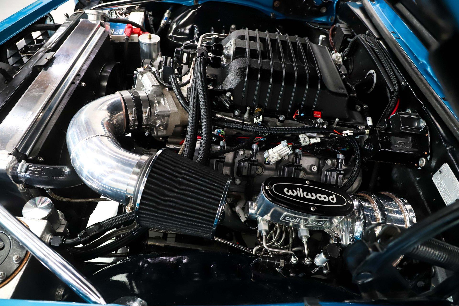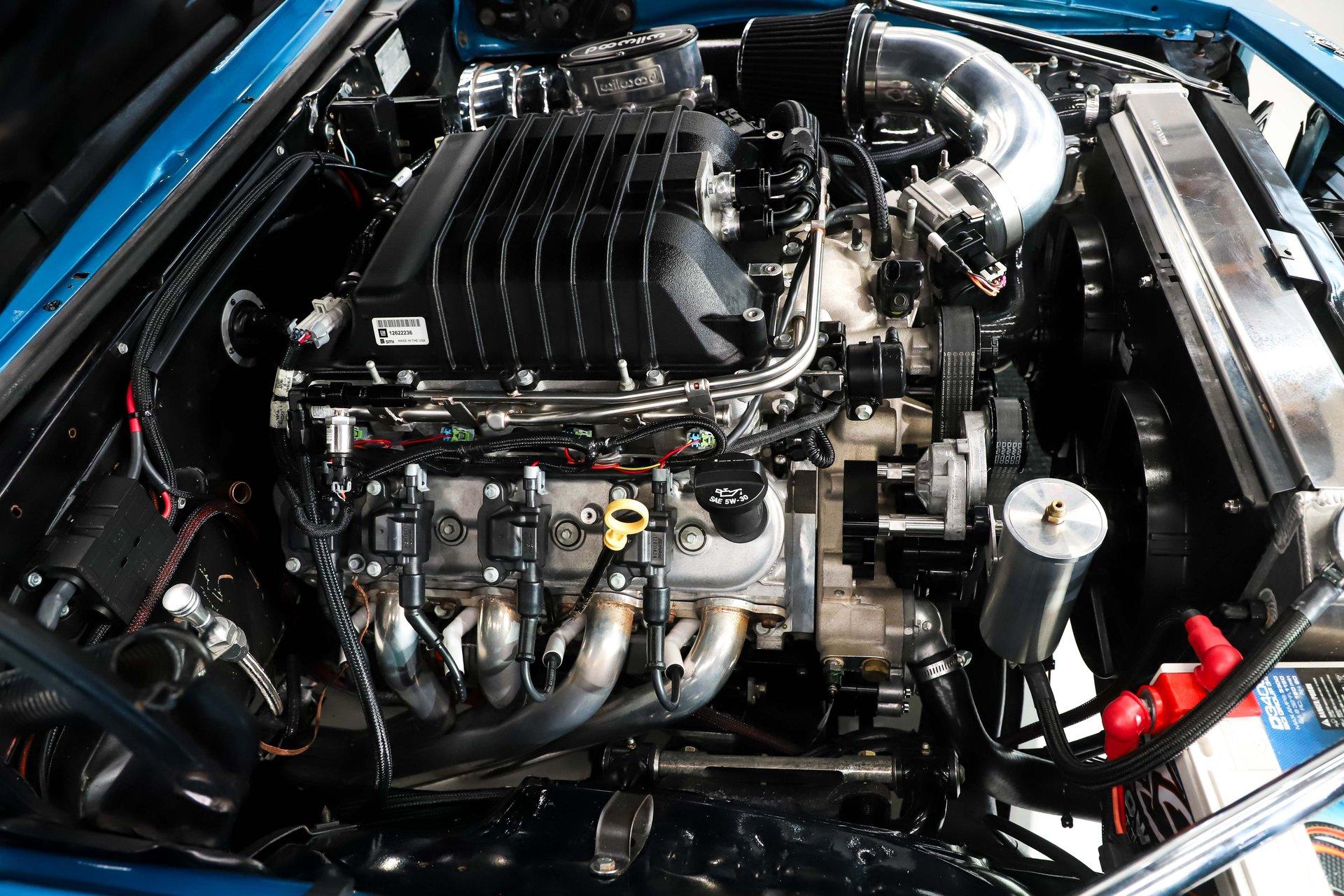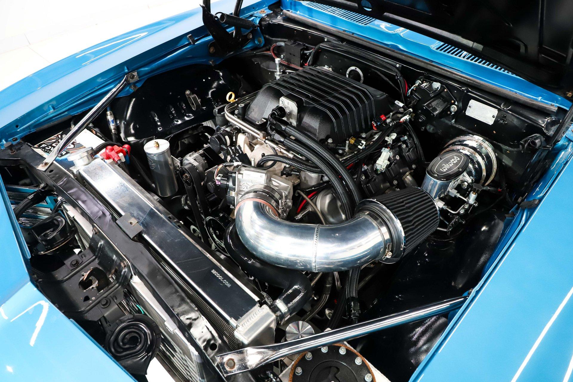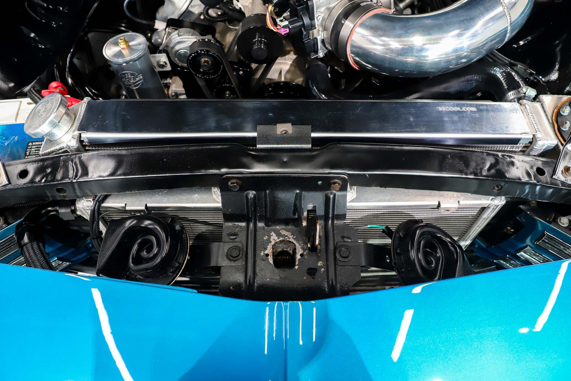 ENGINE COMPARTMENT: Here's what truly separates this '69 Camaro from the rest- its supercharged LSA 6.2-liter motor, delivering an exhilarating 580 horsepower. With instant throttle response and serious muscle on tap, this modern powerhouse brings incredible performance to a classic body style. The engine bay is both functional and impressive, featuring a polished cold air intake, serpentine front runner system, modern alternator, and modern power steering. A remote mounted intercooler reservoir helps keep the boosted powerplant performing at its best. It runs cool thanks to a large aluminum radiator with dual electric fans, while headers help it breathe freely and add to the aggressive sound. Stopping power is just as strong, with a Wilwood master cylinder and chromed power brake booster. Clean, practical, and built for real performance.