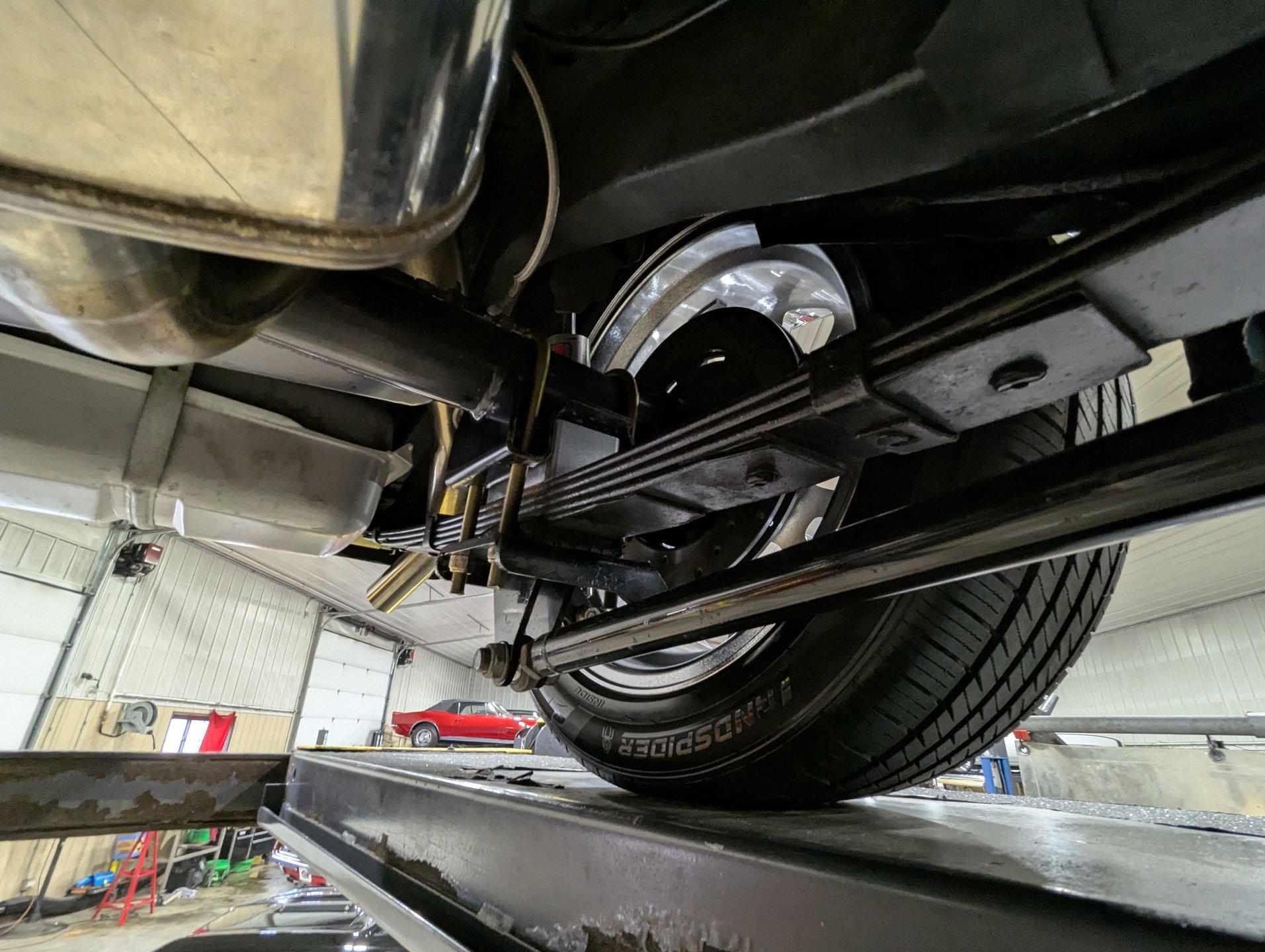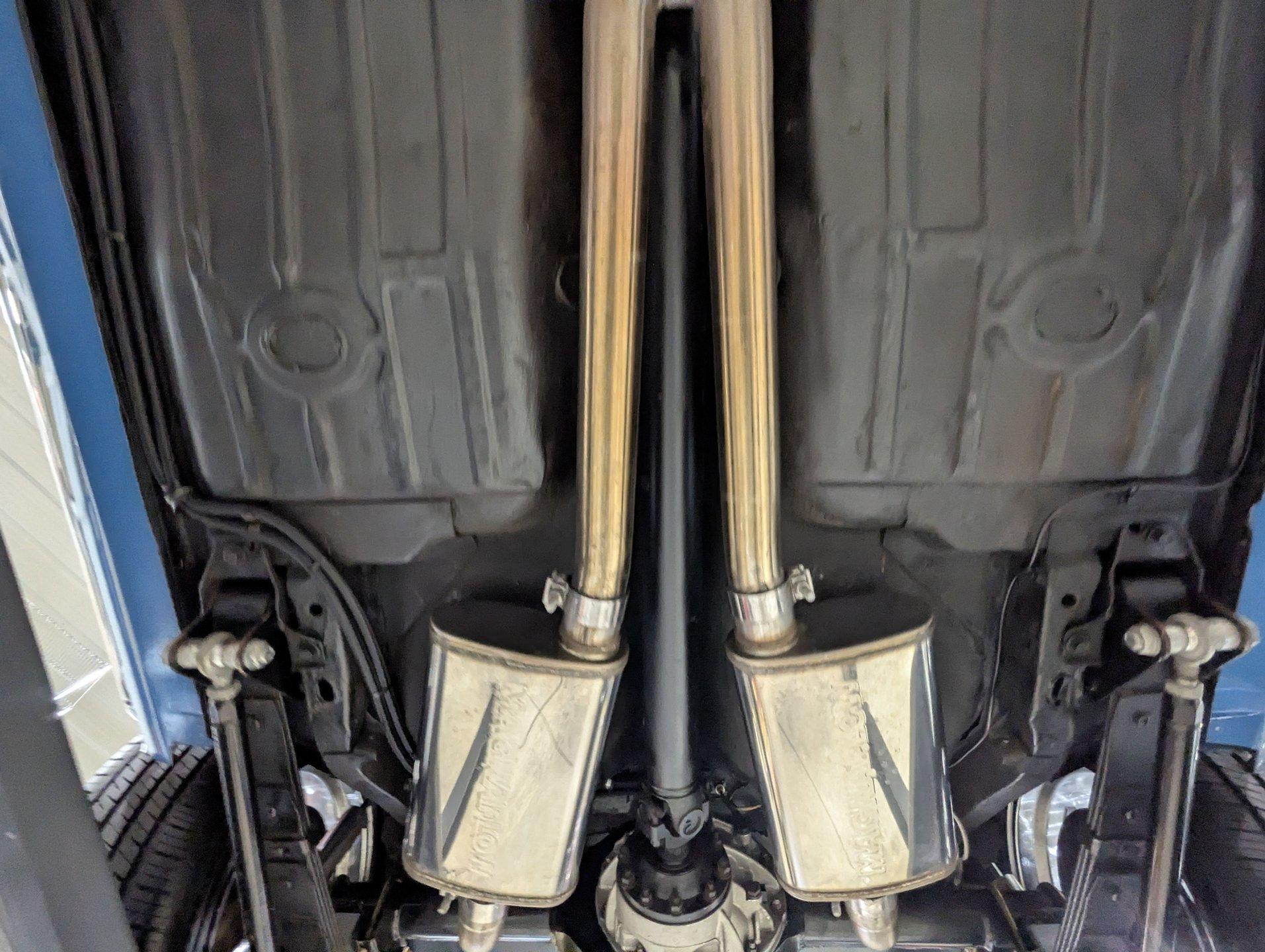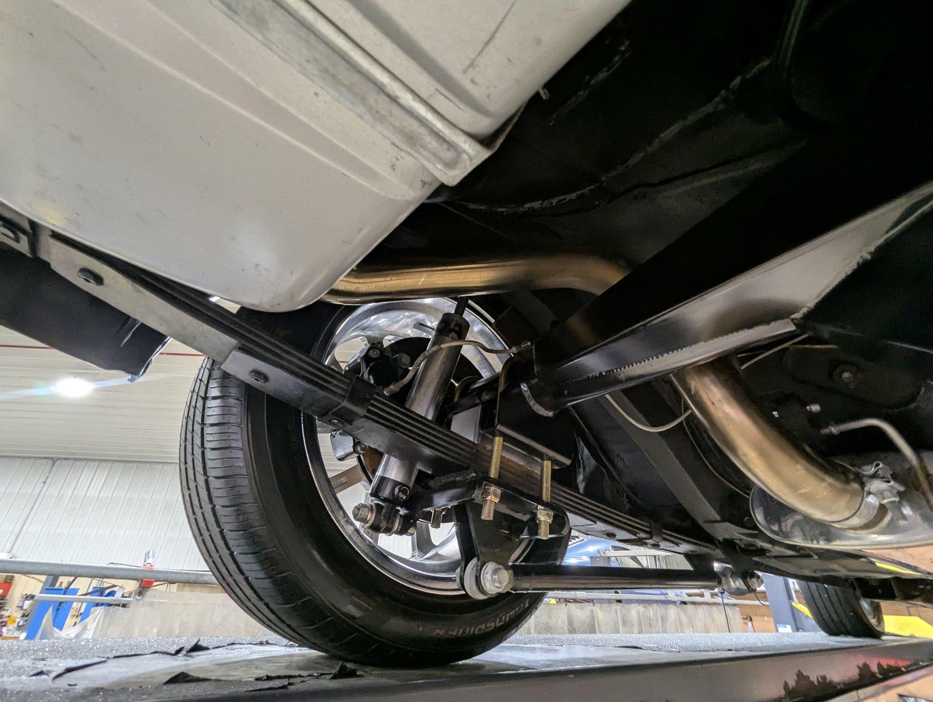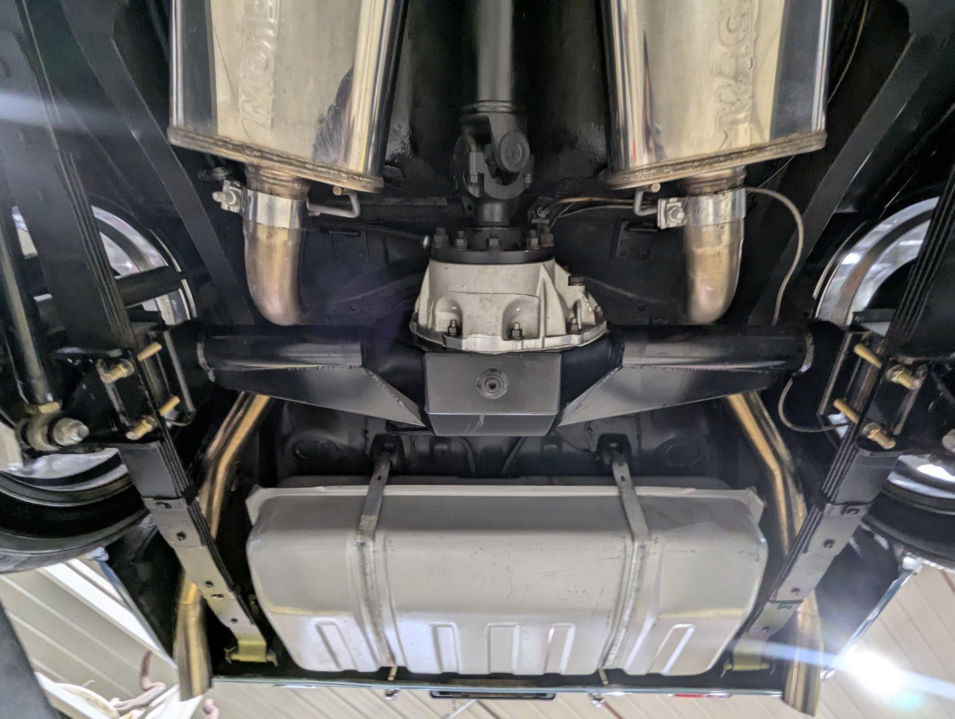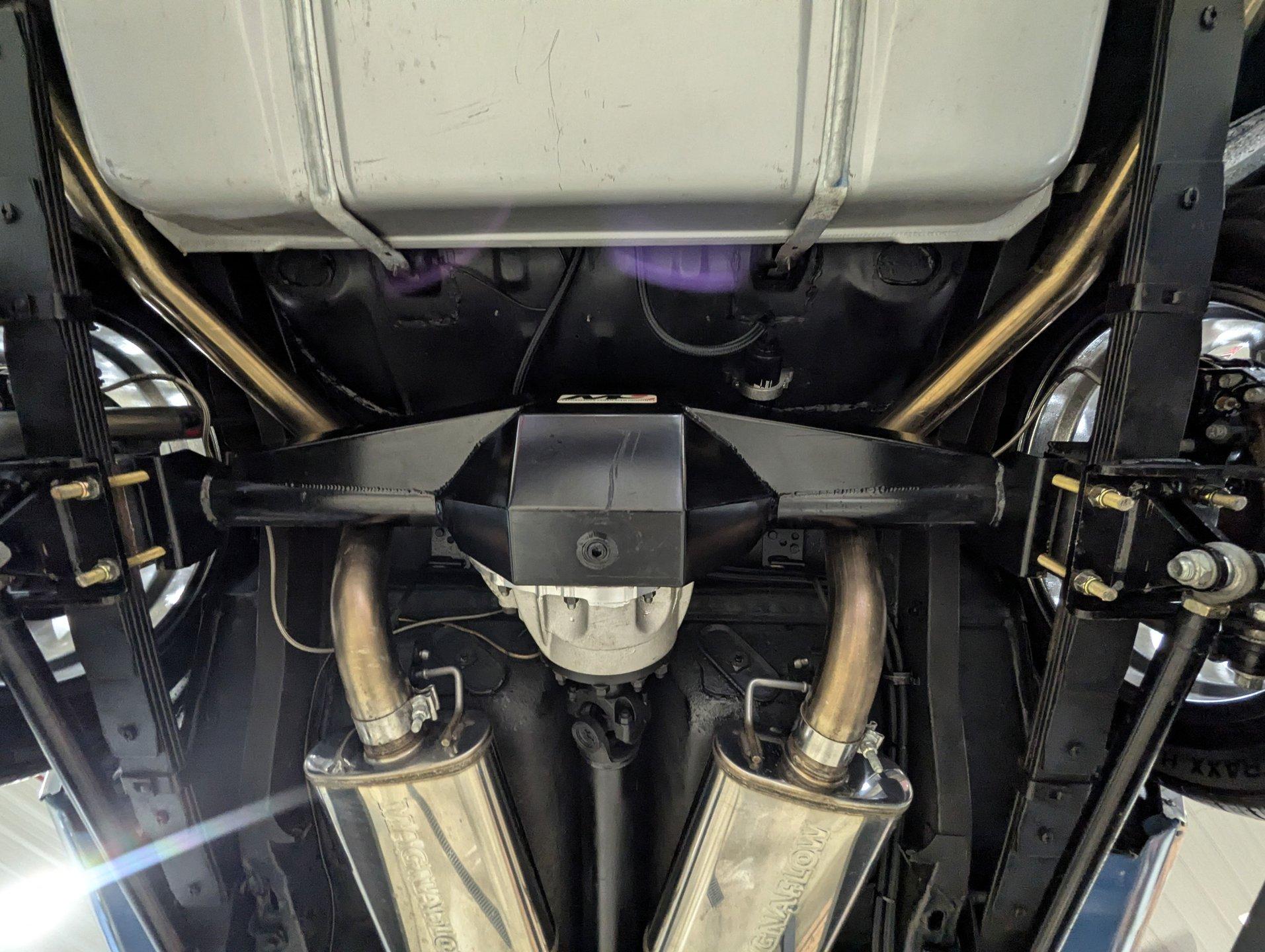 UNDERSIDE: It's been rebuilt and upgraded for performance. Up front, it has QA1 tubular control arms and coilover adjustable gas shocks. In back, it has new springs with lowering blocks, QA1 adjustable gas shocks, and tubular Cal Trac traction bars. The fuel system has been replaced and upgraded to support the fuel injected motor. It also has a great sounding stainless steel exhaust with an X-pipe and polished MagnaFlow mufflers. The brake system has been upgraded with disc brakes at all four wheels. Looking up at the motor, it has an extra capacity oil pan and a high torque starter. It's also upgraded with a 4L60E overdrive automatic transmission. A rebuilt driveshaft leads back to a heavy duty M9 rear end with 3.50 posi gears. The floors are solid metal.