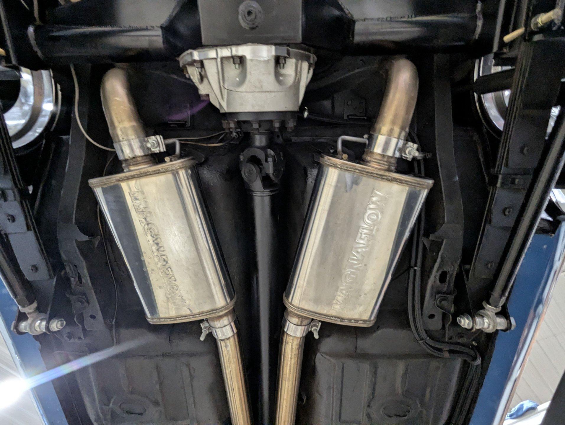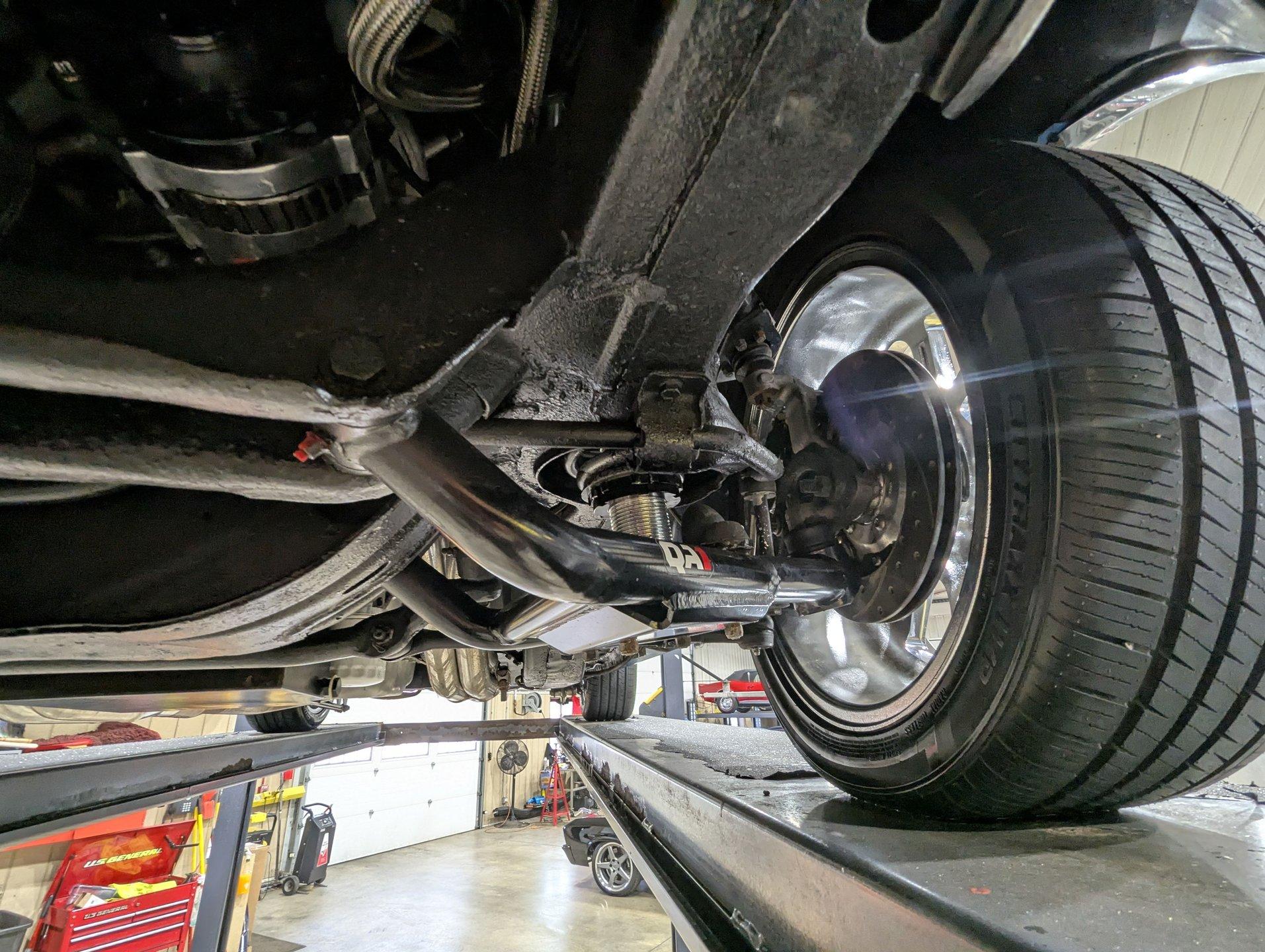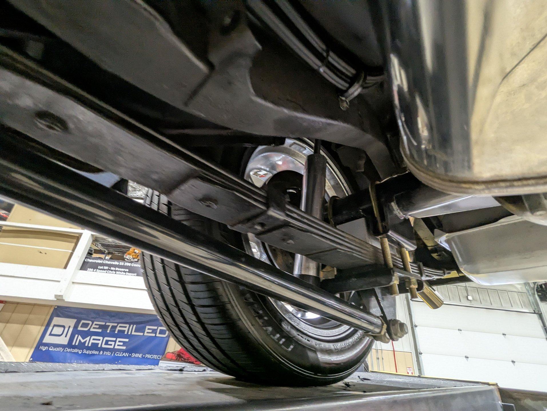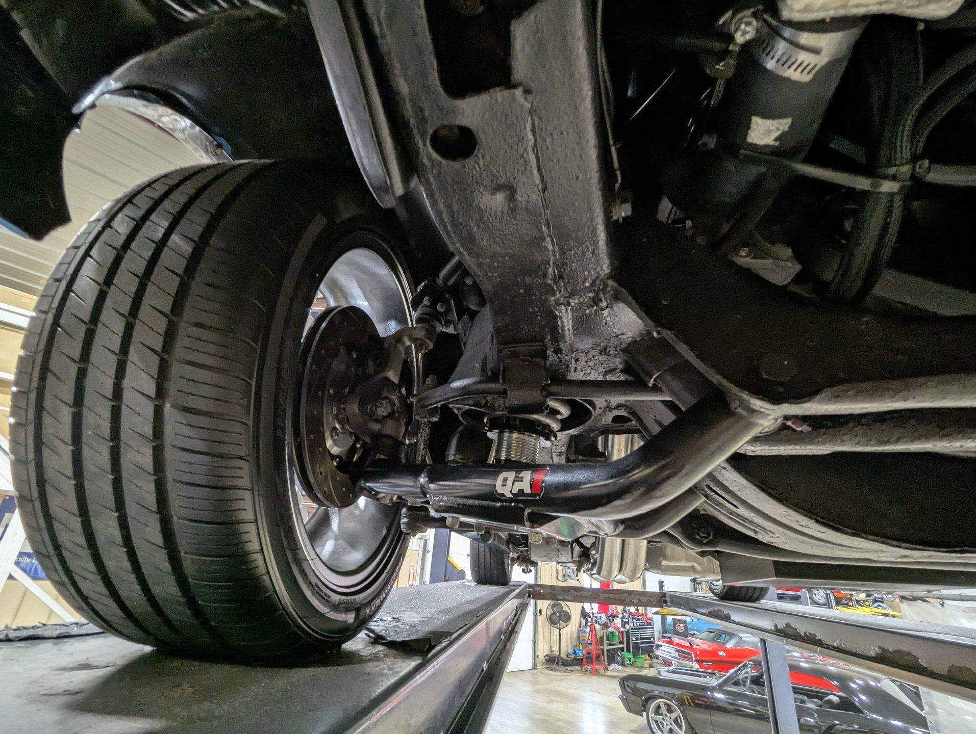 UNDERSIDE: It's been rebuilt and upgraded for performance. Up front, it has QA1 tubular control arms and coilover adjustable gas shocks. In back, it has new springs with lowering blocks, QA1 adjustable gas shocks, and tubular Cal Trac traction bars. The fuel system has been replaced and upgraded to support the fuel injected motor. It also has a great sounding stainless steel exhaust with an X-pipe and polished MagnaFlow mufflers. The brake system has been upgraded with disc brakes at all four wheels. Looking up at the motor, it has an extra capacity oil pan and a high torque starter. It's also upgraded with a 4L60E overdrive automatic transmission. A rebuilt driveshaft leads back to a heavy duty M9 rear end with 3.50 posi gears. The floors are solid metal.
