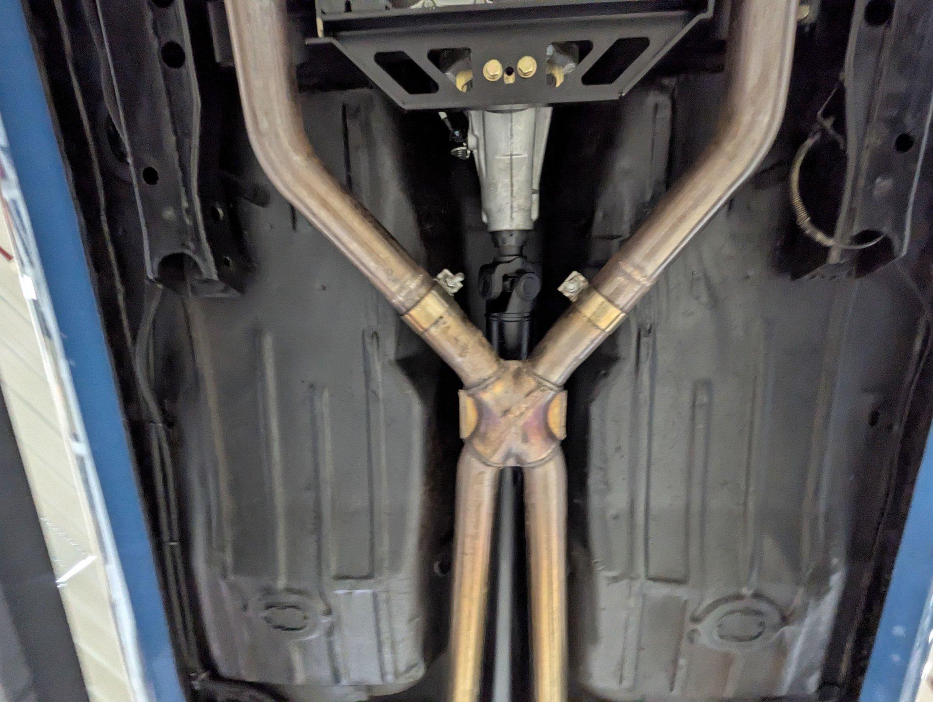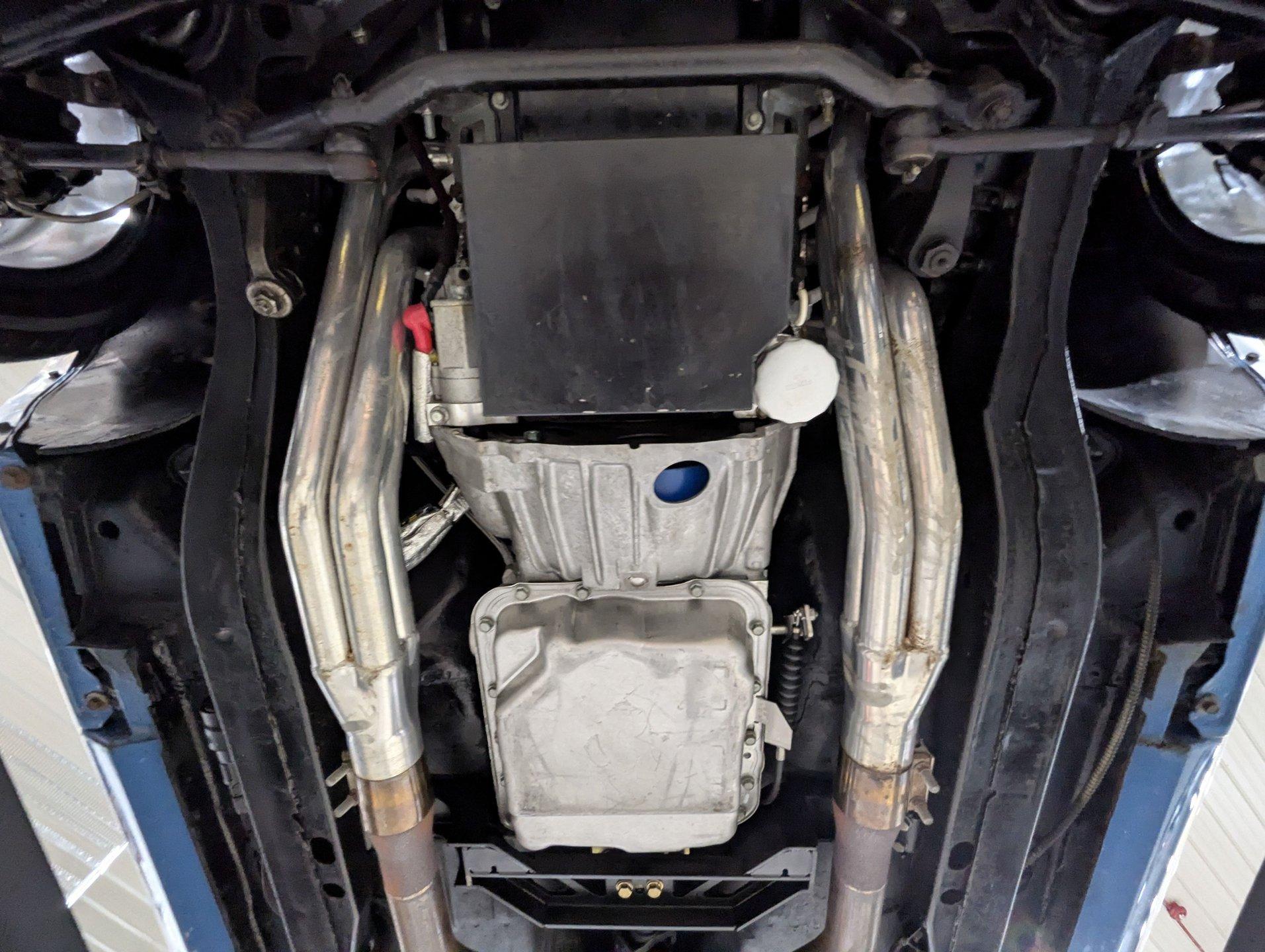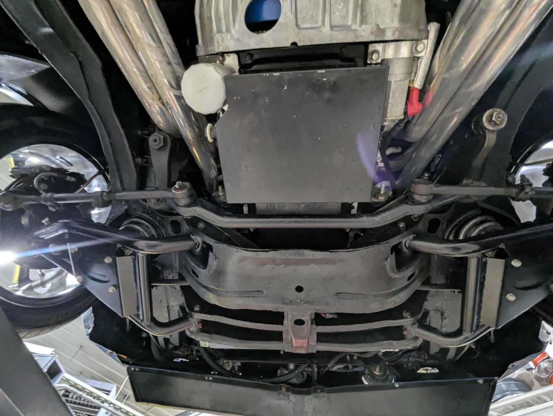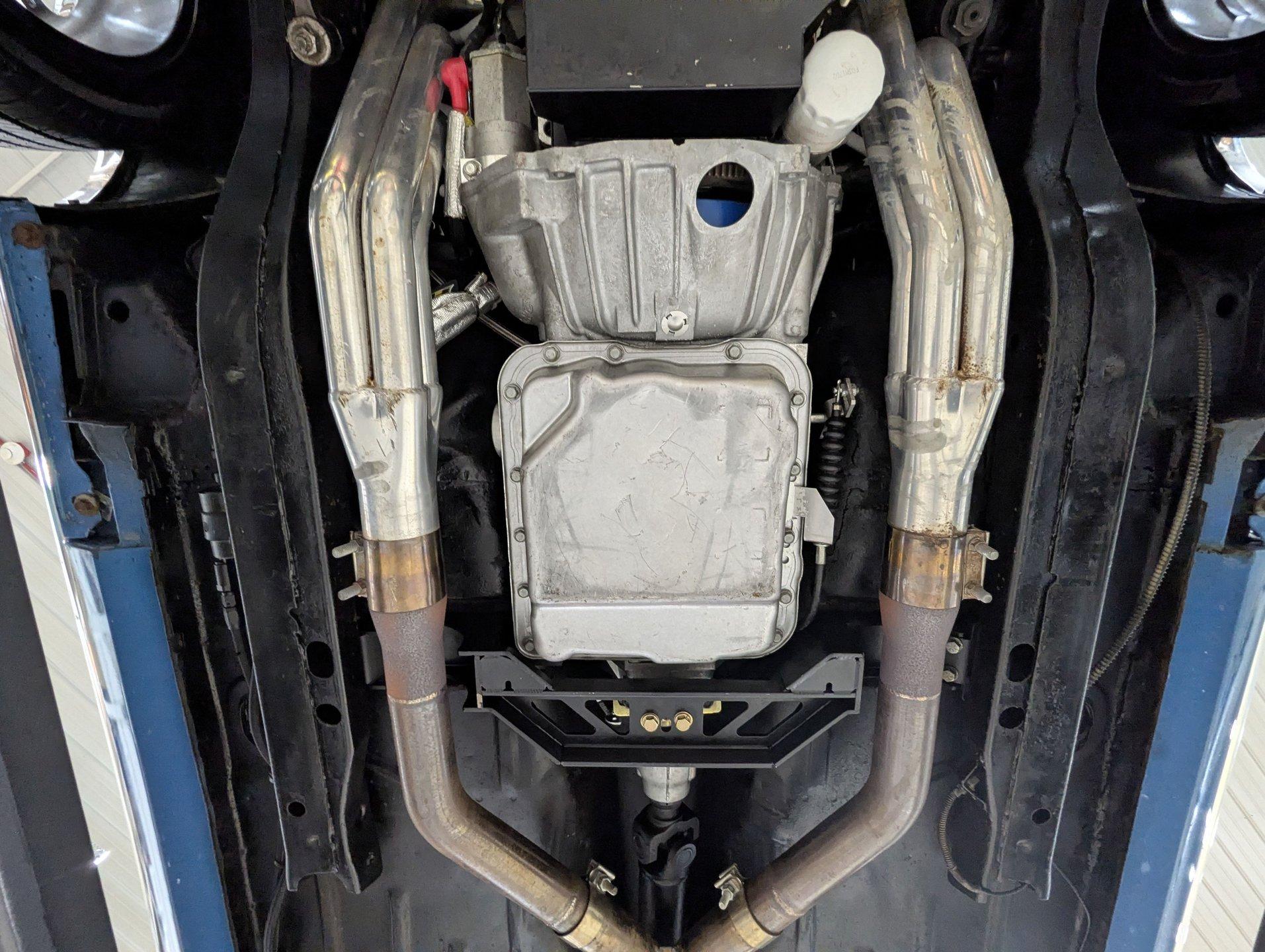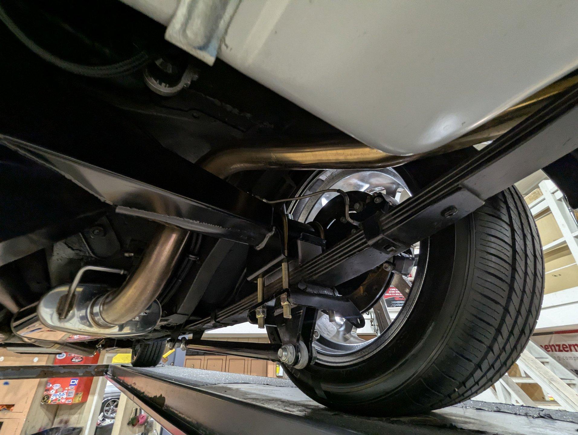 UNDERSIDE: It's been rebuilt and upgraded for performance. Up front, it has QA1 tubular control arms and coilover adjustable gas shocks. In back, it has new springs with lowering blocks, QA1 adjustable gas shocks, and tubular Cal Trac traction bars. The fuel system has been replaced and upgraded to support the fuel injected motor. It also has a great sounding stainless steel exhaust with an X-pipe and polished MagnaFlow mufflers. The brake system has been upgraded with disc brakes at all four wheels. Looking up at the motor, it has an extra capacity oil pan and a high torque starter. It's also upgraded with a 4L60E overdrive automatic transmission. A rebuilt driveshaft leads back to a heavy duty M9 rear end with 3.50 posi gears. The floors are solid metal.