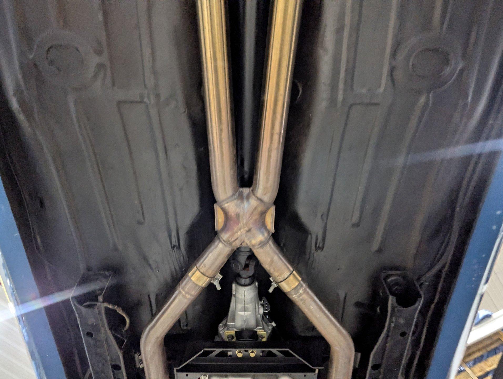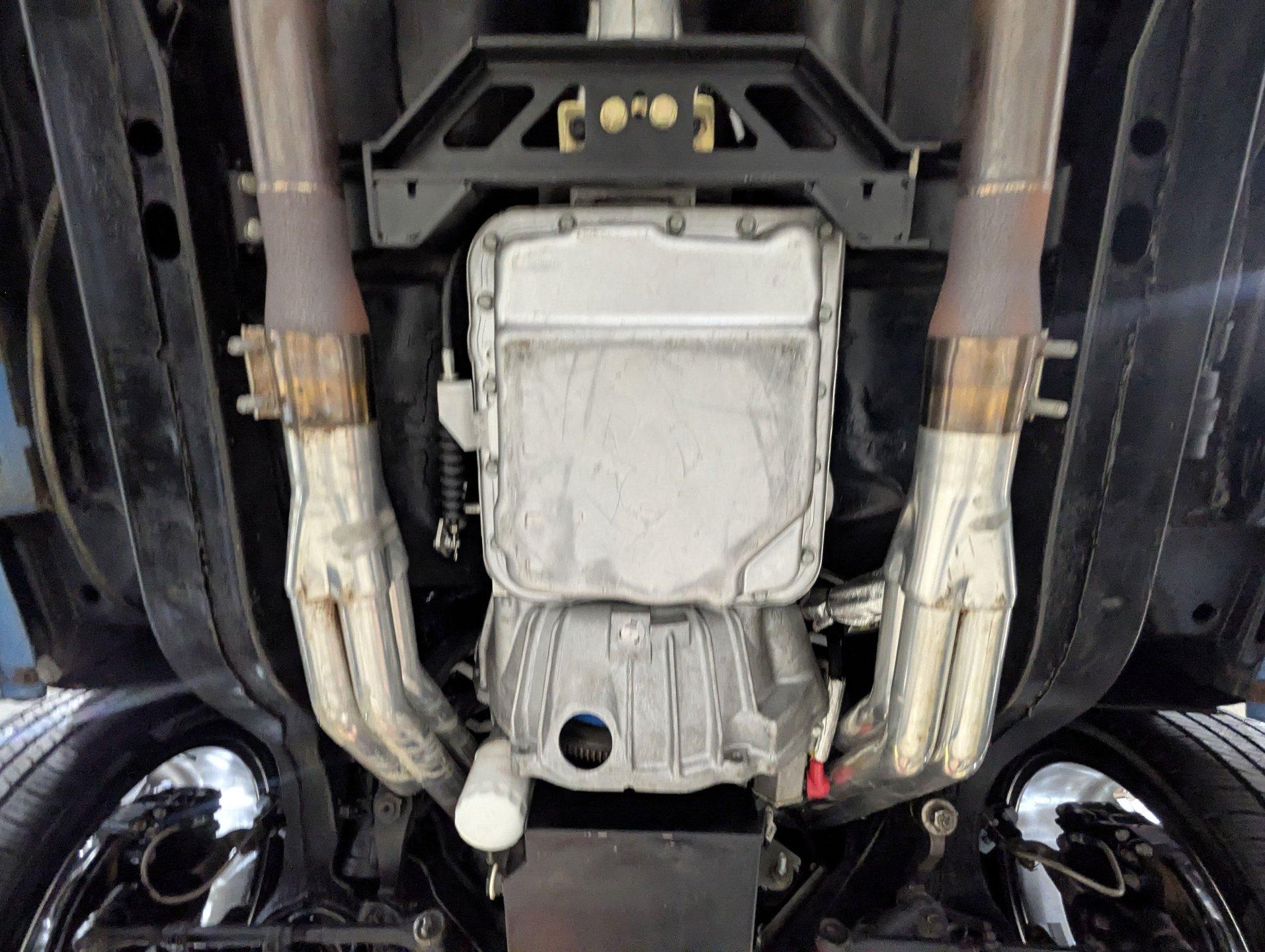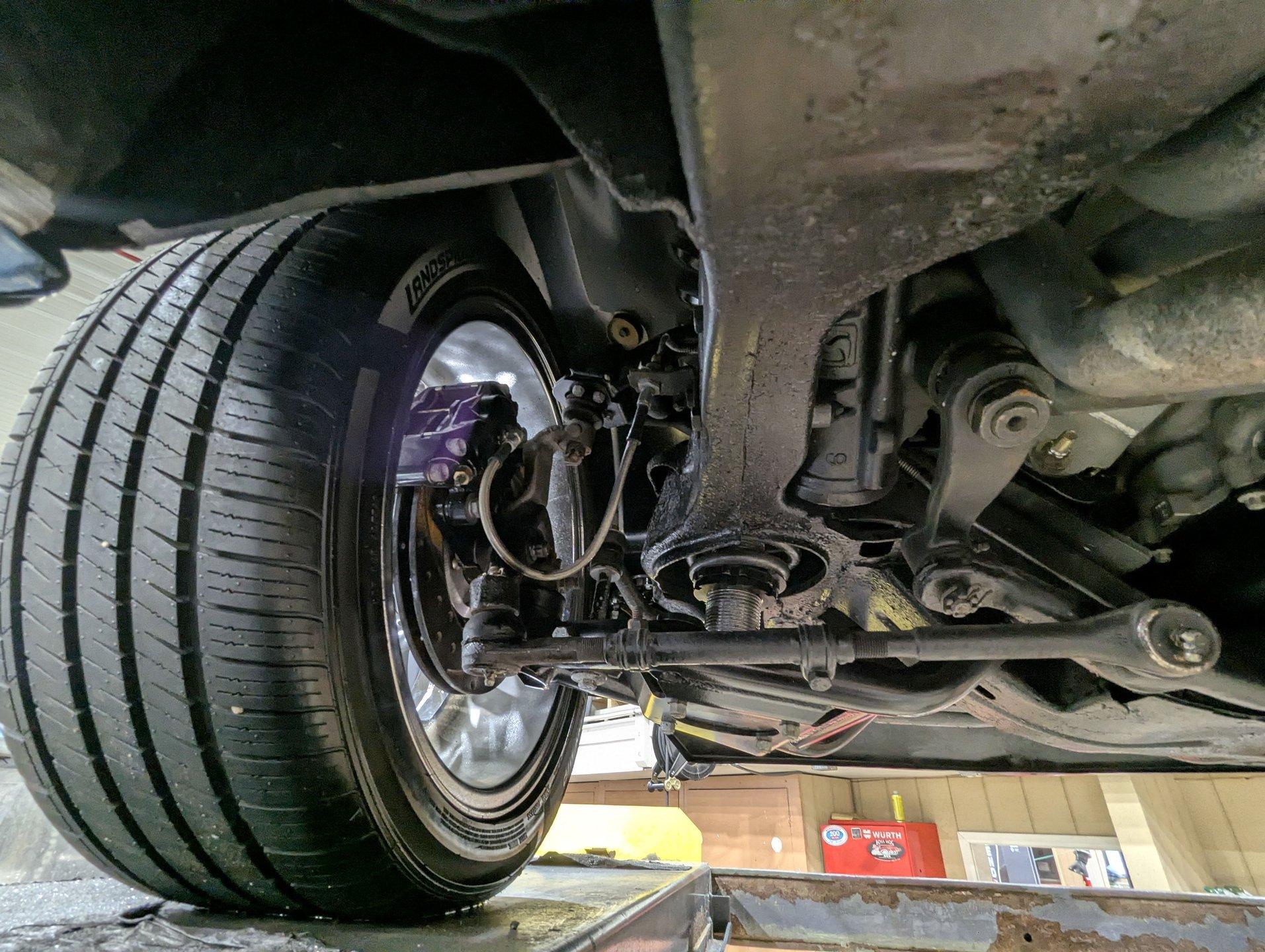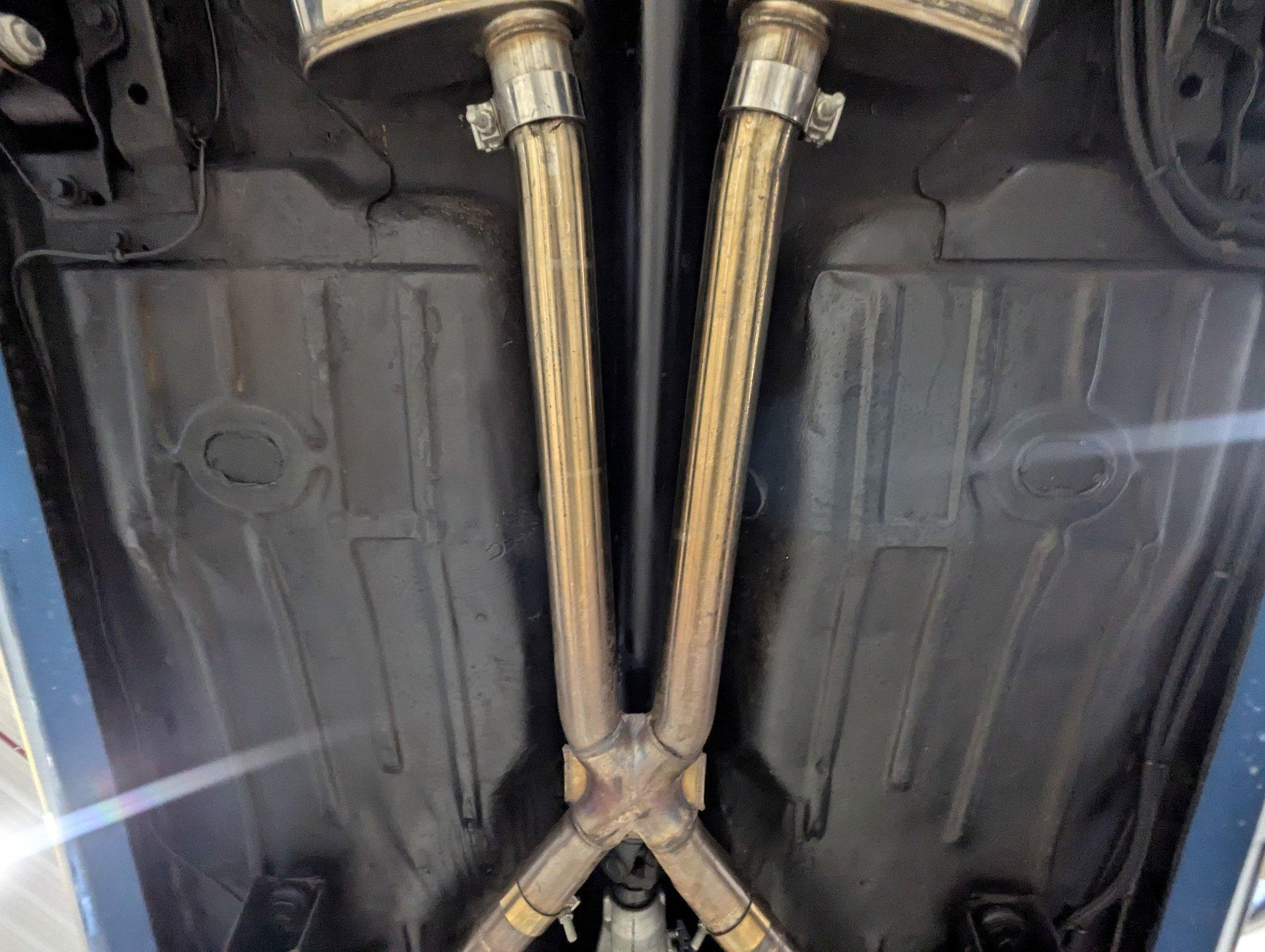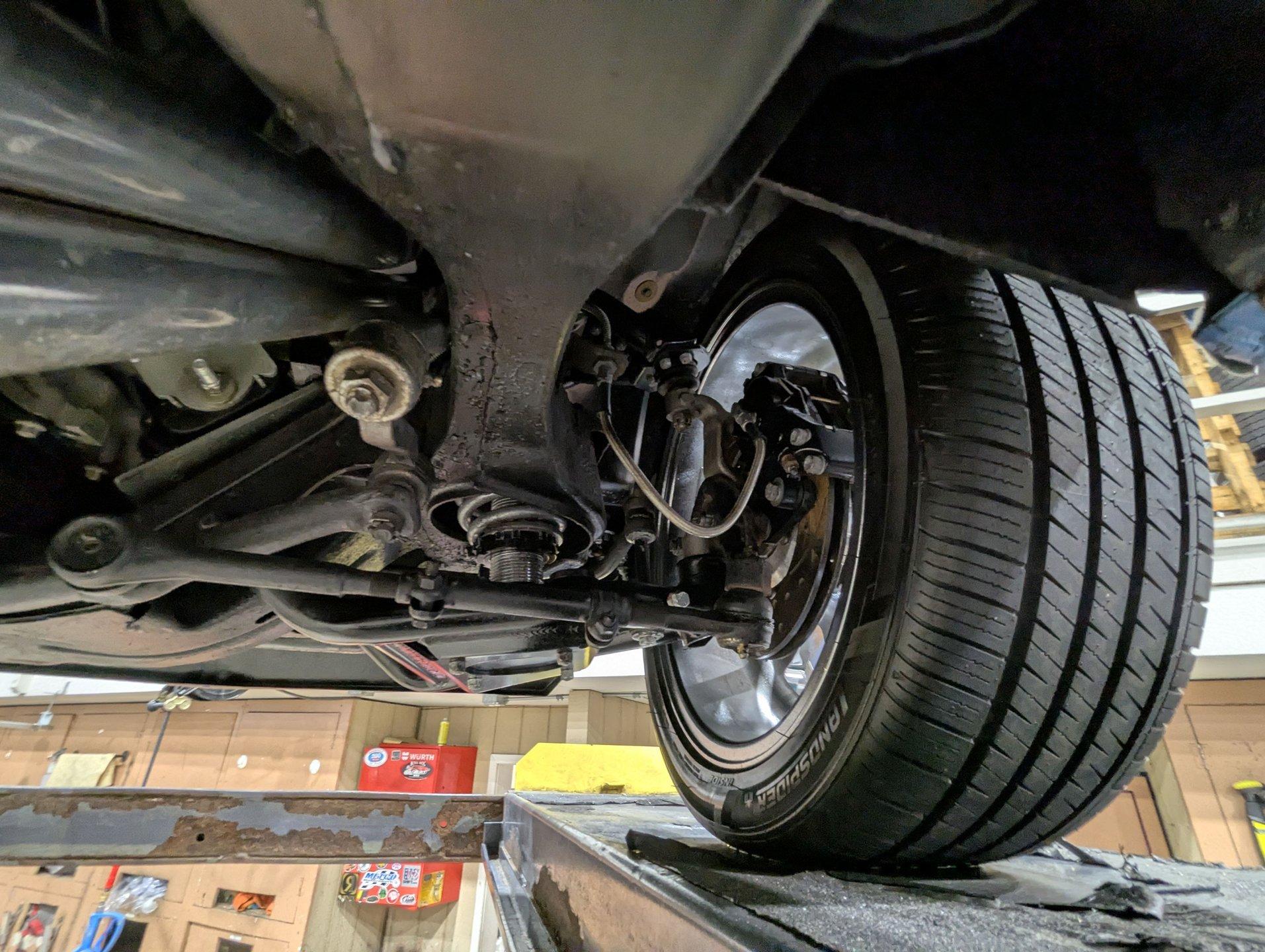 UNDERSIDE: It's been rebuilt and upgraded for performance. Up front, it has QA1 tubular control arms and coilover adjustable gas shocks. In back, it has new springs with lowering blocks, QA1 adjustable gas shocks, and tubular Cal Trac traction bars. The fuel system has been replaced and upgraded to support the fuel injected motor. It also has a great sounding stainless steel exhaust with an X-pipe and polished MagnaFlow mufflers. The brake system has been upgraded with disc brakes at all four wheels. Looking up at the motor, it has an extra capacity oil pan and a high torque starter. It's also upgraded with a 4L60E overdrive automatic transmission. A rebuilt driveshaft leads back to a heavy duty M9 rear end with 3.50 posi gears. The floors are solid metal.