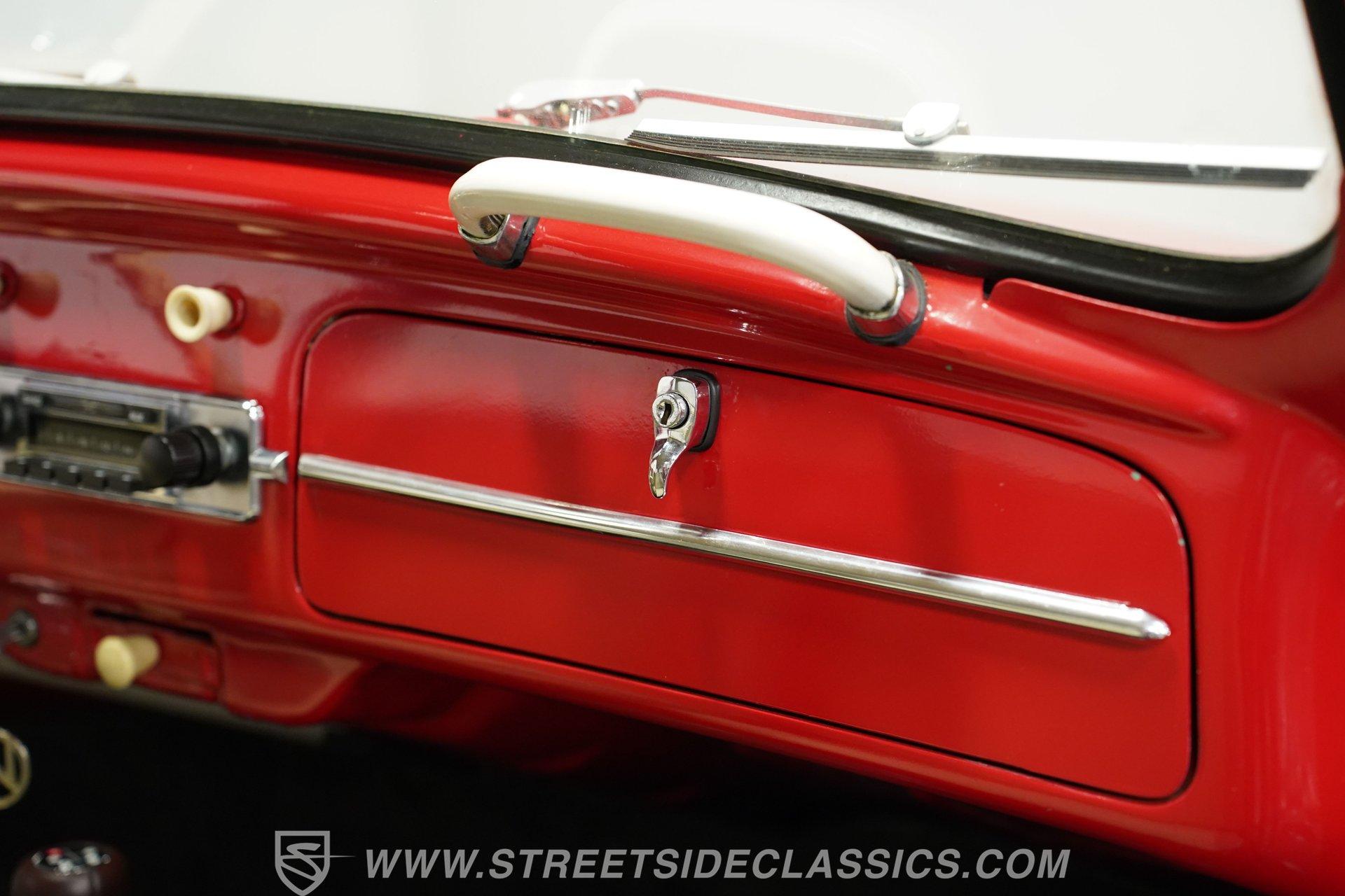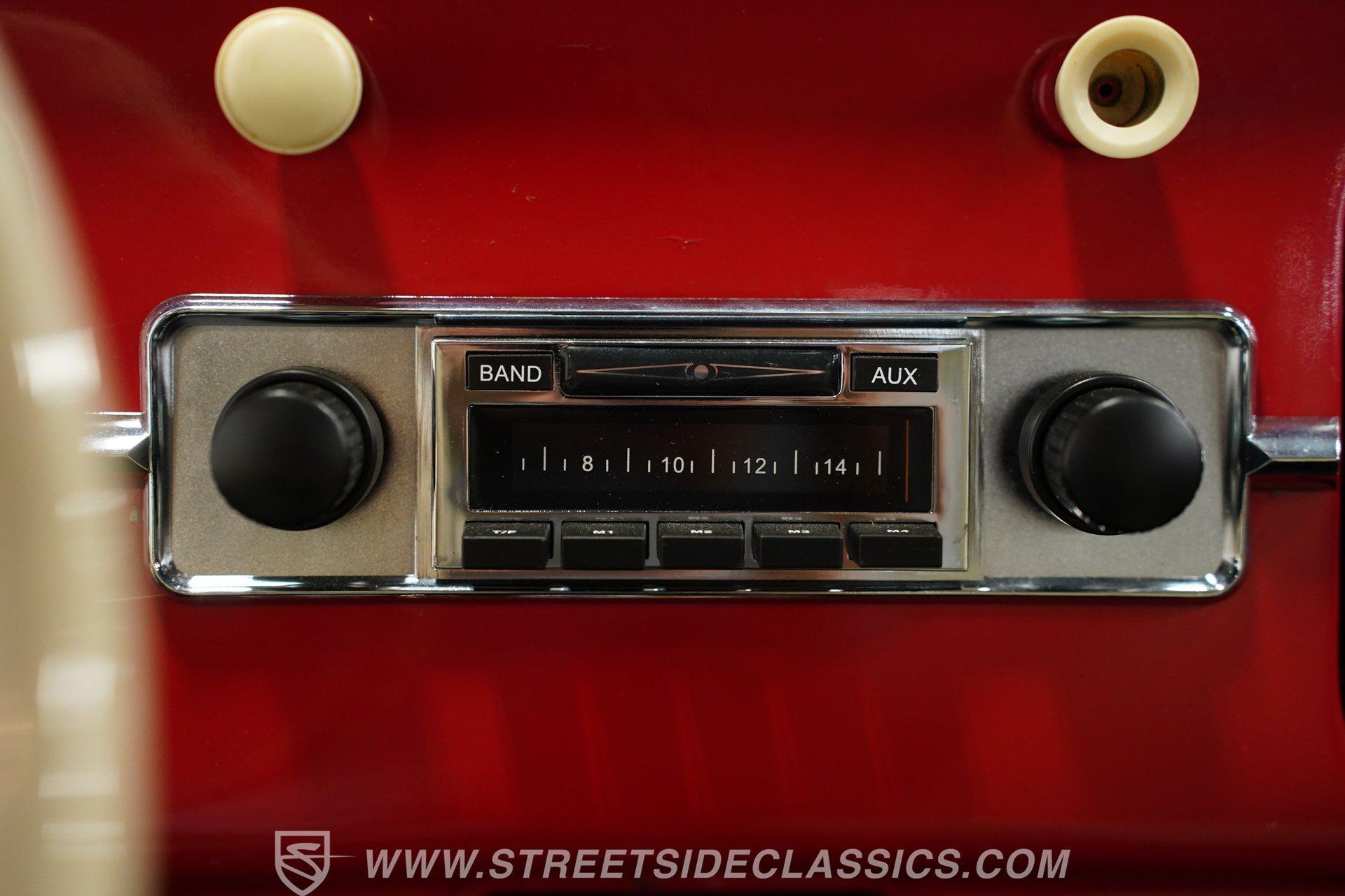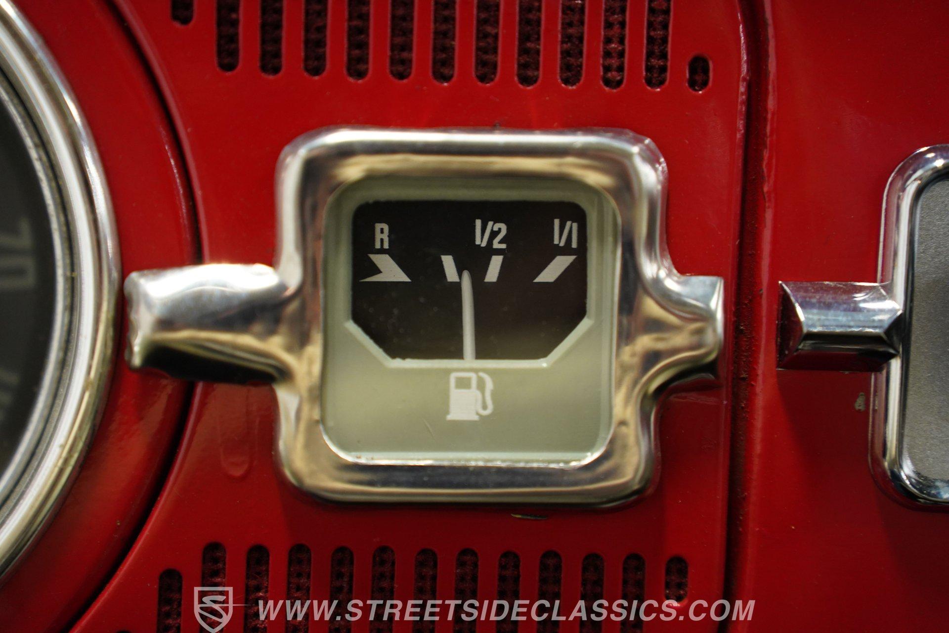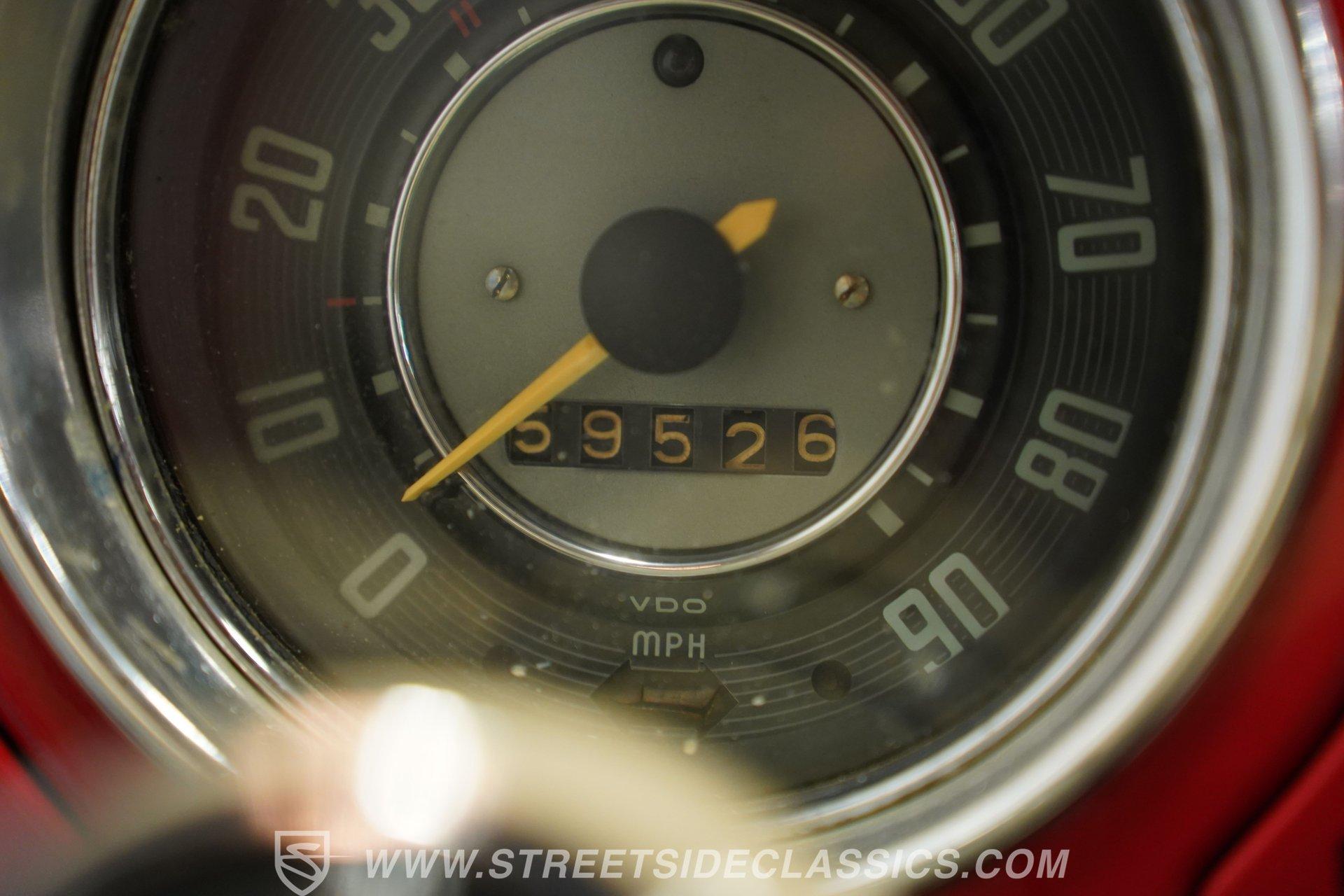 The interior is in pretty good shape, with comfy beige and off-white seats and matching door panels. The red dashboard matches the exterior paint and showcases an original-style VDO tachometer, gas gauge, and what appears to be an upgraded AM/FM radio. The carpets look decent and are protected by heavy-duty diamond plate floor mats. There is a locking glove box for storage, along with more storage in the front trunk that also has a diamond plate floor mat and a spare tire area.