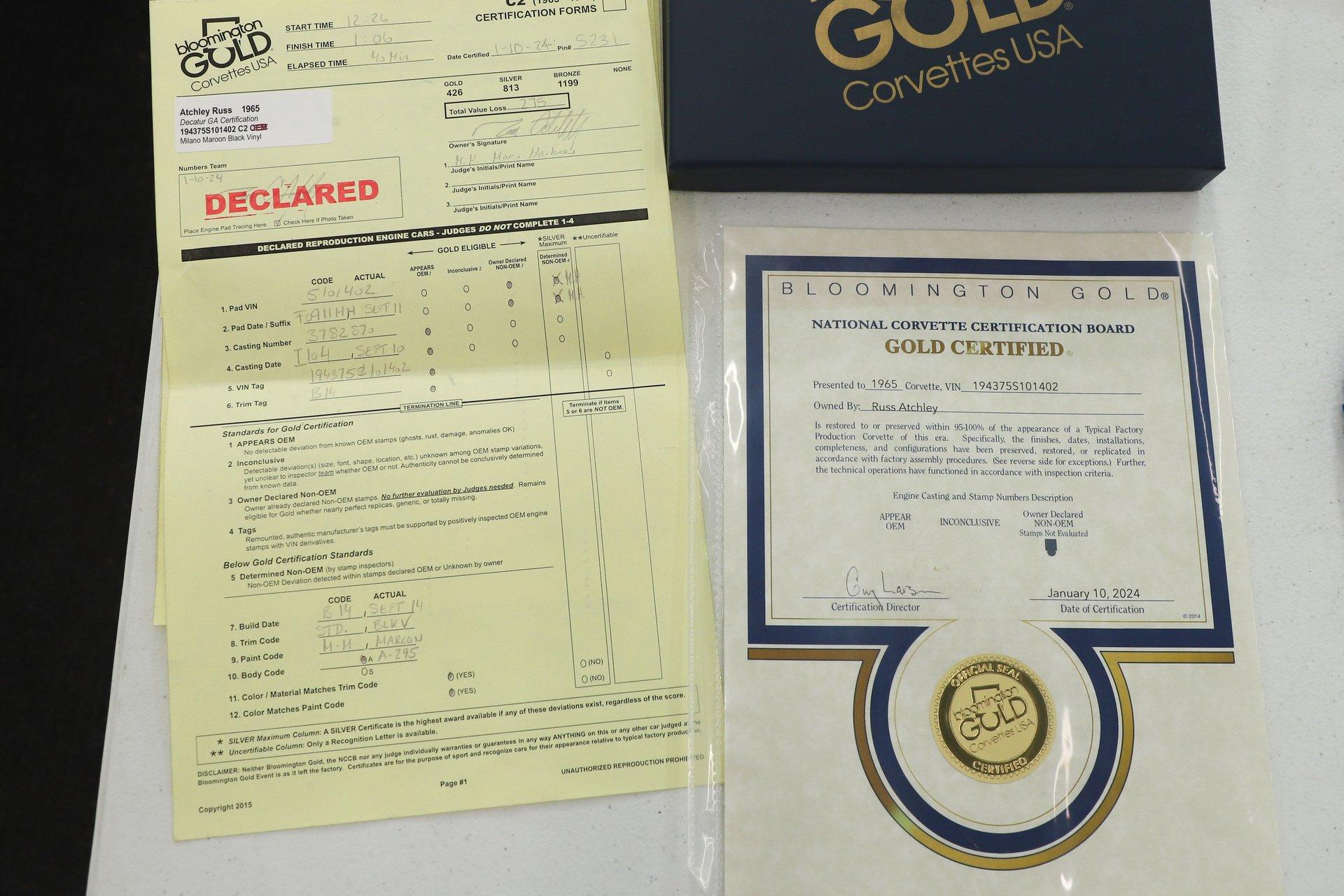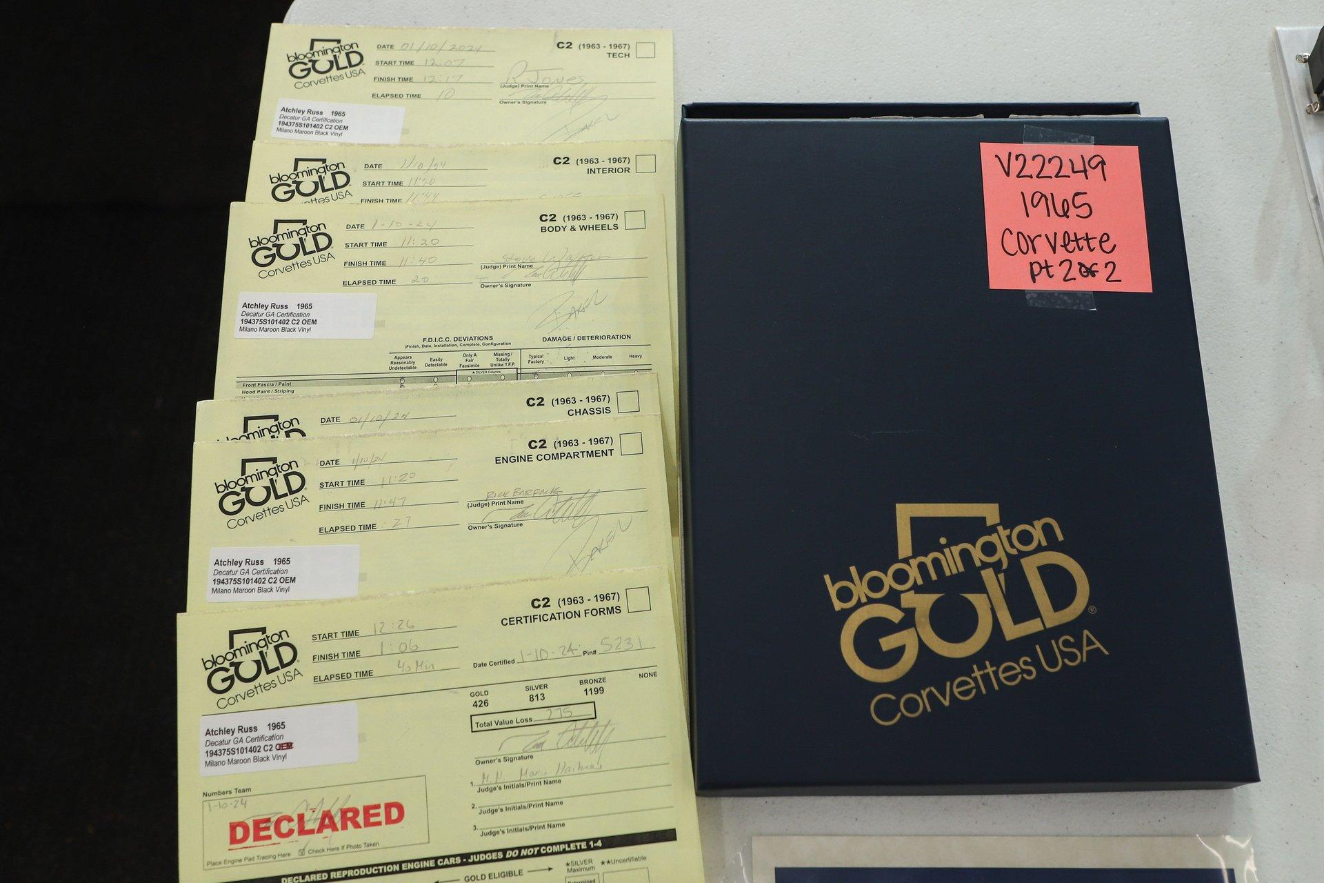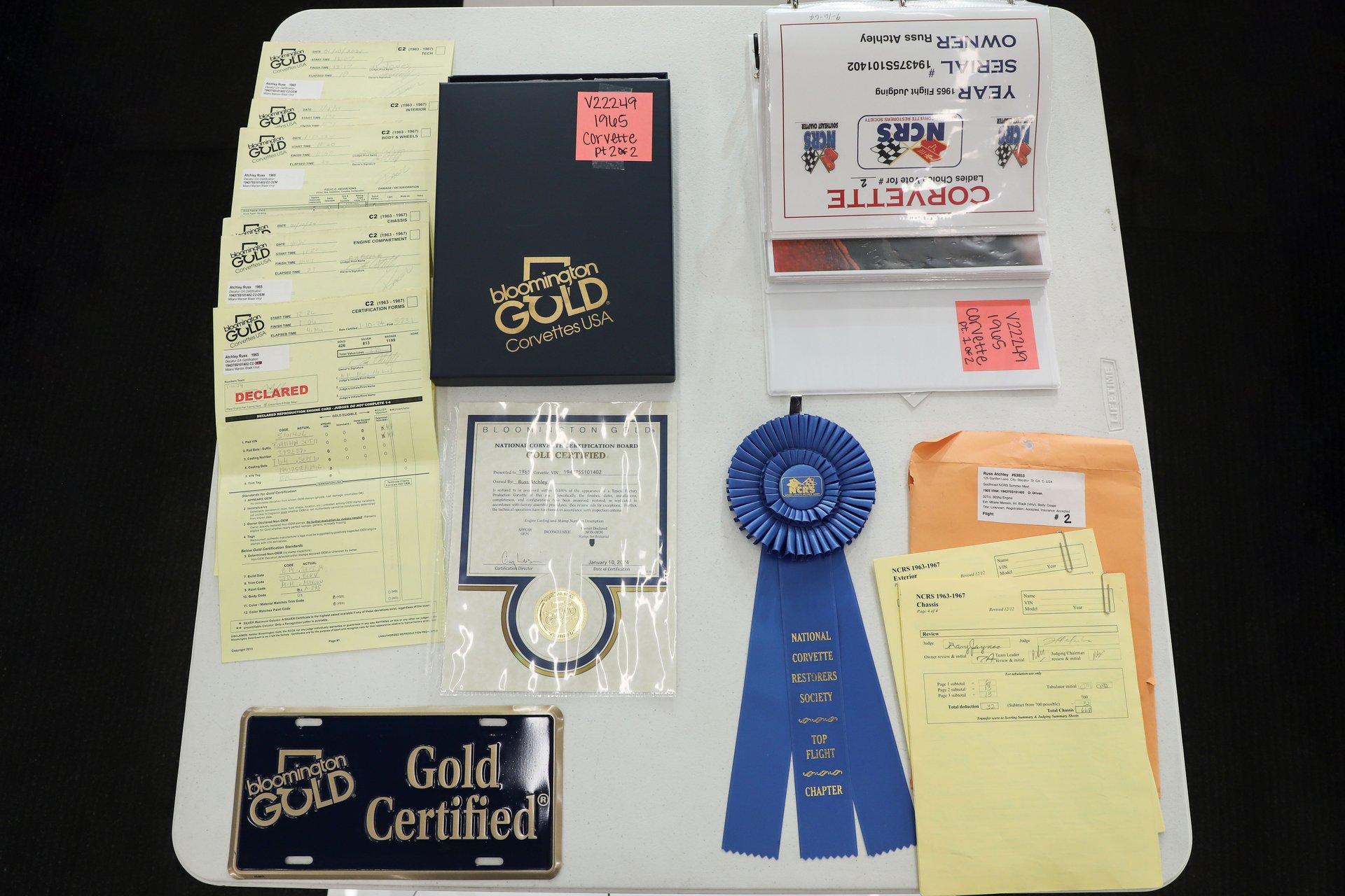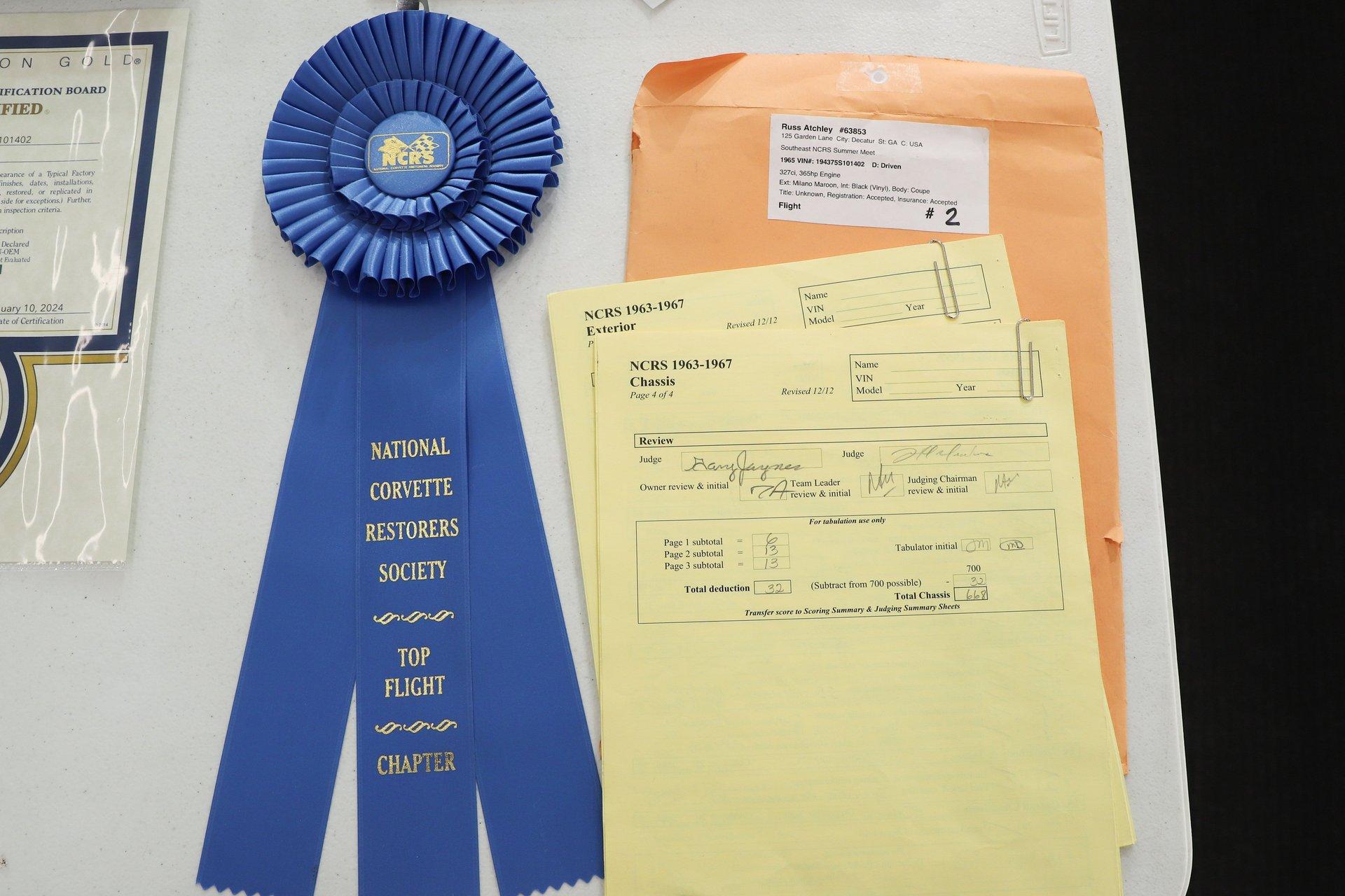 INTRODUCTION: This #s matching Corvette has been restored to an exceptionally authentic standard. The body off frame restoration was completed with the clear intent of presenting the car for judging, and that effort proved highly successful after being scrutinized and inspected by numerous expert judges. It recently earned both the prestigious NCRS Top Flight Award and Bloomington Gold Award honors. The judging sheets, awards, and restoration receipts will be included with the car.