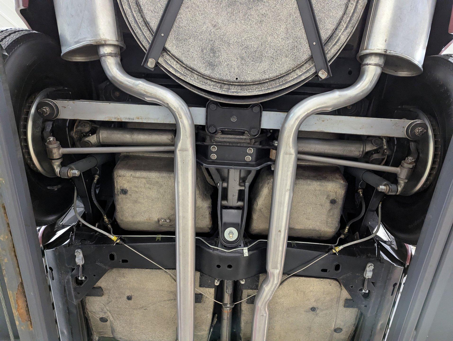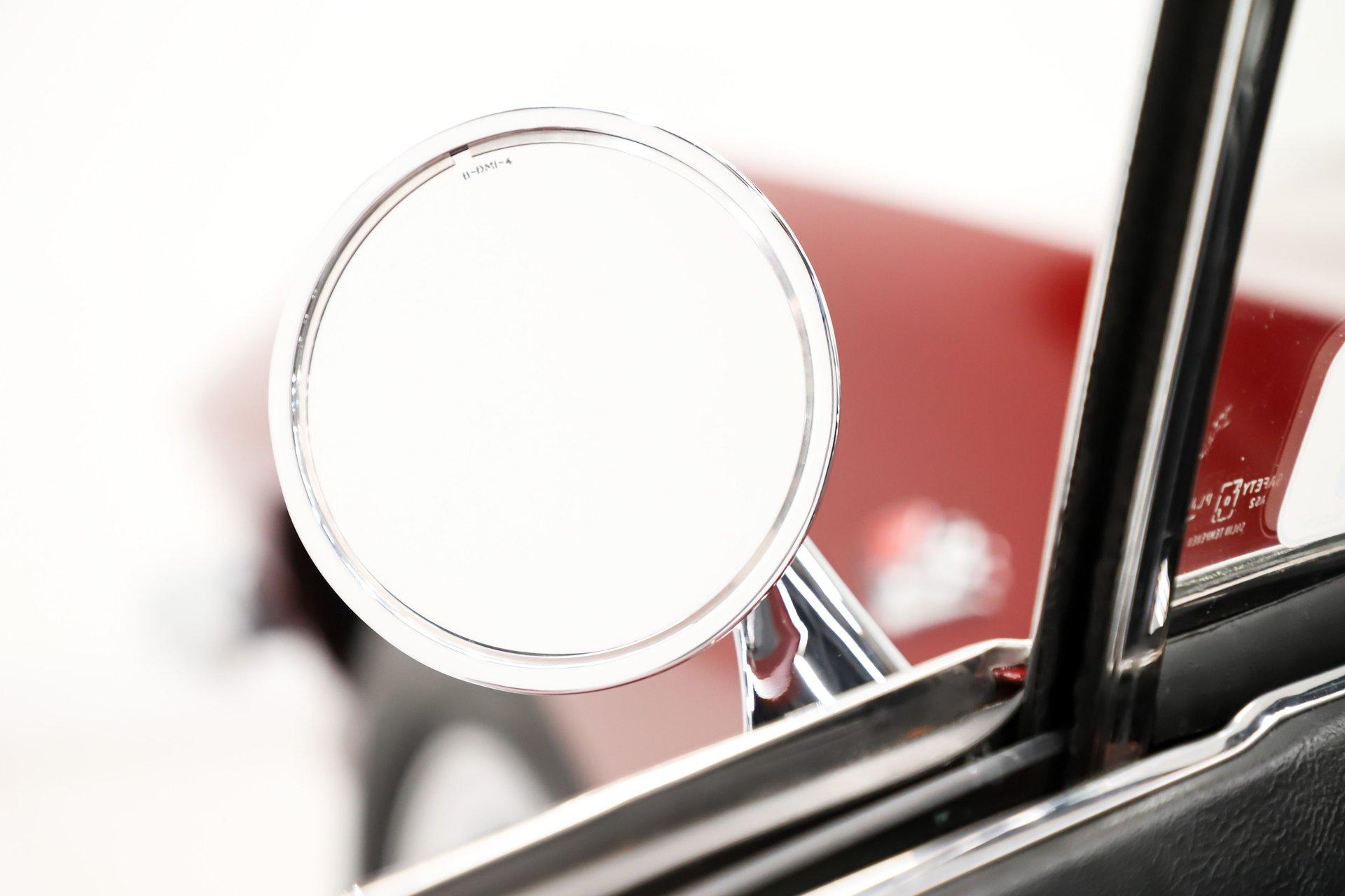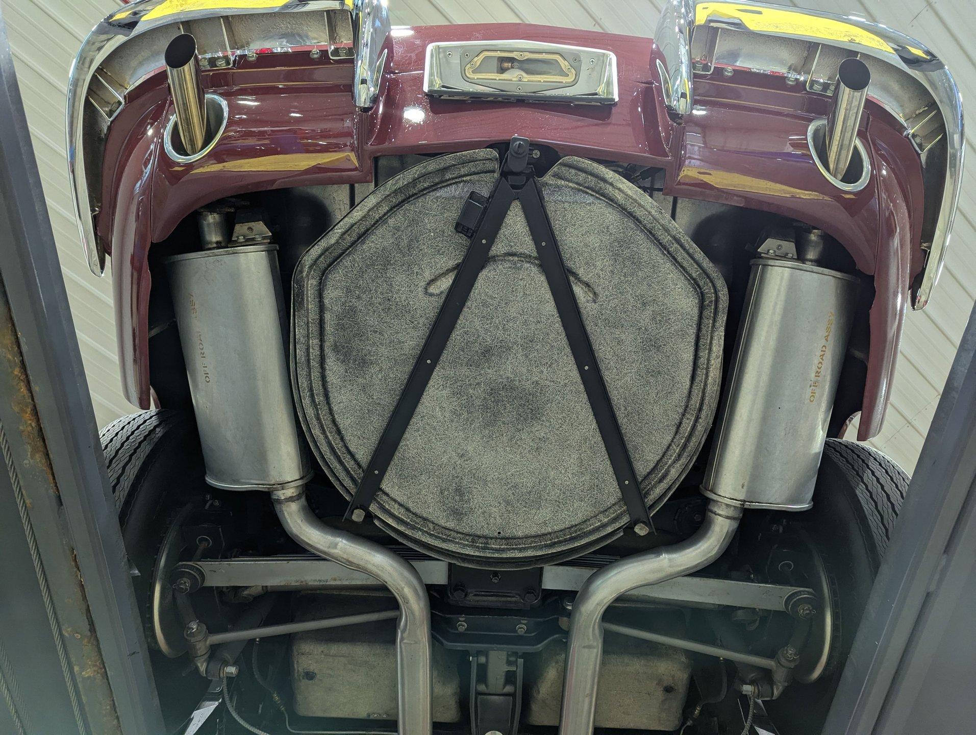 EXTERIOR: This beautiful coupe design looks every bit as good as the day it rolled off the assembly line. The body is outstanding- straight, and showing no signs of damage, I couldn't find even a stress crack. The headlight doors fit the body better than any I've ever seen, and they open and close properly. The doors fit great as well and open and close effortlessly. It was repainted in its original Milano Maroon, with the fine metallic laid out evenly and polished to the proper shine. It appears that all of the chrome and trim has been replaced. Even the glass was replaced and features the correct markings. The jambs are properly sprayed in a correct duller finish, and the weatherstrips have been replaced. It's rolling on correct blackwall reproduction tires wrapped around spinner hubcaps, completing the authentic factory look.