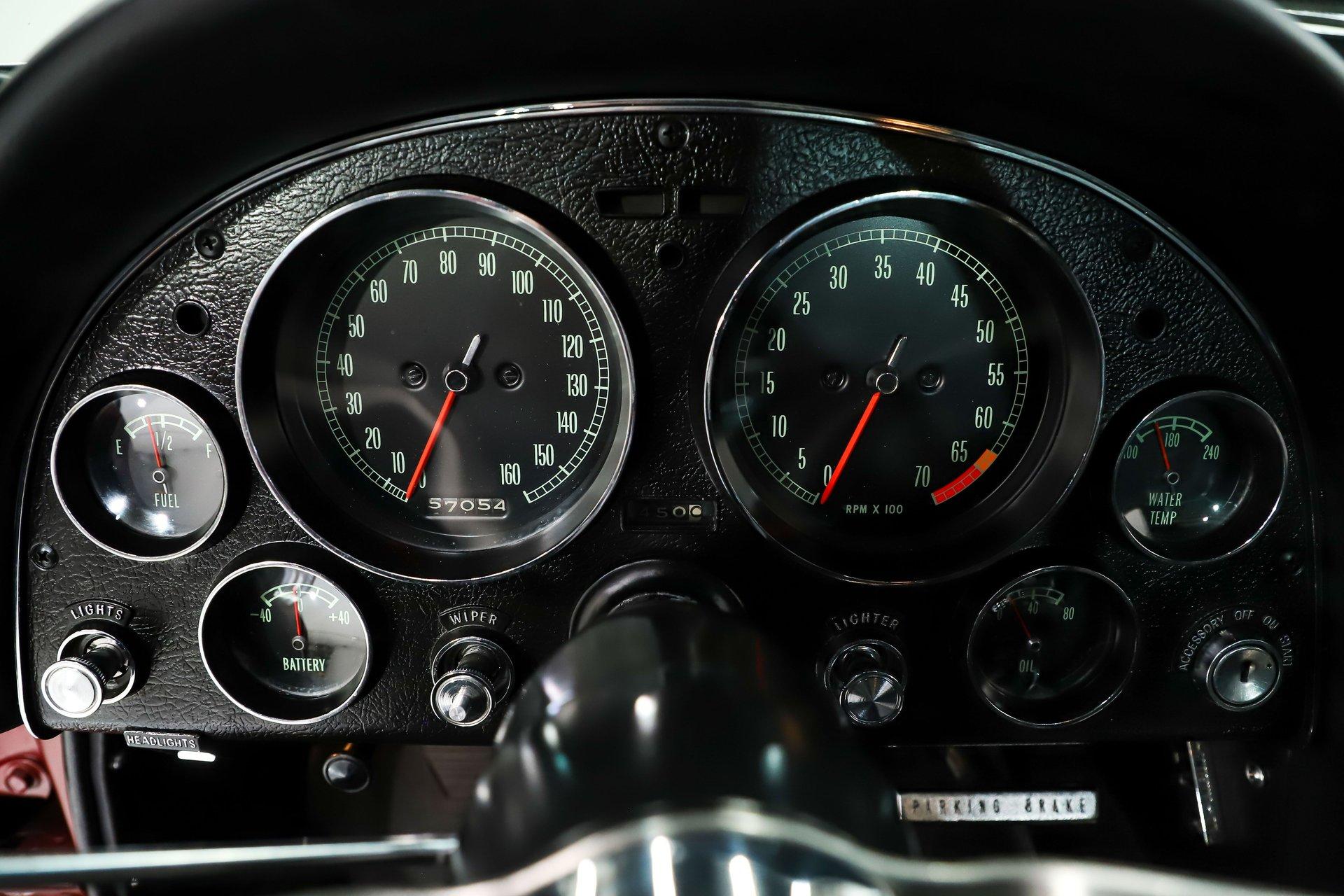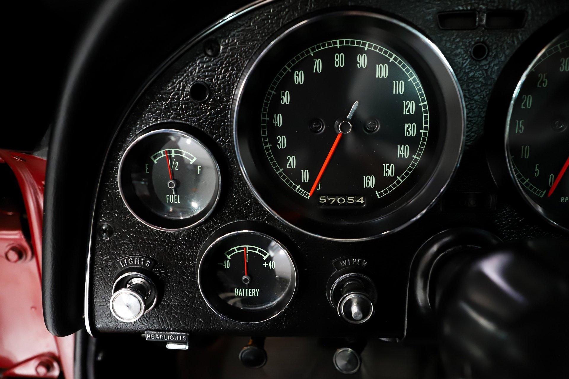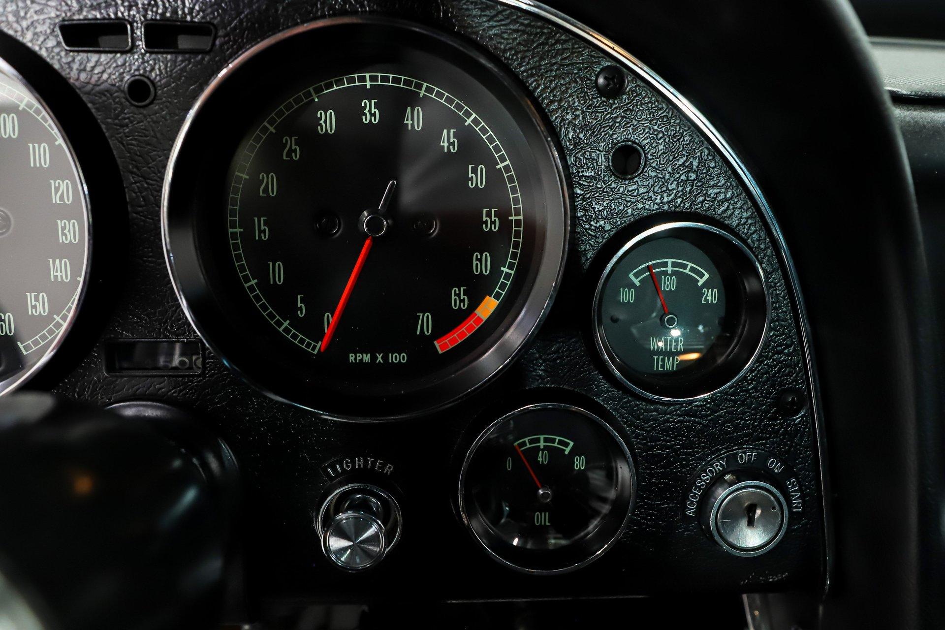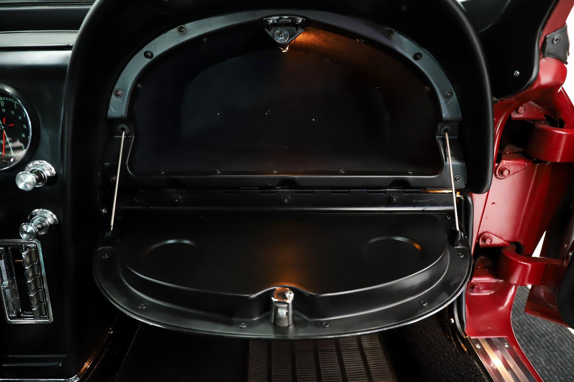 INTERIOR: I'm sitting in what may be the nicest C2 Corvette interior I've ever experienced. Everywhere I look- every nook and cranny- the fit and finish is like brand new, reflecting the quality expected of a judged show car. The gauges have been professionally restored, including the correct 6,500 rpm redline tachometer. Even the clock has been restored using its original movement rather than a quartz conversion, so it ticks exactly as it should. It features a factory AM/FM radio with a power antenna. The glovebox door, liner, and dash pads are all in mint condition. The center console is excellent, complete with the correct reverse lockout shifter, while the bowtie seat belts present beautifully. Fresh carpet runs front to back with an excellent fit and includes reproduction floor mats. The seats have been completely rebuilt with new cushioning and upholstery, showing no wrinkles or marks. The door panels and hardware look brand new. All trim pieces, steering wheel, visors, and the mirror are in excellent condition. The interior lights are functional, and it even retains the correct jack in the storage compartment behind the seat.