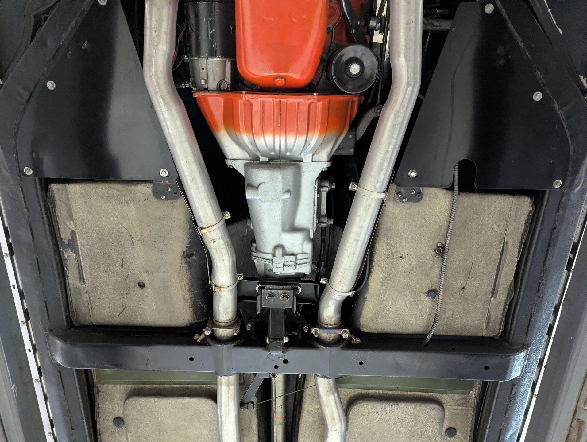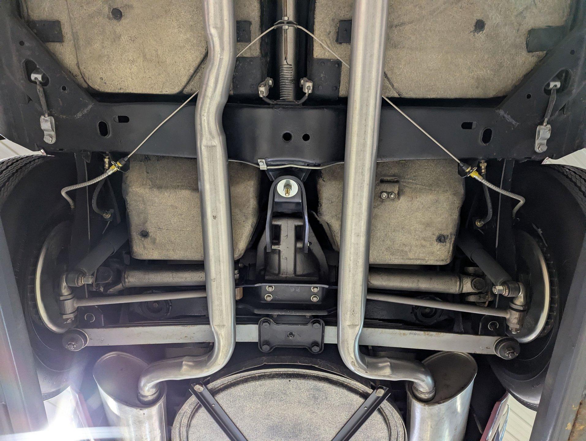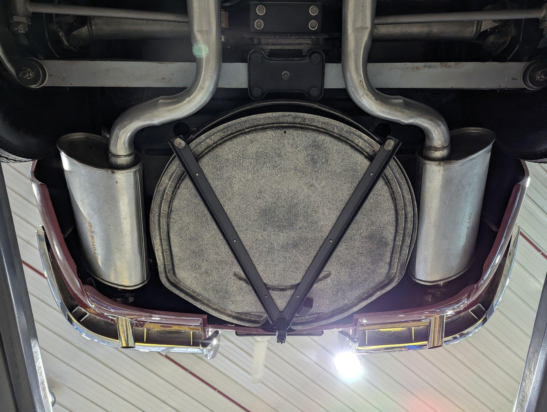 UNDERSIDE: The body was removed from the frame, and every component was rebuilt and restored to factory specifications. The fully independent front and rear suspension has been completely rebuilt and carefully detailed, along with the steering system. As the first year for four wheel disc brakes, the 1965 Chevrolet Corvette is especially desirable, and every part of the brake system has been replaced, including the lines and e-brake assembly. It features a factory correct reproduction off-road exhaust, with mufflers properly stamped “off-road,” giving the car a deeper, more muscular tone. Looking up at the engine, it is spotless in correct Chevy Orange and fitted with the proper canister oil filter, correct starter, and lower ignition shielding. The correctly numbered Muncie 4-speed trans has been properly rebuilt and detailed, while the restored driveshaft leads to the correctly dated Positraction rear end with 3.70 gears. The frame and chassis components wear a smooth semi-gloss finish, and the fiberglass floors are pristine in their natural raw state, just as they should be. Even the spare tire carrier is complete, right down to the original lock.