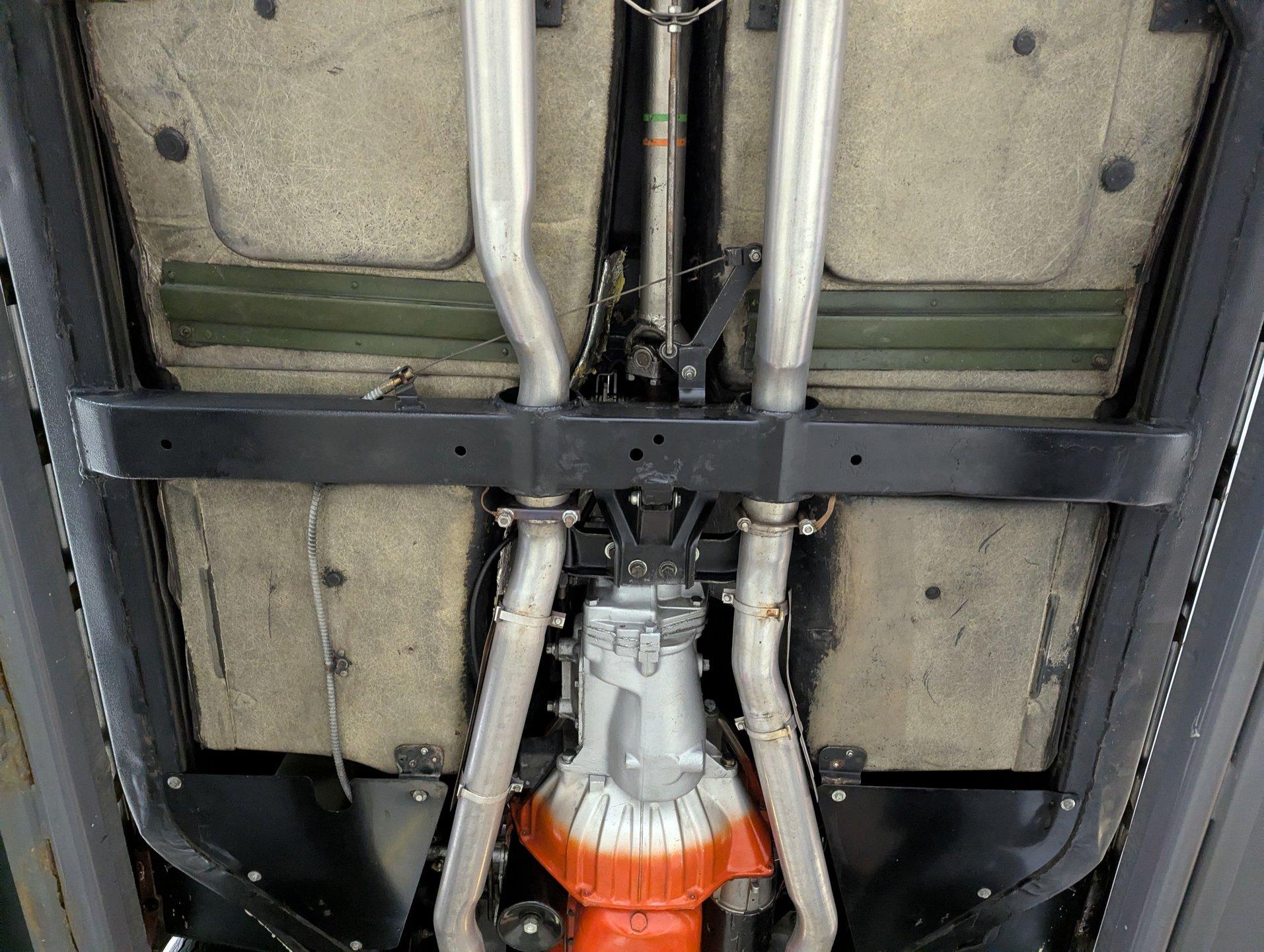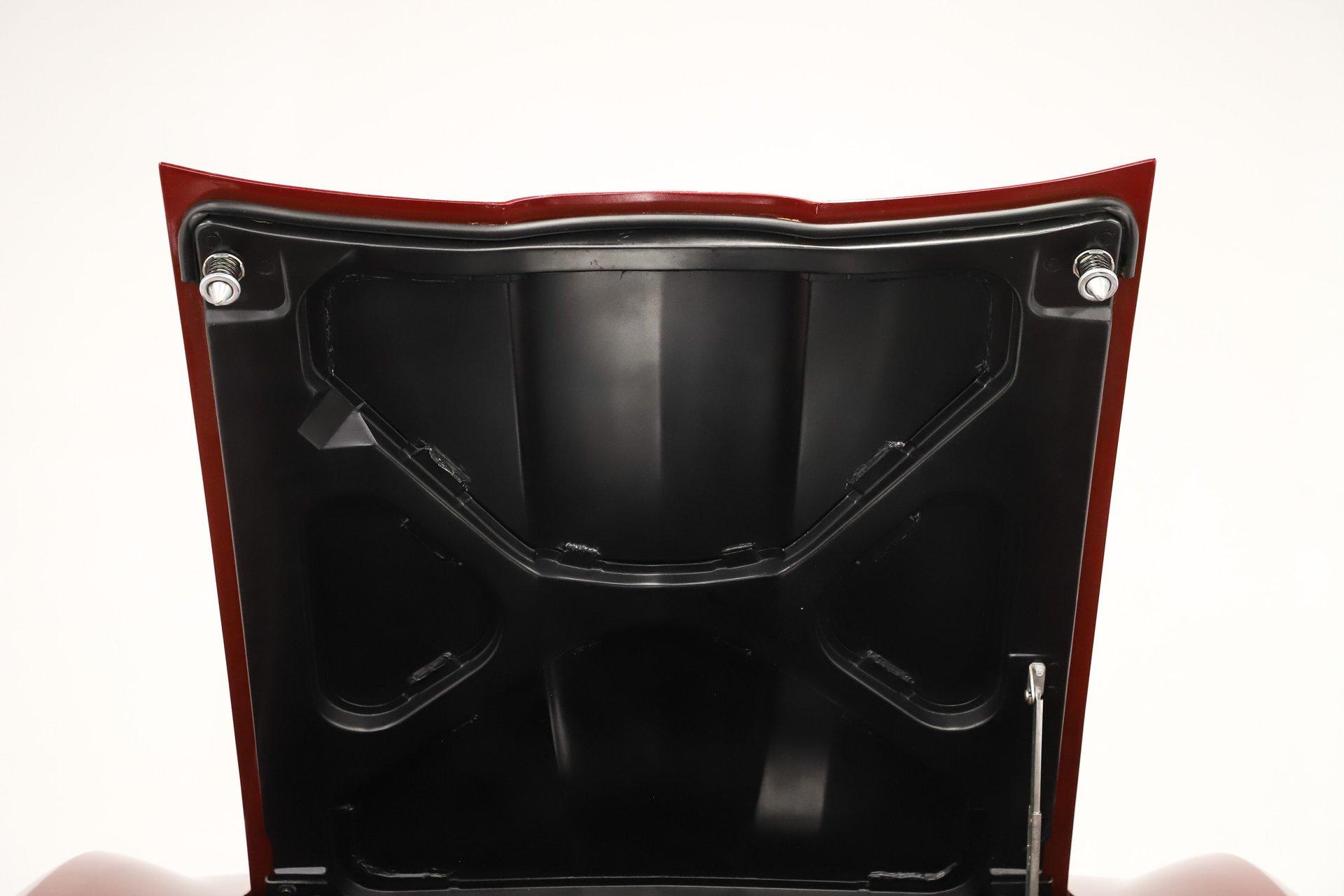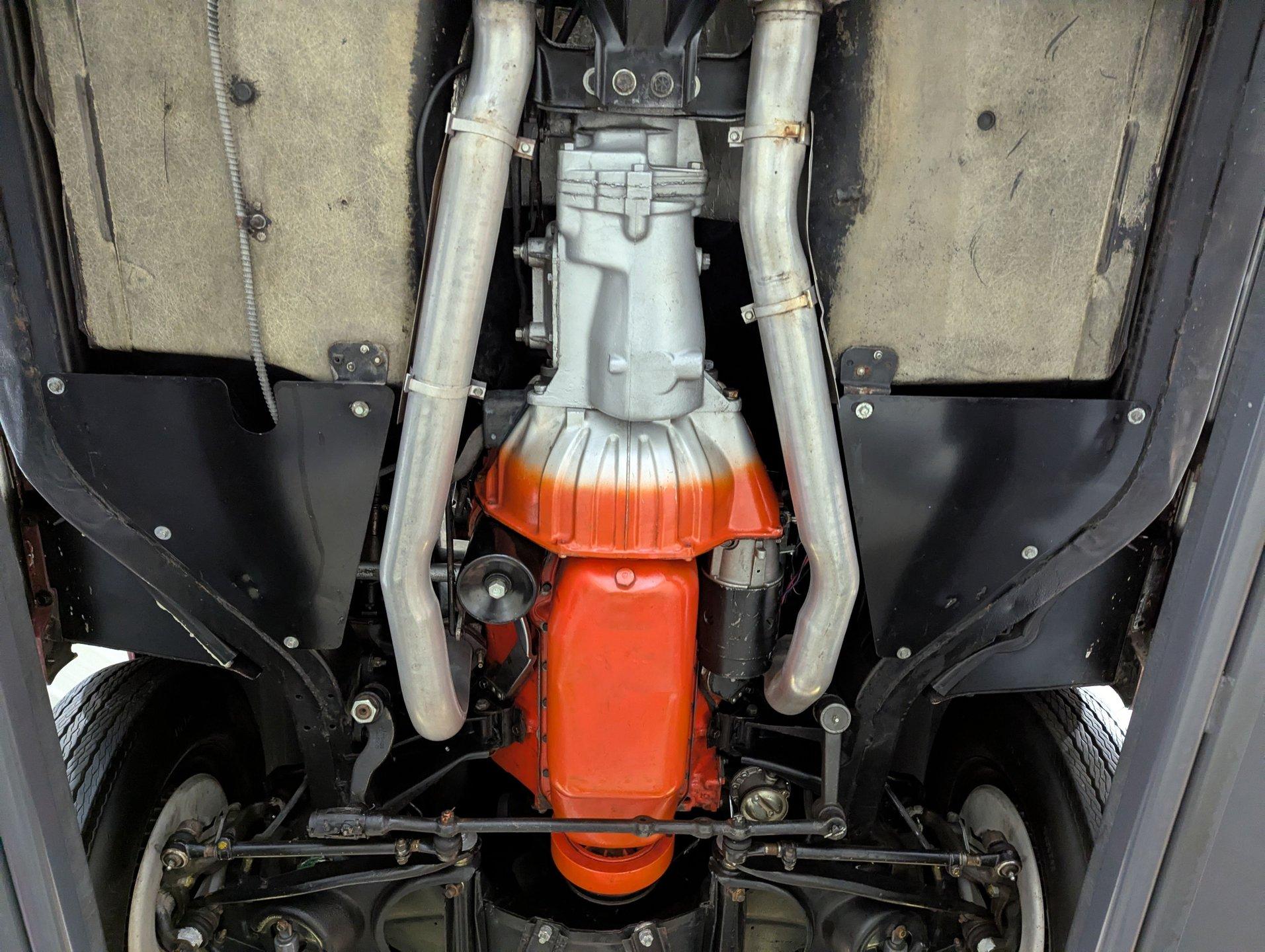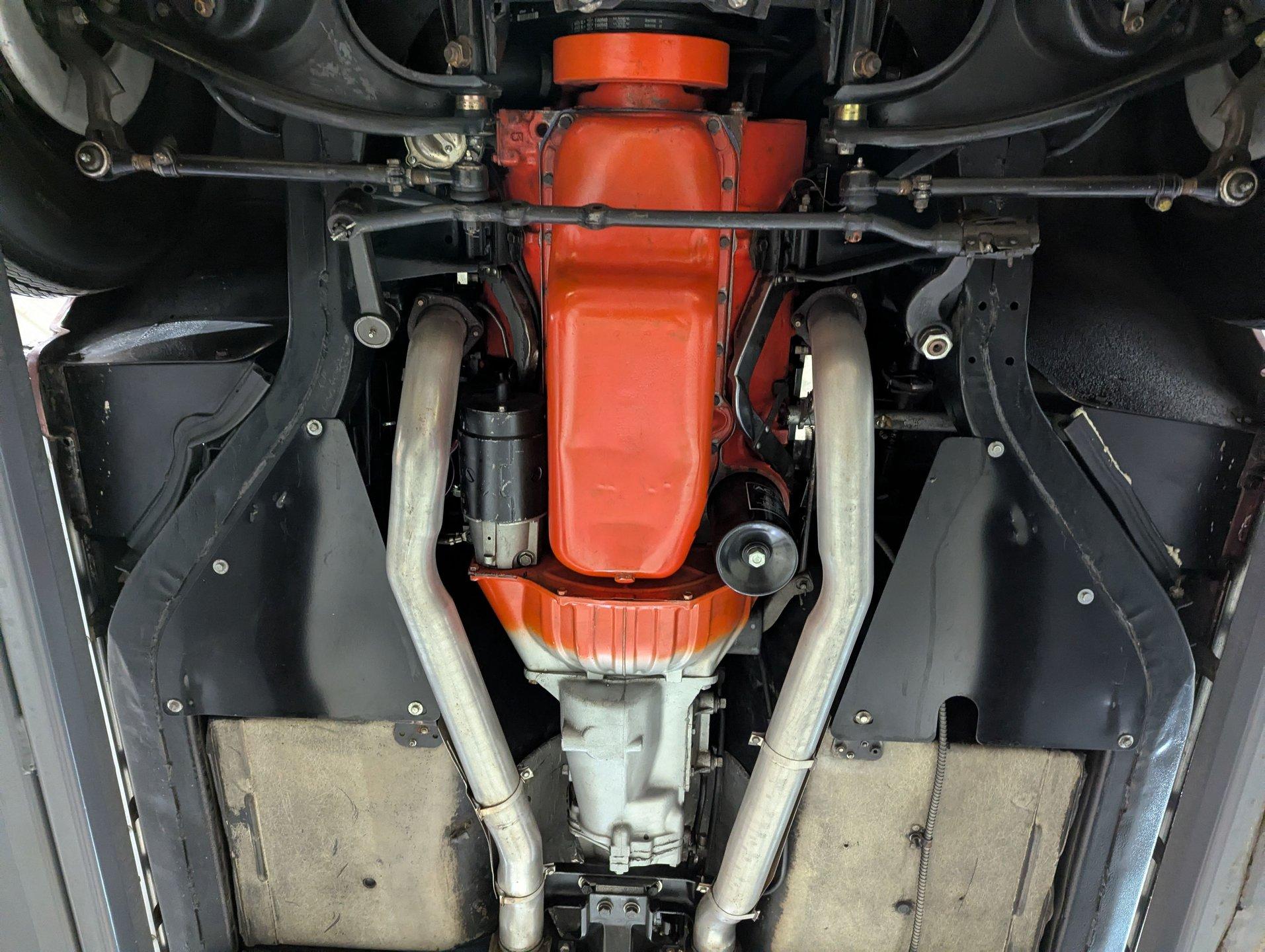 UNDERSIDE: The body was removed from the frame, and every component was rebuilt and restored to factory specifications. The fully independent front and rear suspension has been completely rebuilt and carefully detailed, along with the steering system. As the first year for four wheel disc brakes, the 1965 Chevrolet Corvette is especially desirable, and every part of the brake system has been replaced, including the lines and e-brake assembly. It features a factory correct reproduction off-road exhaust, with mufflers properly stamped “off-road,” giving the car a deeper, more muscular tone. Looking up at the engine, it is spotless in correct Chevy Orange and fitted with the proper canister oil filter, correct starter, and lower ignition shielding. The correctly numbered Muncie 4-speed trans has been properly rebuilt and detailed, while the restored driveshaft leads to the correctly dated Positraction rear end with 3.70 gears. The frame and chassis components wear a smooth semi-gloss finish, and the fiberglass floors are pristine in their natural raw state, just as they should be. Even the spare tire carrier is complete, right down to the original lock.