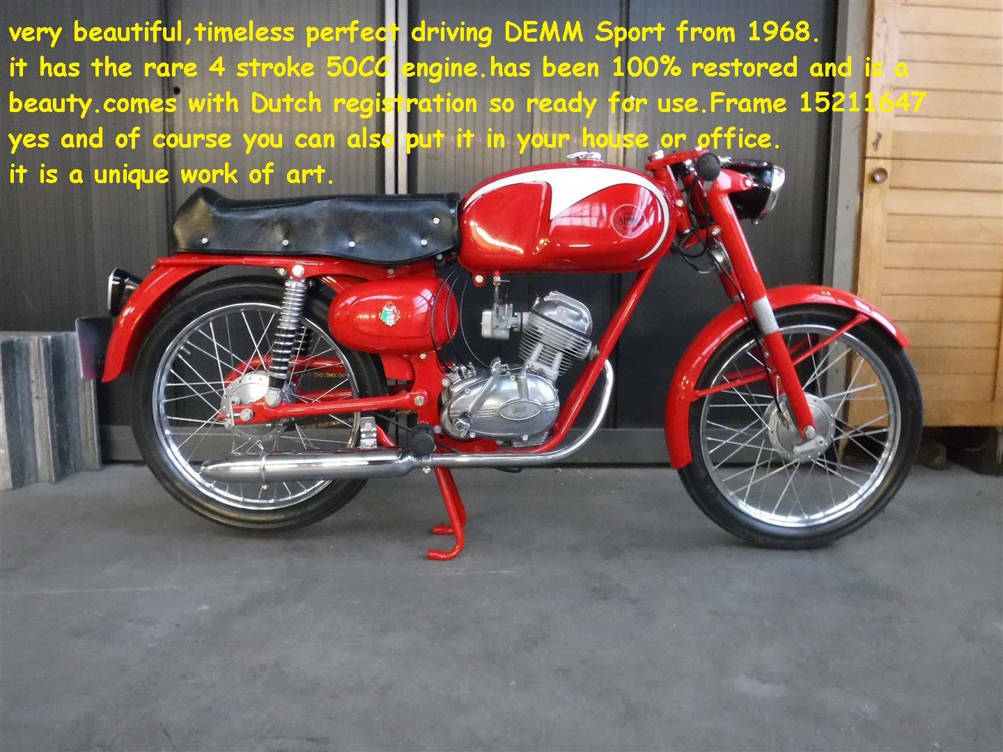 Very beautiful, perfect driving DEMM Sport from 1968: a rare 4 stroke 50CC engine.Has been 100% restored and is a beauty.Comes with Dutch registration so ready for use.Yes and off course you can also put it in the room or office, this unique work of art. Biggest choice in REAL Classic Cars in "the Stolze Collection" with more than 450 cars in stock ! From a project to perfect .