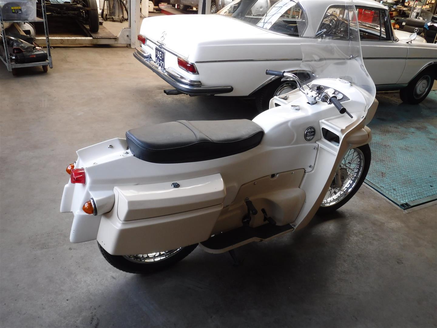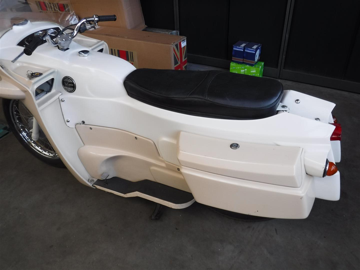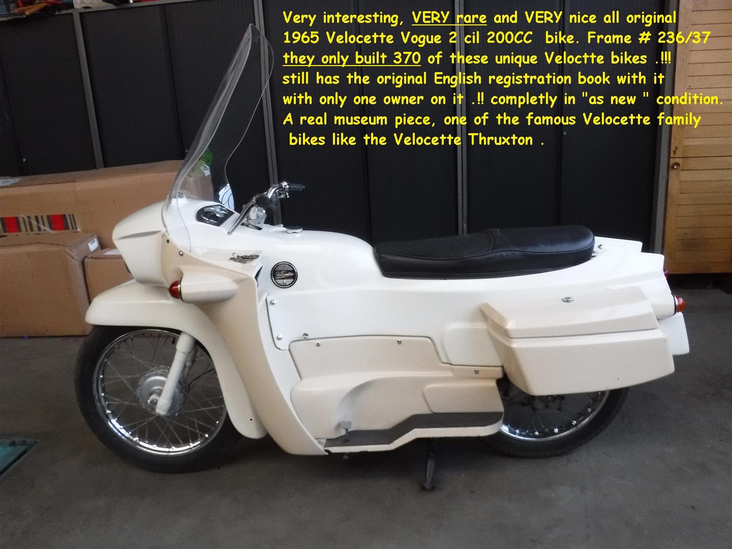 Very interesting, VERY rare and VERY nice all original 1965 Velocette Vogue 2 cil 200CC bike. Frame # 236/37. Only 370 of these unique Veloctte bikes were build ! Still has the original English registration book with it with only one owner in it. Completly in "as new " condition.A real museum piece, one of the famous Velocette family bikes like the Velocette Thruxton. Biggest choice in REAL Classic Cars in "the Stolze Collection" with more than 450 cars in stock ! From a project to perfect .