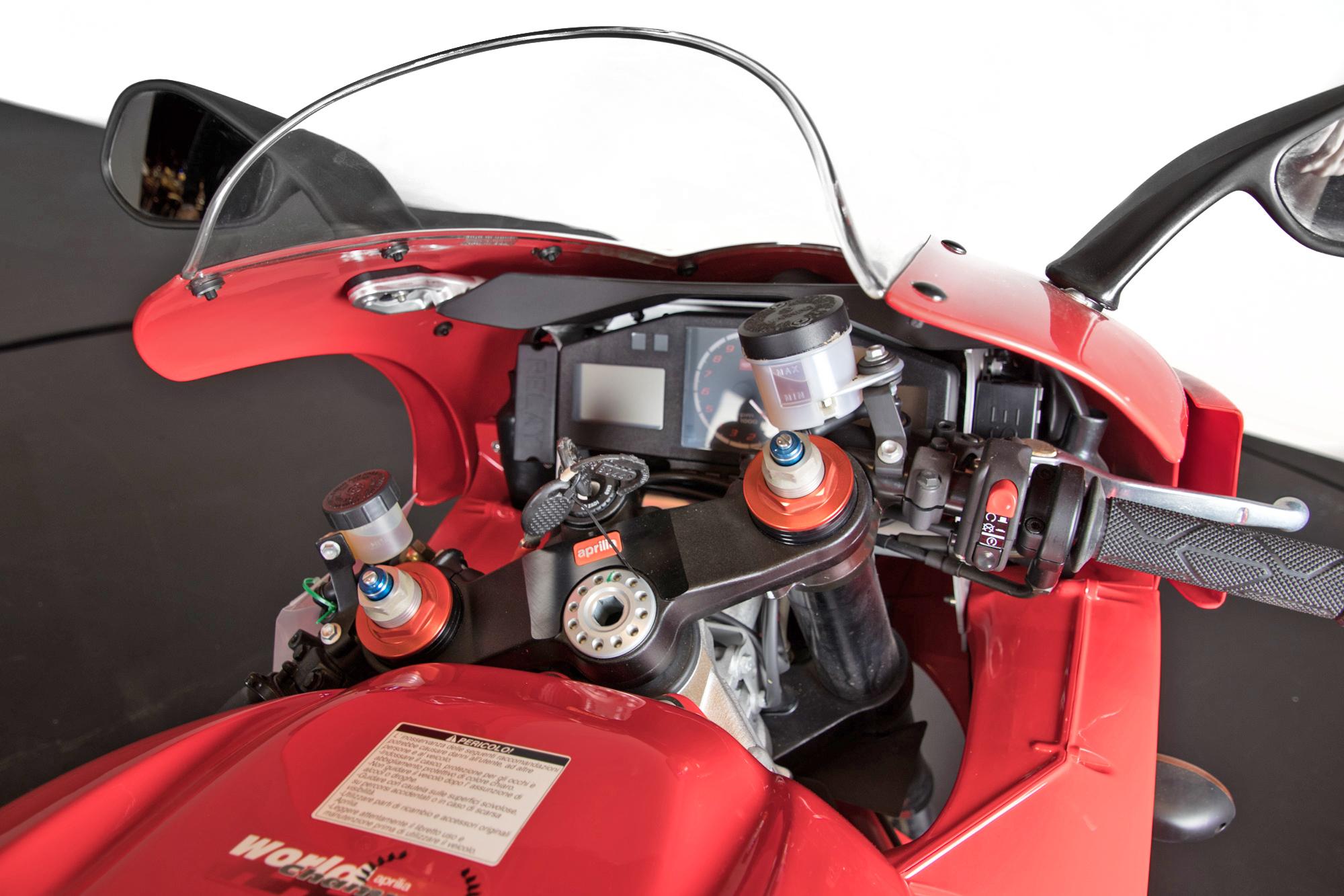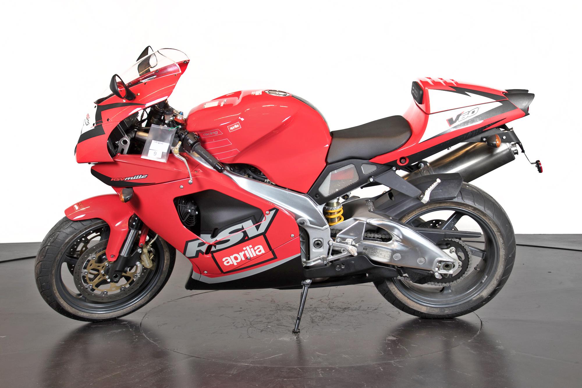 "RSV 1000 is Aprilia's first superbike: with the introduction of this model, the RS sports range is complete (50, 125, 250). It is a very innovative project, starting with the 60° V-twin engine, which is highly usable thanks to many technical refinements. 128 HP, 195 kg. Advanced chassis and very distinctive shapes: the very large (and much-debated) fairing offers complete protection to the rider. One of the many highlights of this model is the pneumatic clutch (PCC), which reduces the effort of using the control and simulates the function of a real slipper clutch."